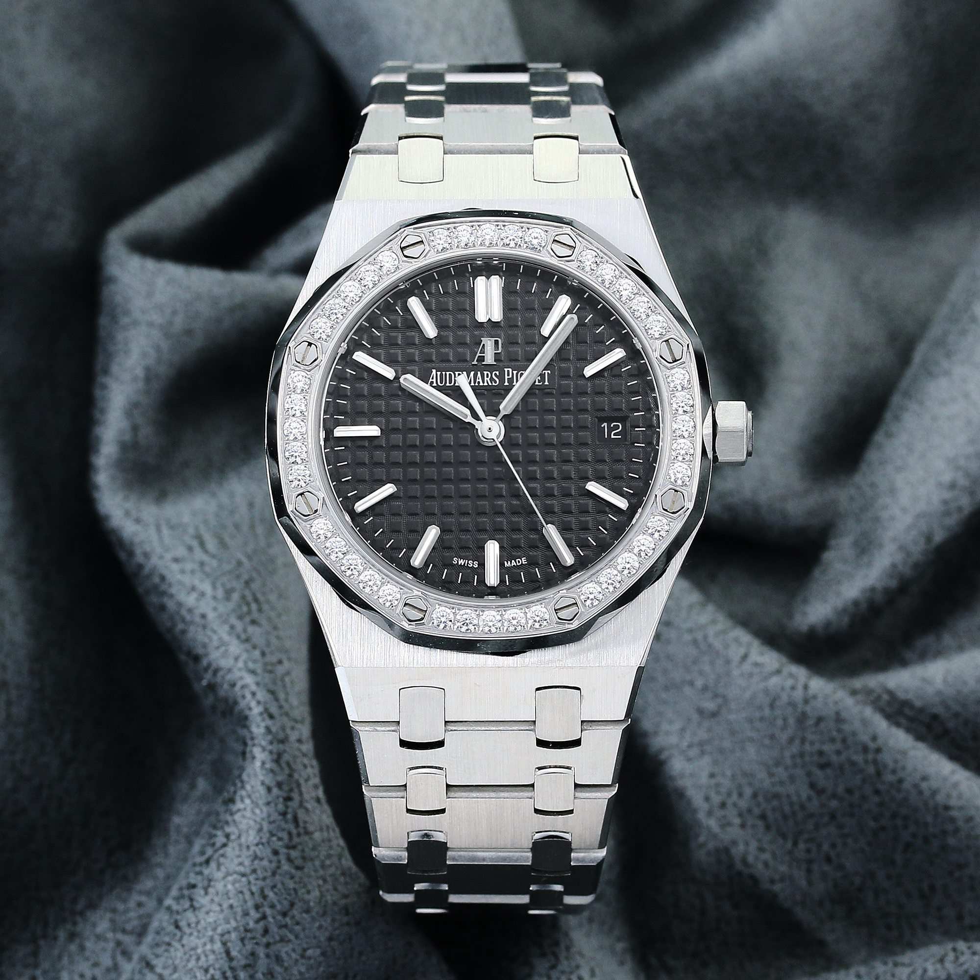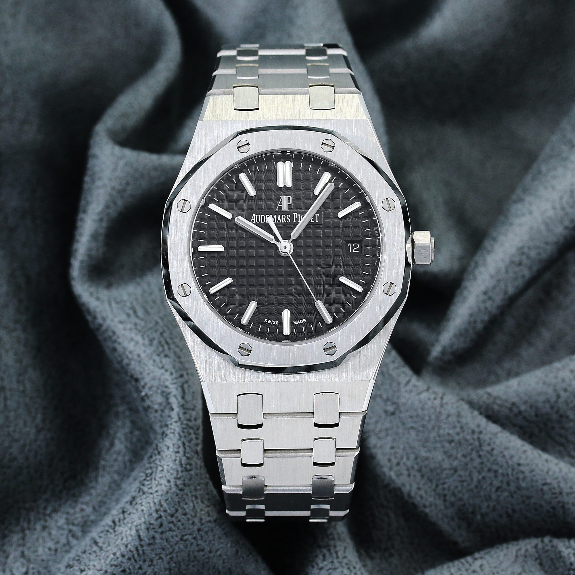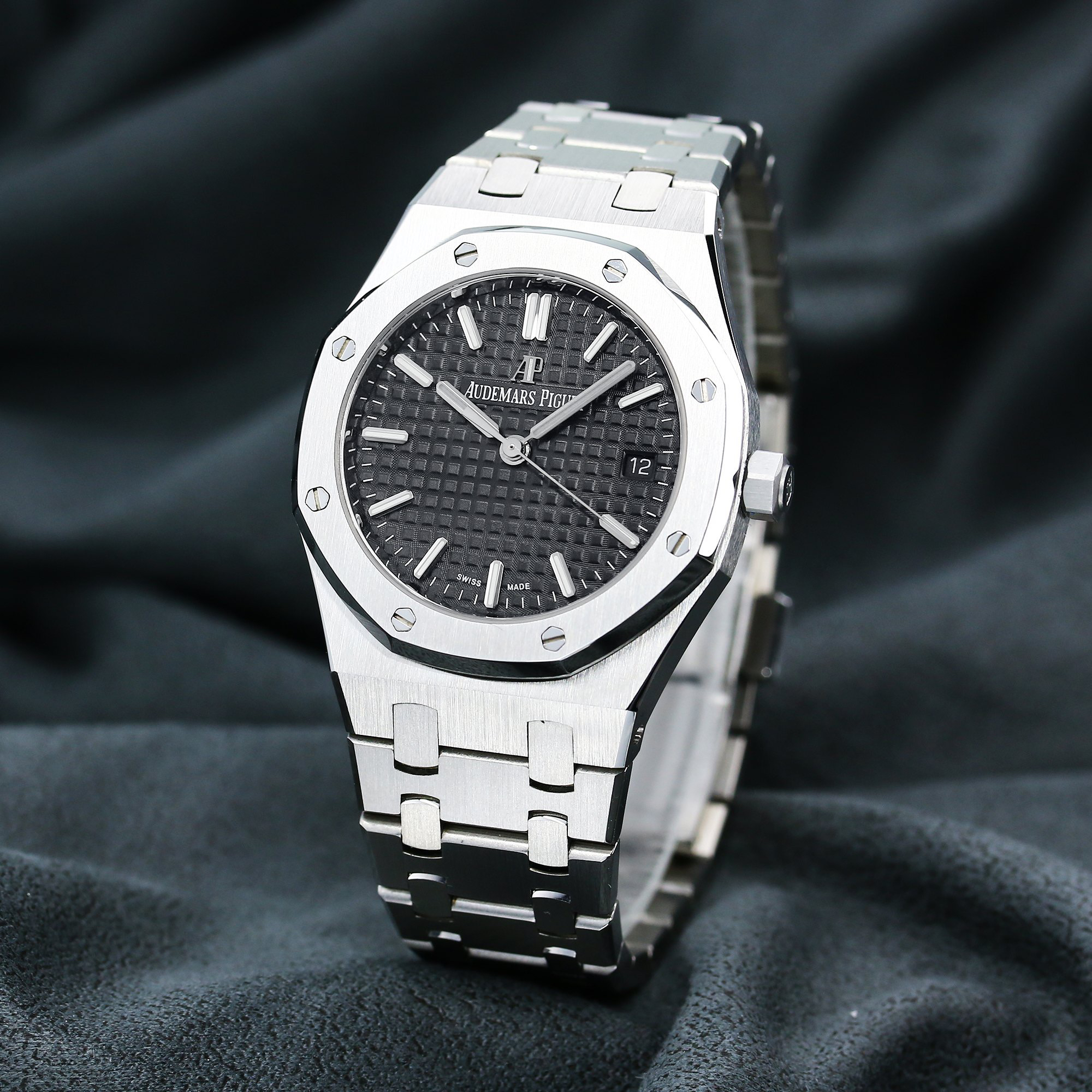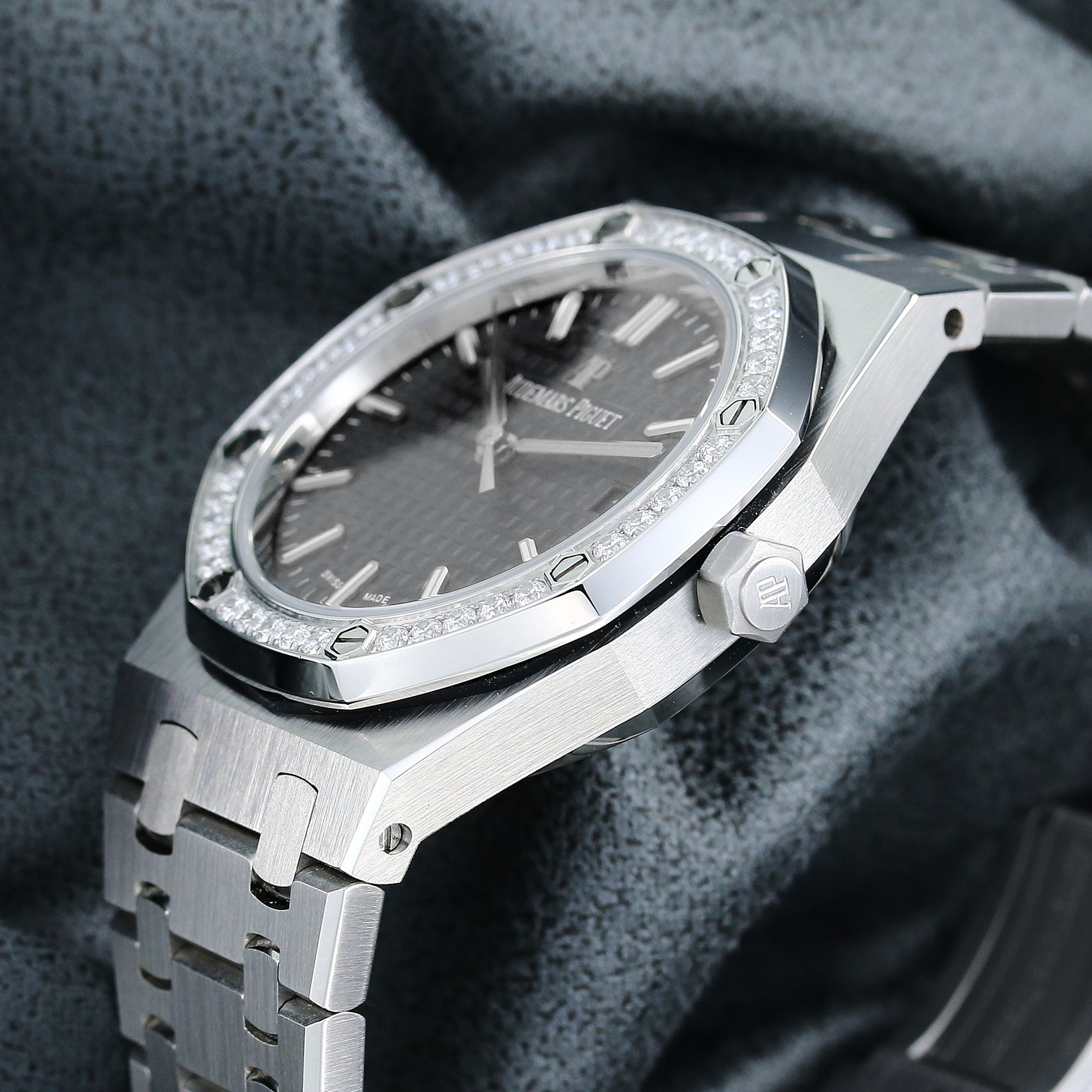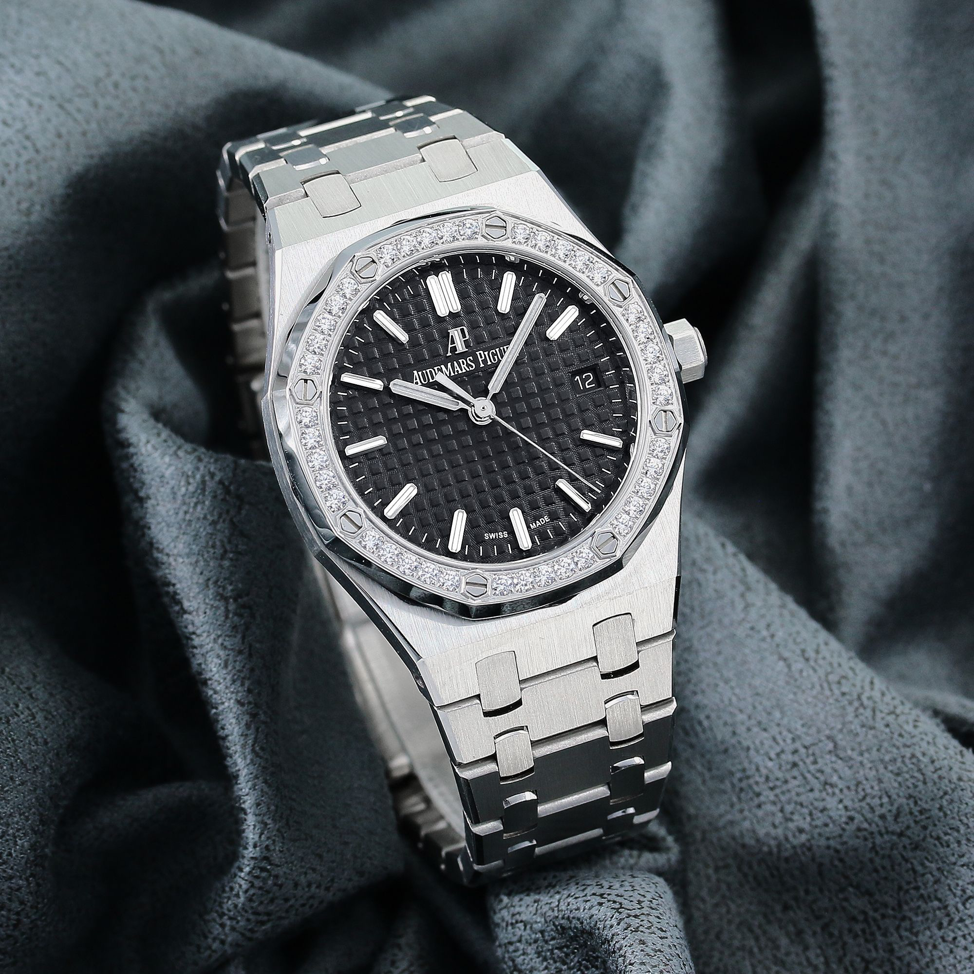 NOOB新品 直径34毫米的皇家橡树系列自动上链腕表,以全新表壳尺寸再现这一传奇系列的前卫风格,并为纤细手腕的佩戴者演绎出别样的优雅格调。全新腕表均搭载9015改Calibre 5800自动上链机芯,采用为该款式特别设计的玫瑰金金自动摆陀。