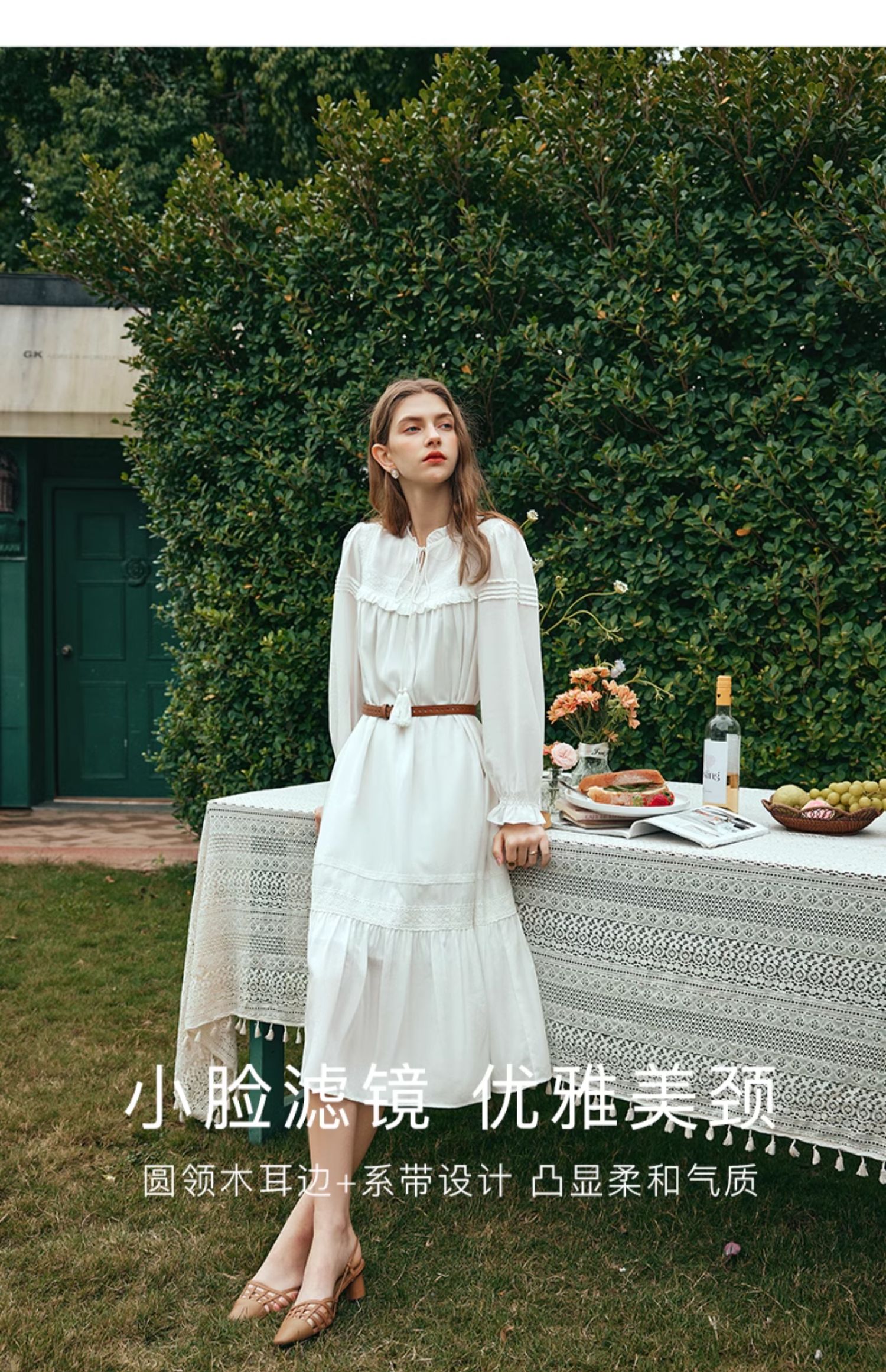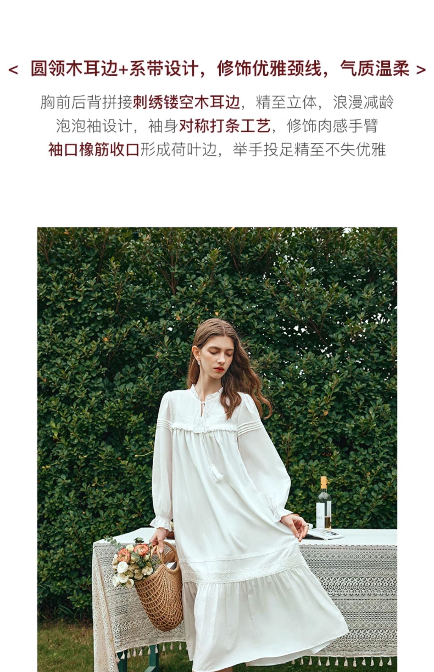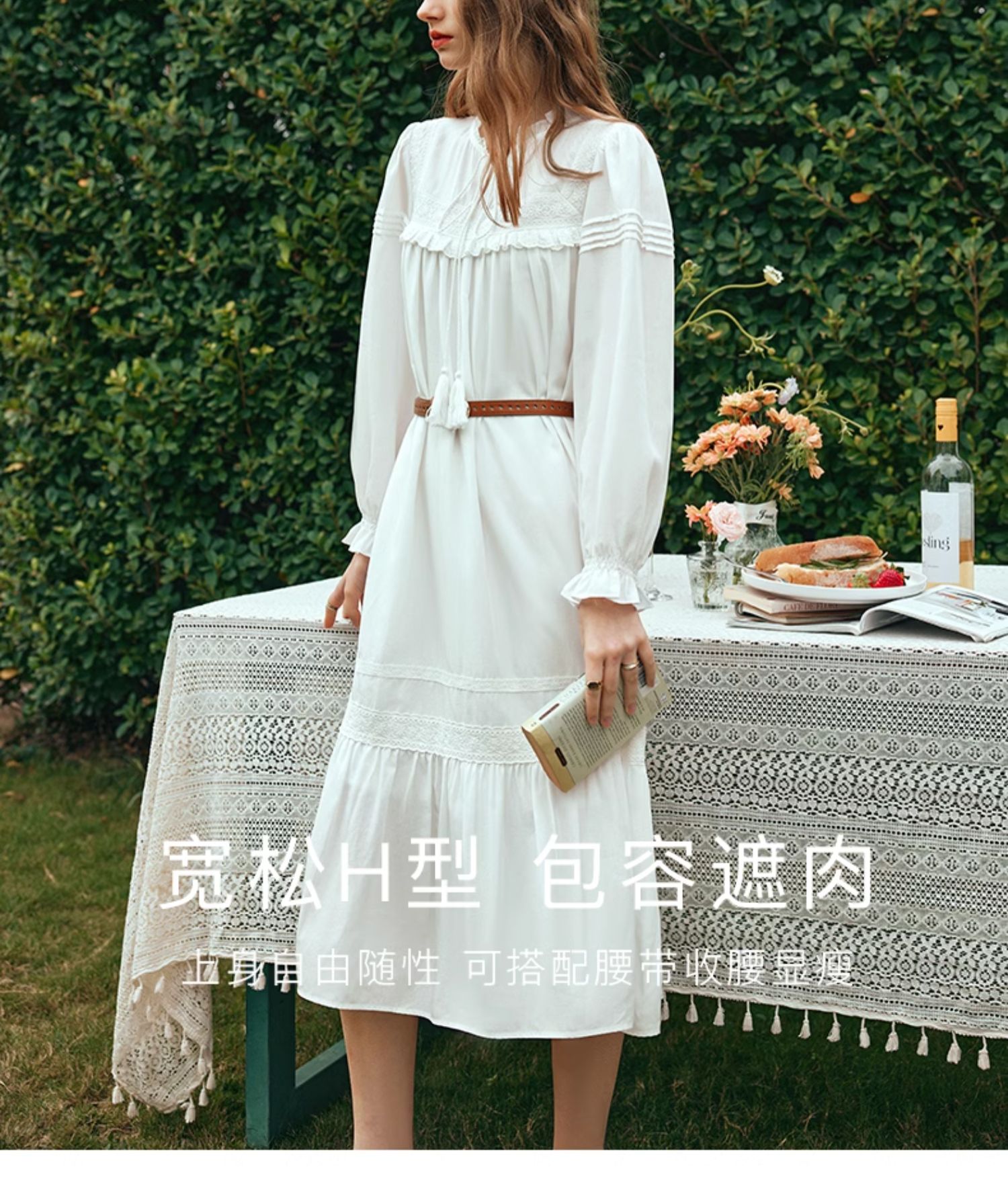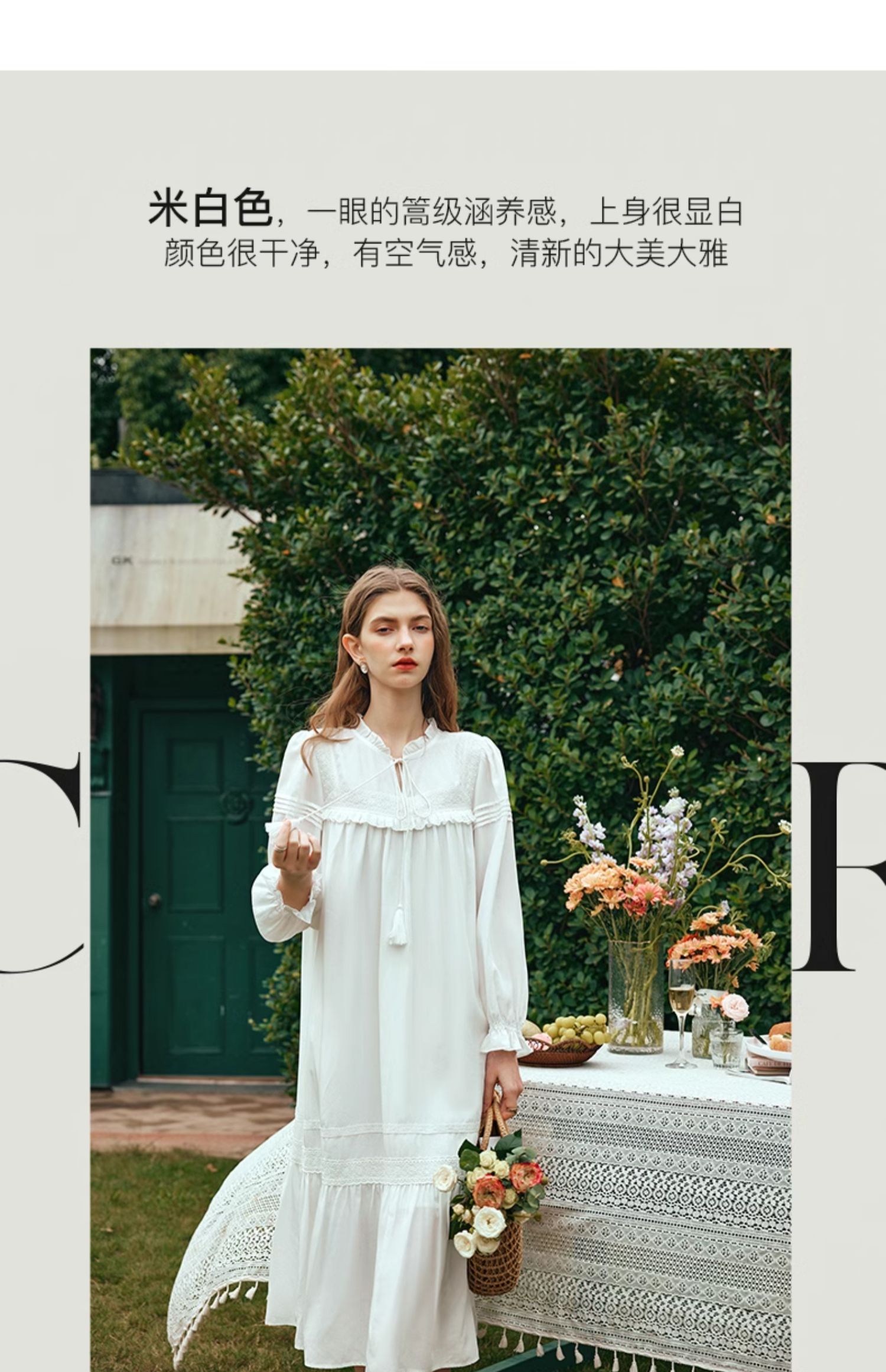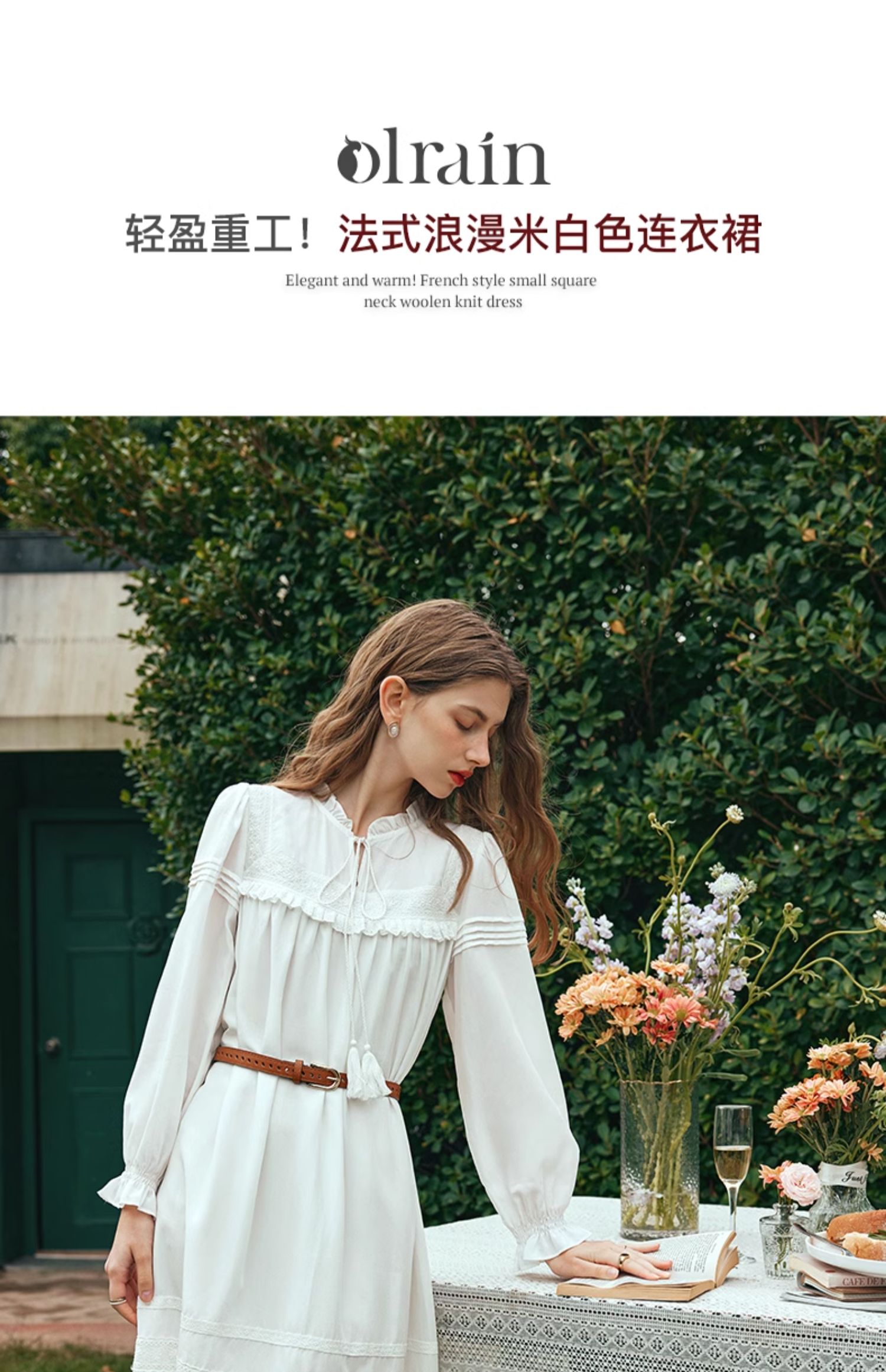 OLrain欧芮儿法式米白色连衣裙女早春2024新款气质刺绣蕾丝边长裙