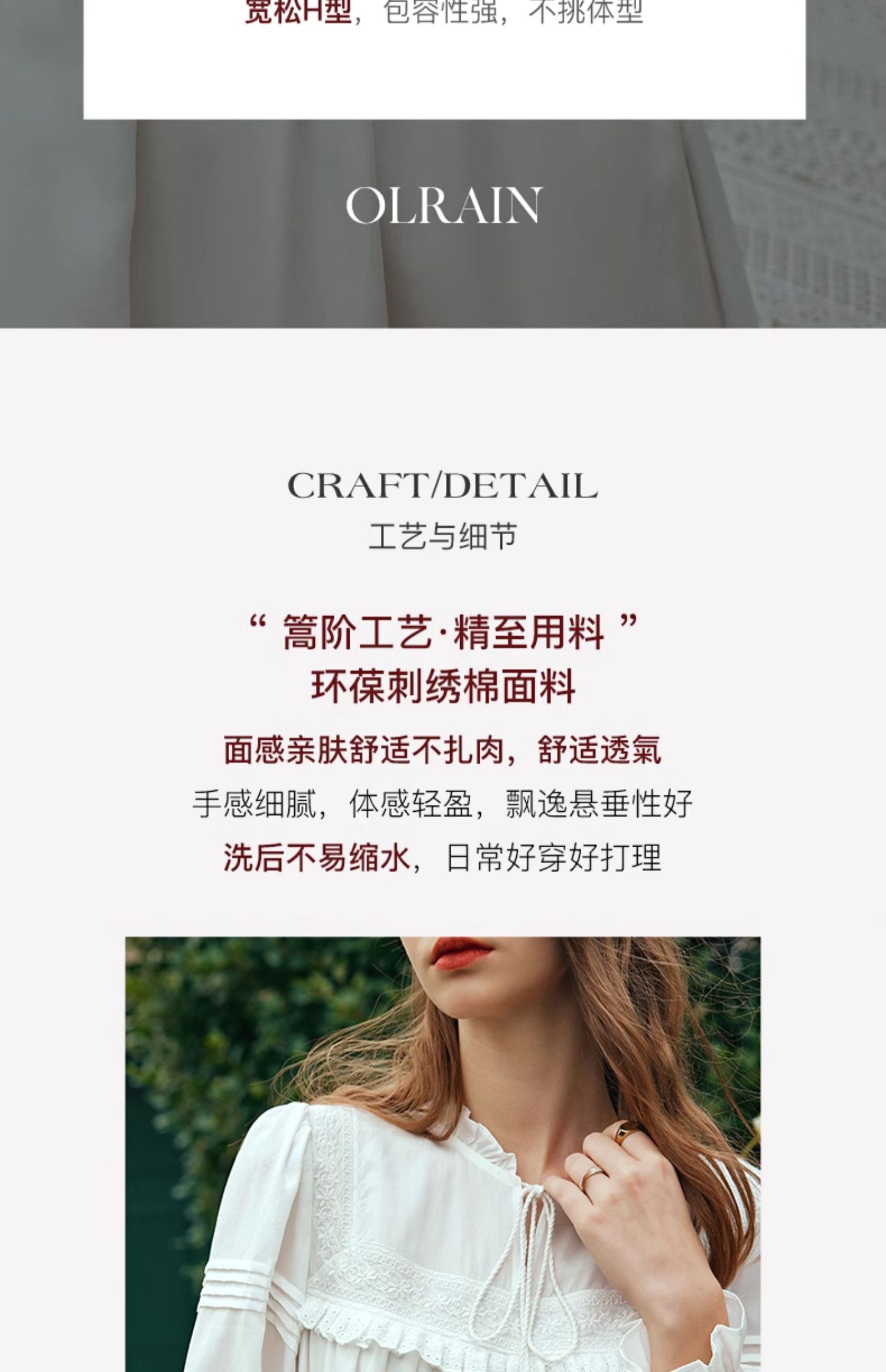 - “精致”是欧芮儿olrain品牌文化的核心,欧芮儿认为,精致的女人,不但要外在动人,更要内在迷人,内外兼修,有魅力、有气质、有内涵,自信而不自傲,优雅而不矫揉,自有万种风情而不轻浮,更不故作矜持。