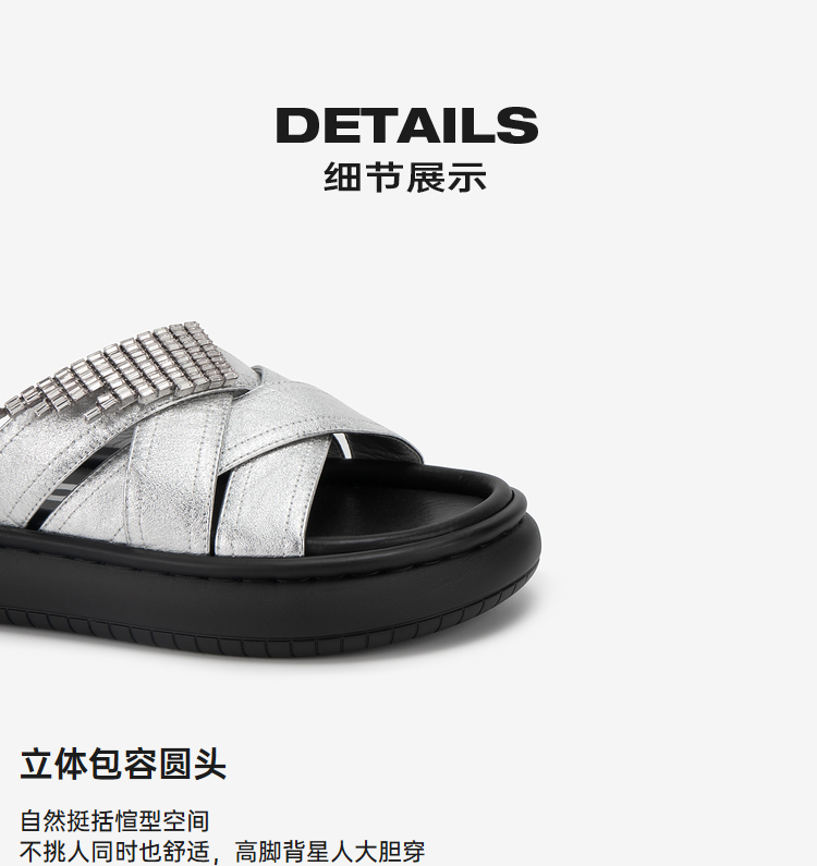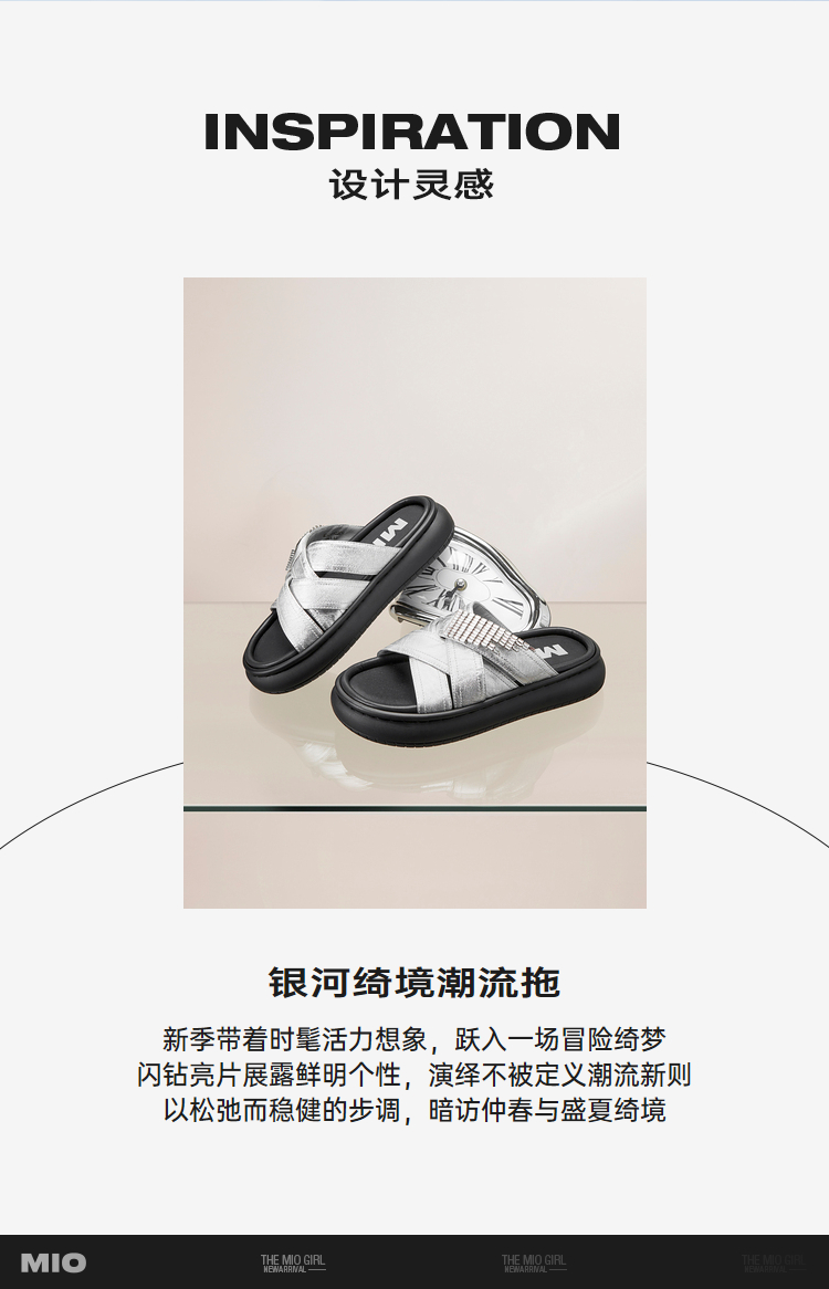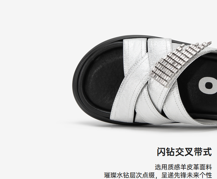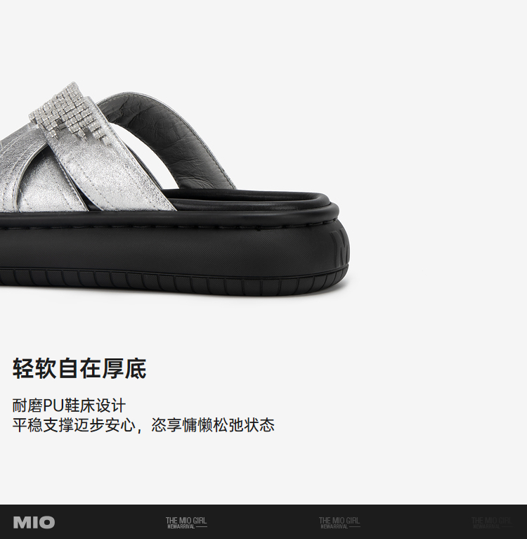 MIO米奥夏季中跟潮流拖鞋闪钻交叉带式羊皮革慵懒一字拖女M243131432