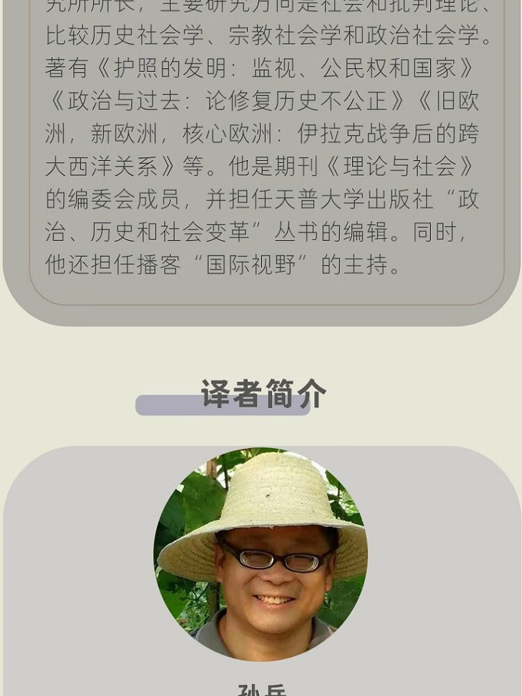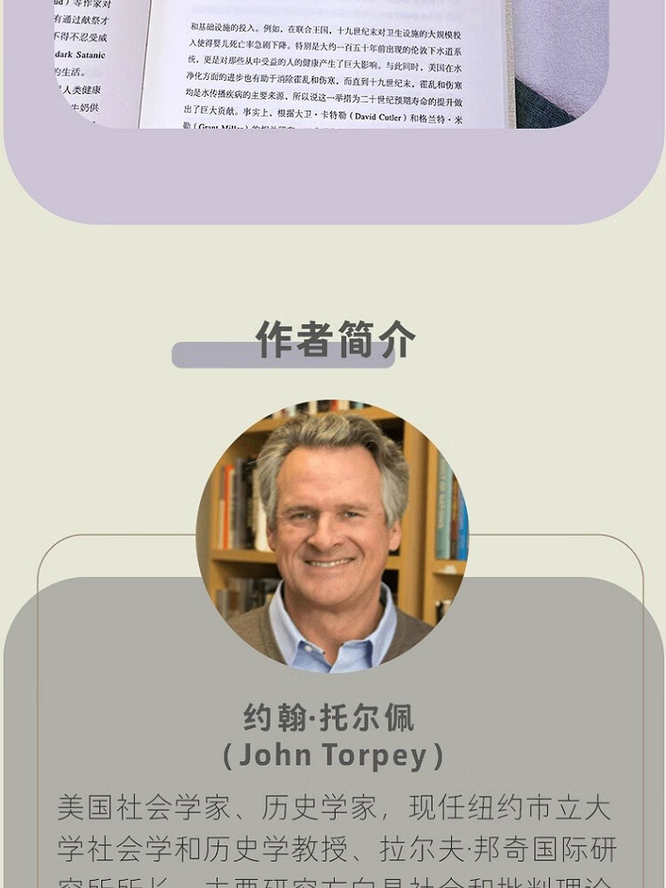 约翰·托尔佩(John Torpey),美国社会学家、历史学家,现任纽约市立大学社会学和历史学教授、拉尔夫·邦奇国际研究所所长,主要研究方向是社会和批判理论、比较历史社会学、宗教社会学和政治社会学。著有《护照的发明:监视、公民权和国家》《政治与过去:论修复历史不公正》《旧欧洲,新欧洲,核心欧洲:伊拉克战争后的跨大西洋关系》等。他是期刊《理论与社会》的编委会成员,并担任天普大学出版社“政治、历史和社会变革”丛书的编辑。同时,他还担任播客“国际视野”的主持。