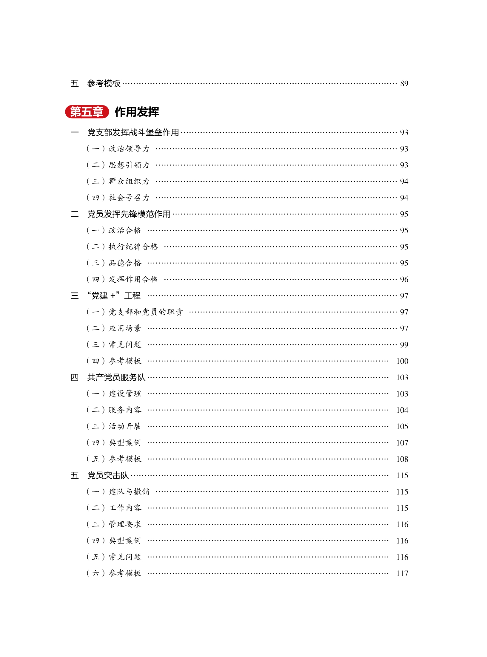 丛书包括《组织生活指引》《党员教育管理工作指引》《换届选举工作指引》《发展党员工作指引》《思想政治工作指引》五个分册,涵盖了党支部工作的主要内容和重点难点问题,突出规范性,以党内规章制度和中央最新要求为依据,吸收借鉴地方党委成熟经验做法,进一步细化工作标准和建设要求,对党支部标准化建设“怎么干”“如何干好”作出详细说明,确保党支部各项工作有章可循、有据可依;提升操作性,针对党支部的工作难点和薄弱环节,设计制作详细流程图,力求细化到每个步骤、明确到每个节点,通过图文并茂的形式使党支部工作更加便于操作执行;增强实用性,集中解答党支部实际工作中遇到的常见问题,并提供参考模板、成熟案例、操作范本等,内容具体、一目了然,着力减少党支部理解偏差,切实提升工作实效。