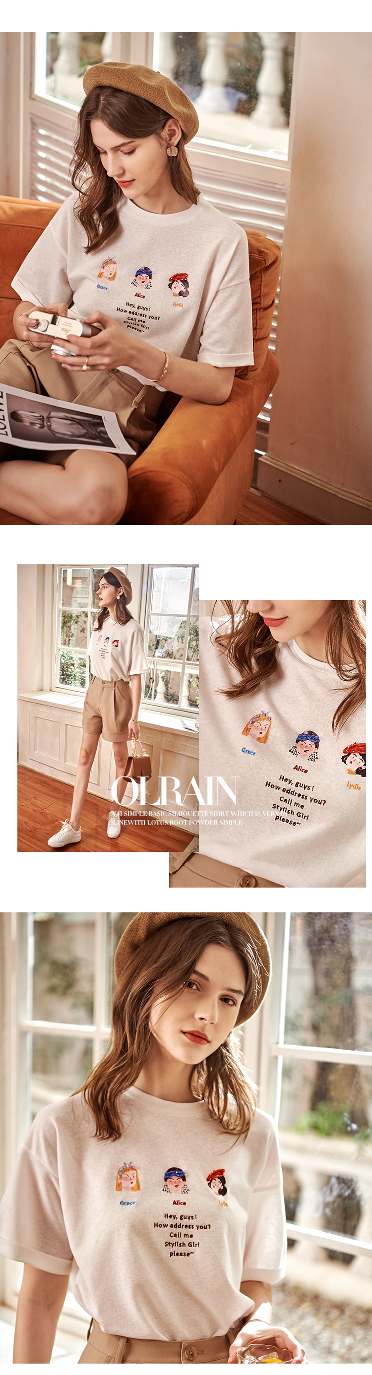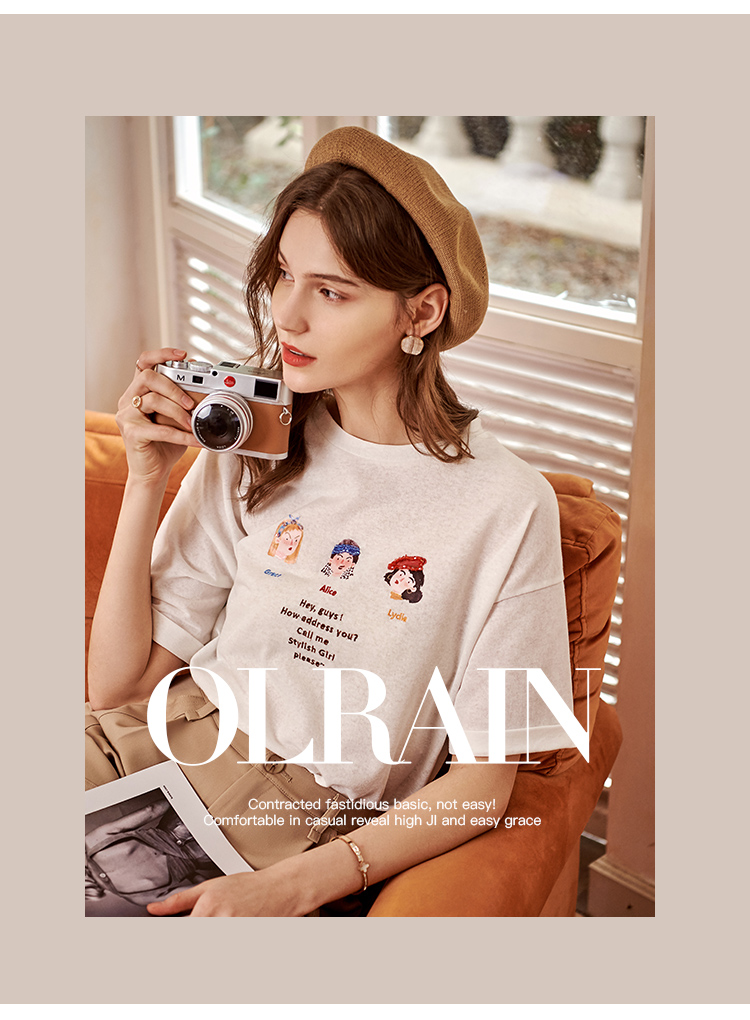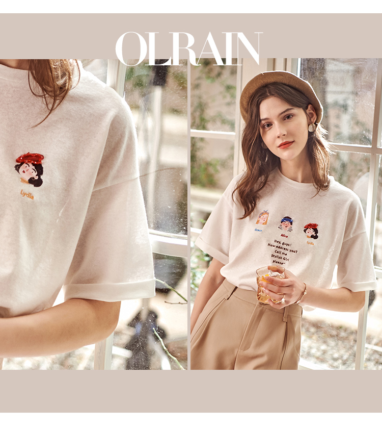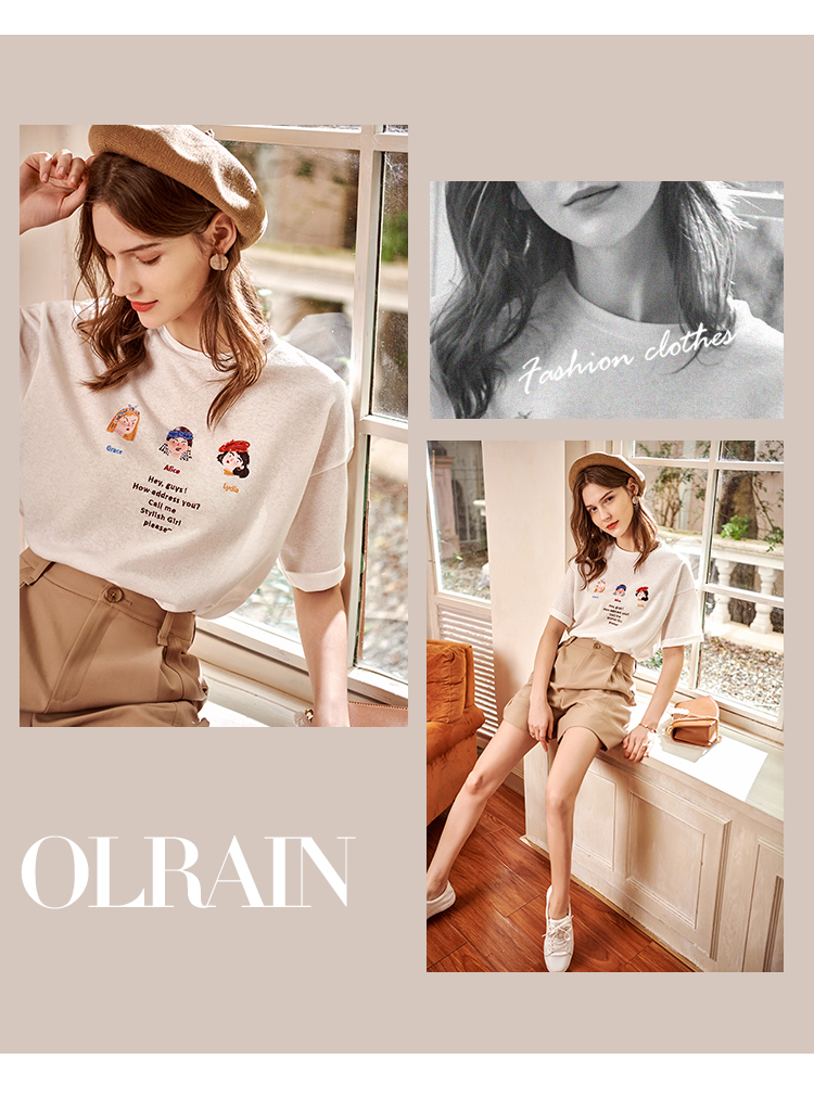 OLrain欧芮儿米白色套头连肩袖设计感上衣女夏季2025新款圆领T恤