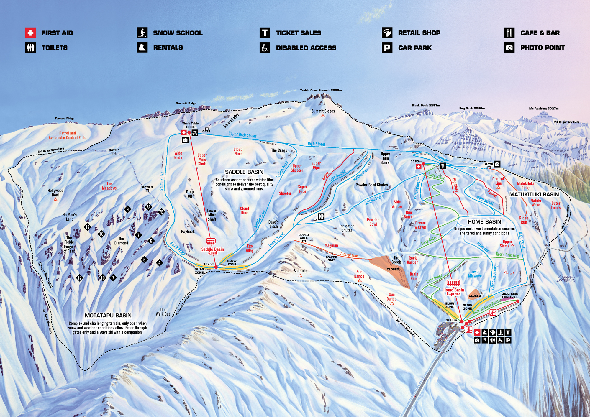 距皇后镇(Queenstown)仅 45 分钟车程,这里拥有完善的雪道网络以及各种等级的花式跳台,既有适合初学者的宽敞而平缓的坡道,也有适合专人的陡峭山坡,可提供 新西兰国内的荒野滑雪与滑雪体验。