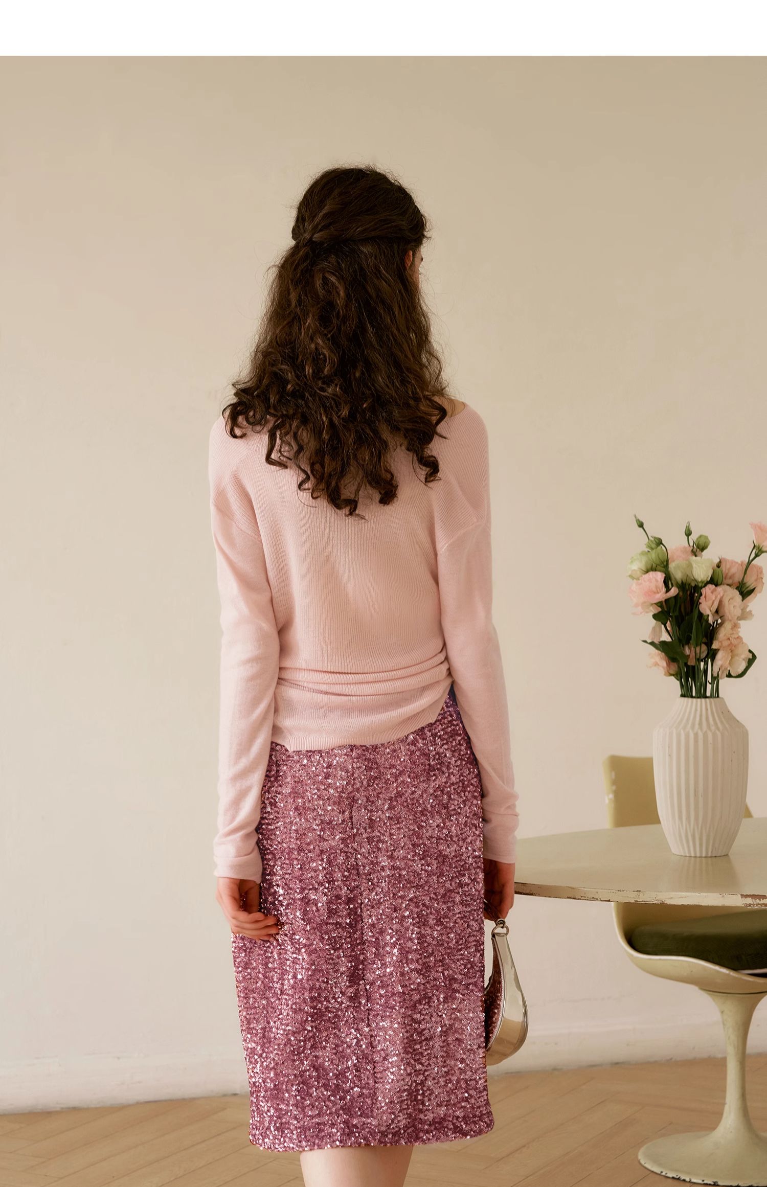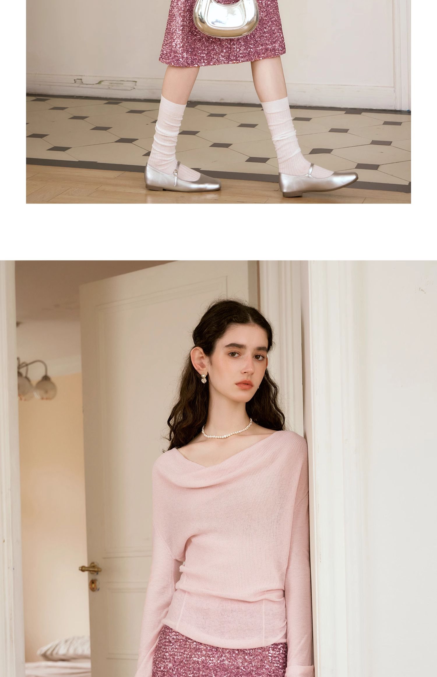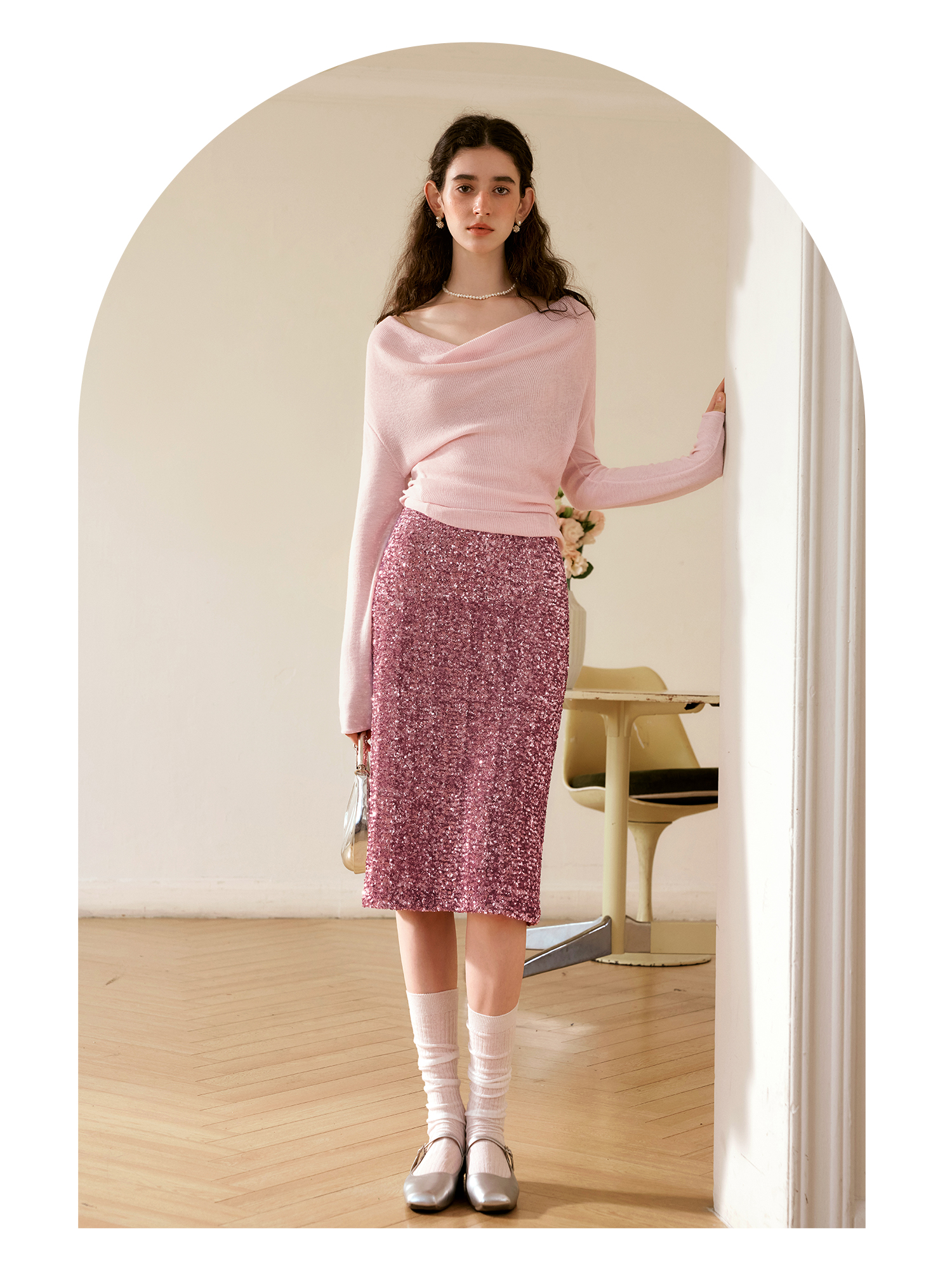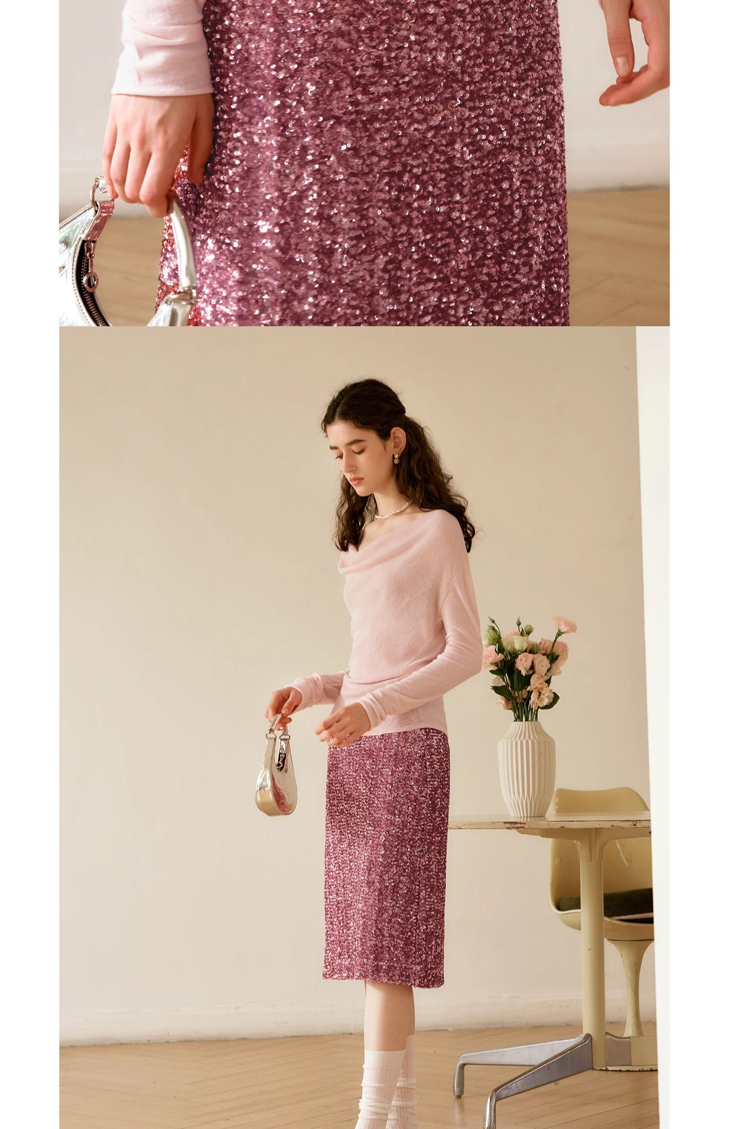 OLrain欧芮儿粉色半身裙女秋季2024年新款时尚流光珠片中长款半裙