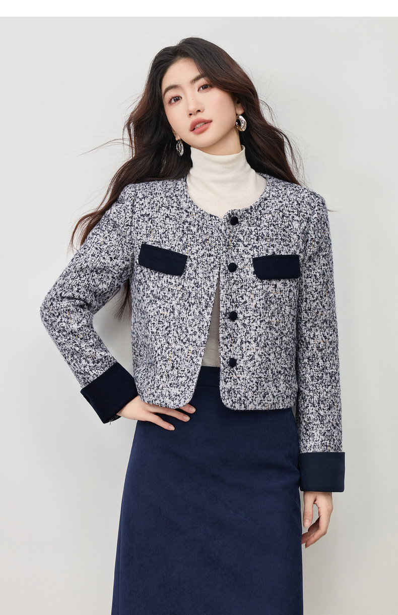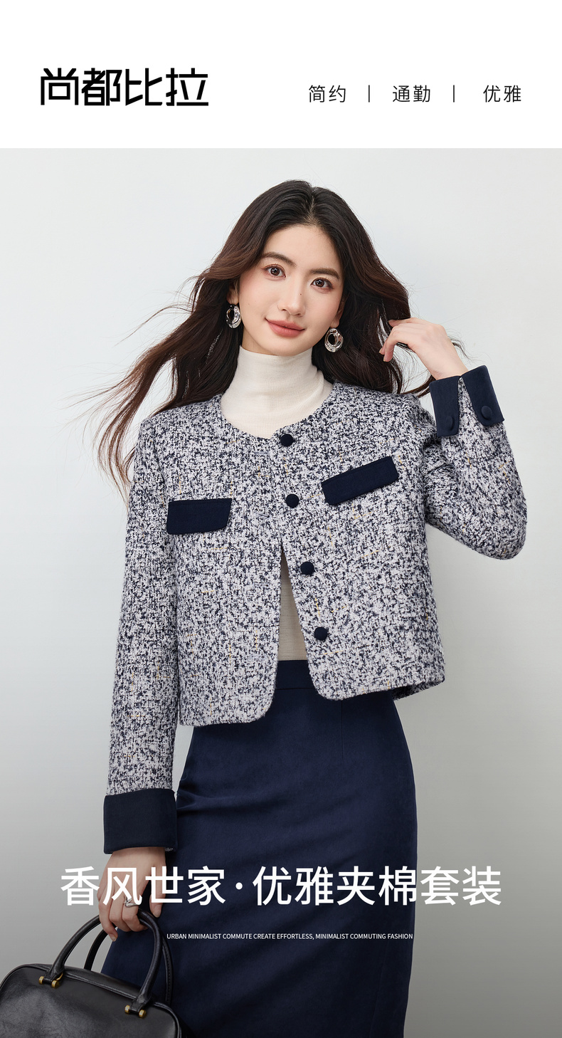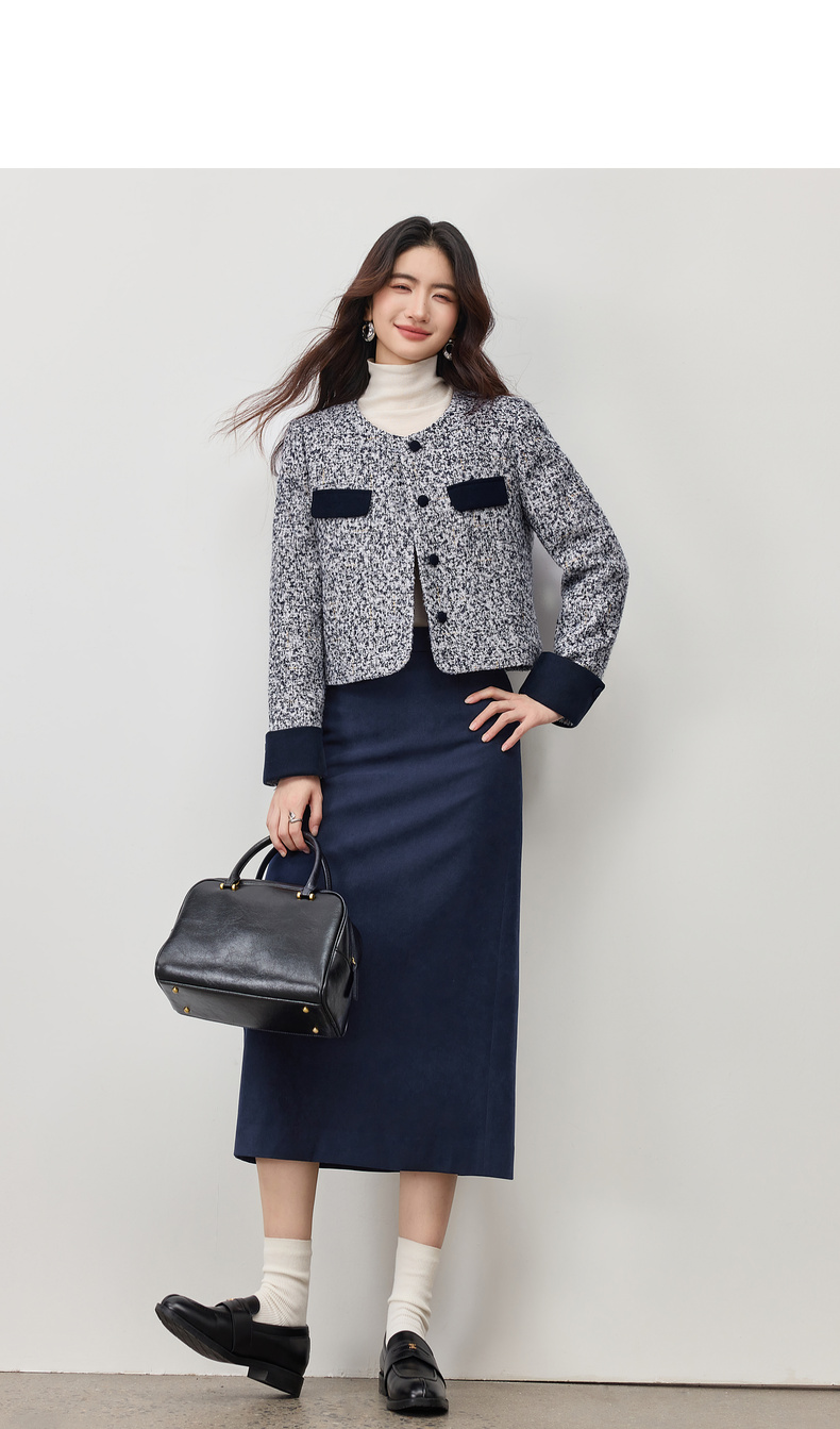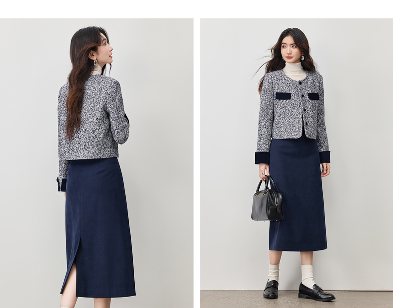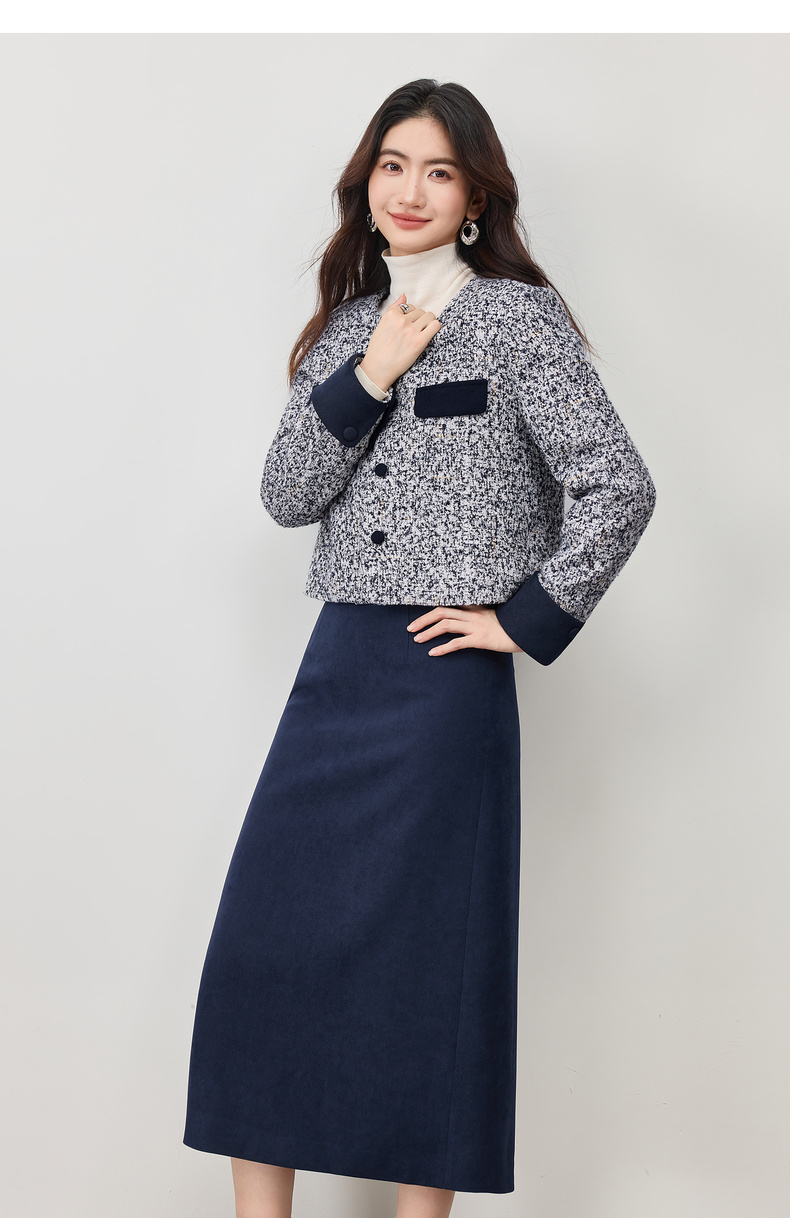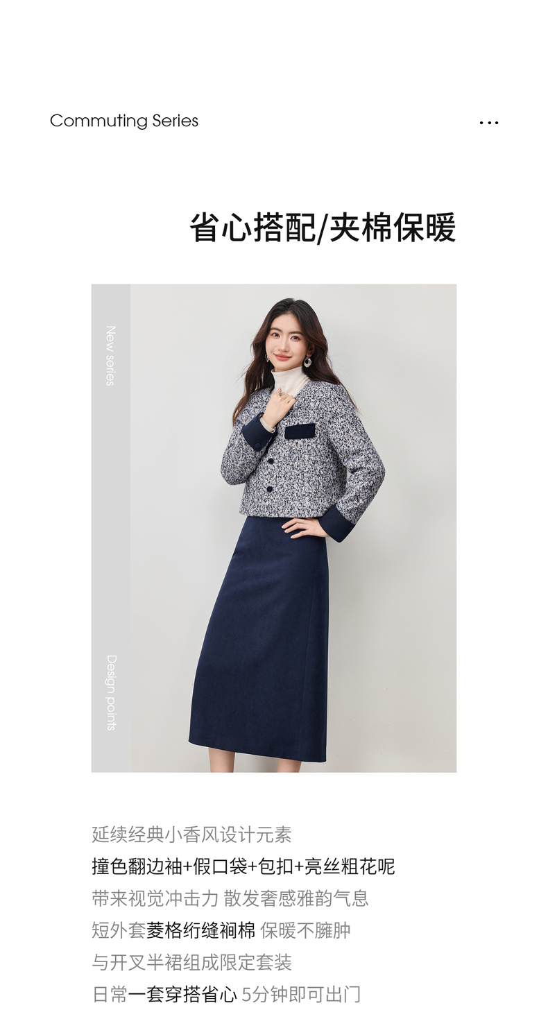 【内购】【免搭配套装】通勤圆领垫肩短款夹棉保暖外套&磨毛开叉A字半身裙-154ZA3552