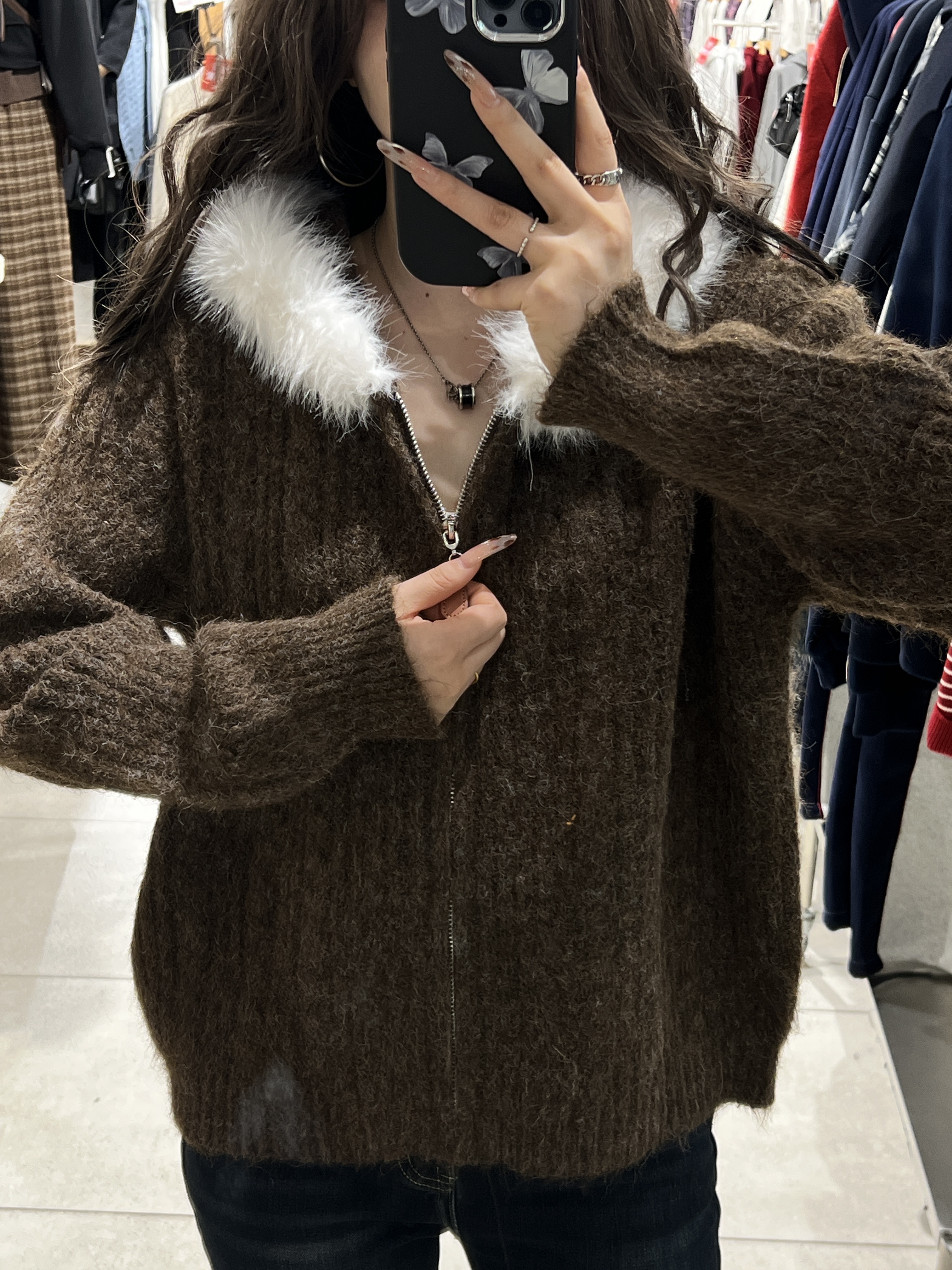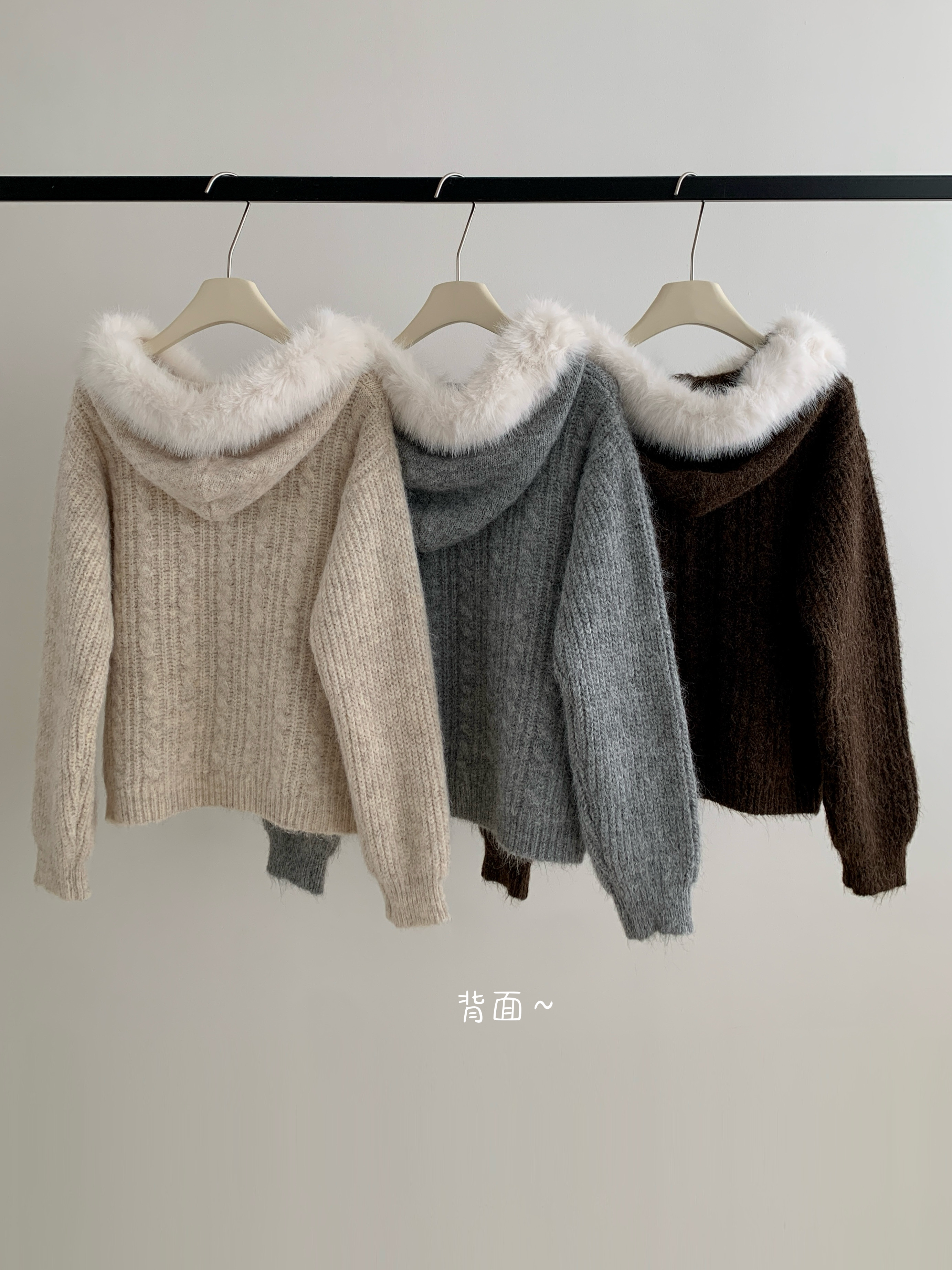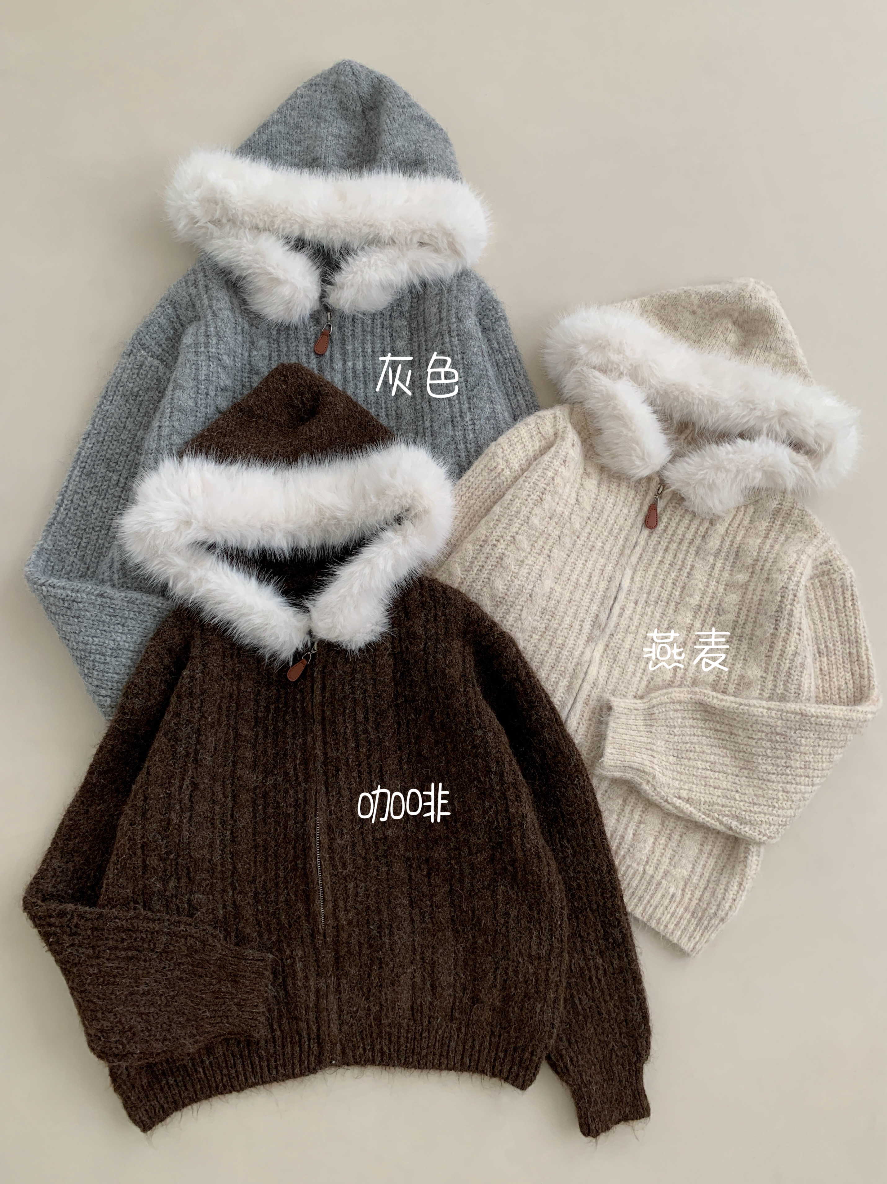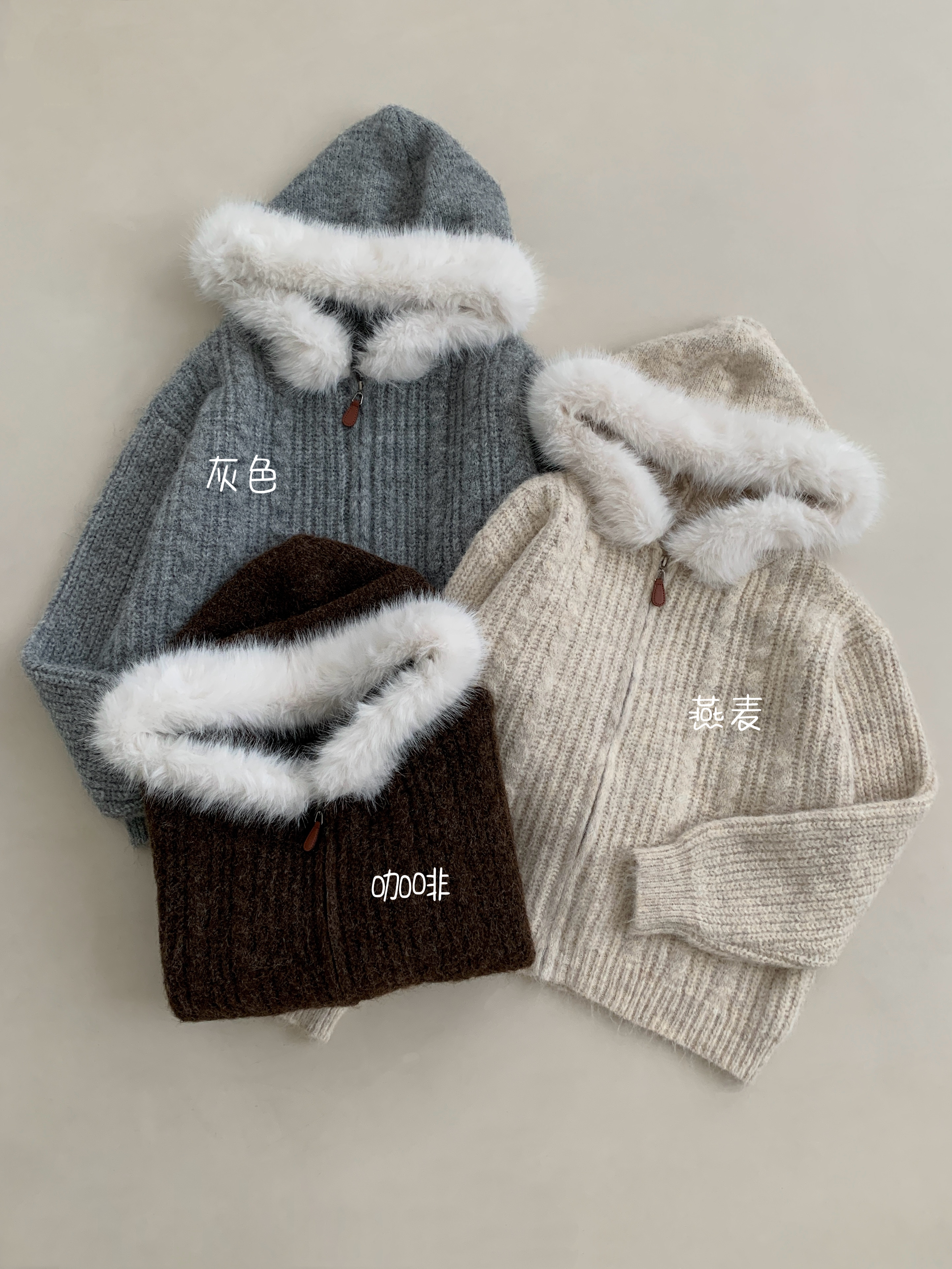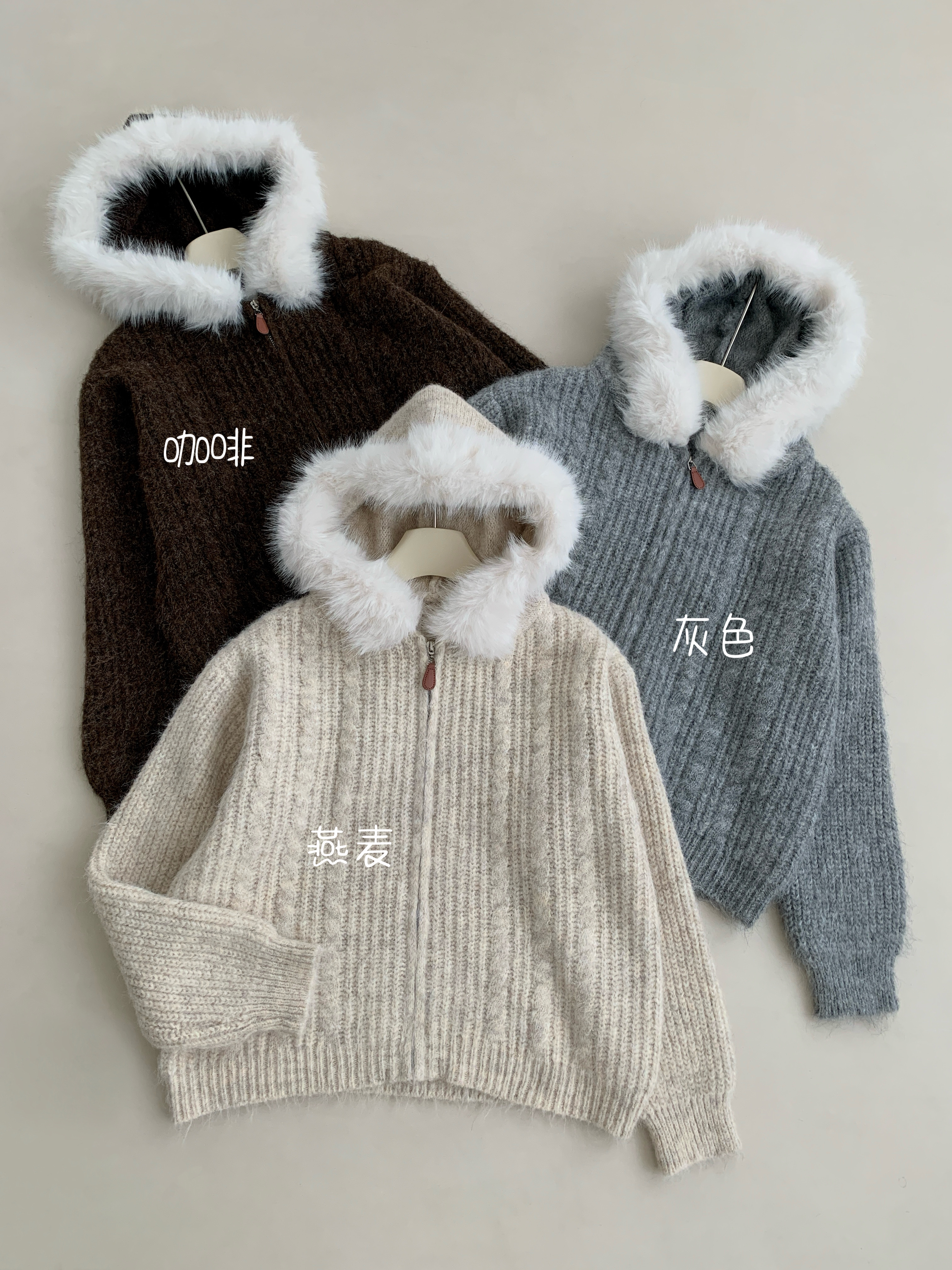 【YW】无忧购连帽毛领羊驼针织衫外套女秋冬款简约休闲开衫66179(截单后3-5天发货)