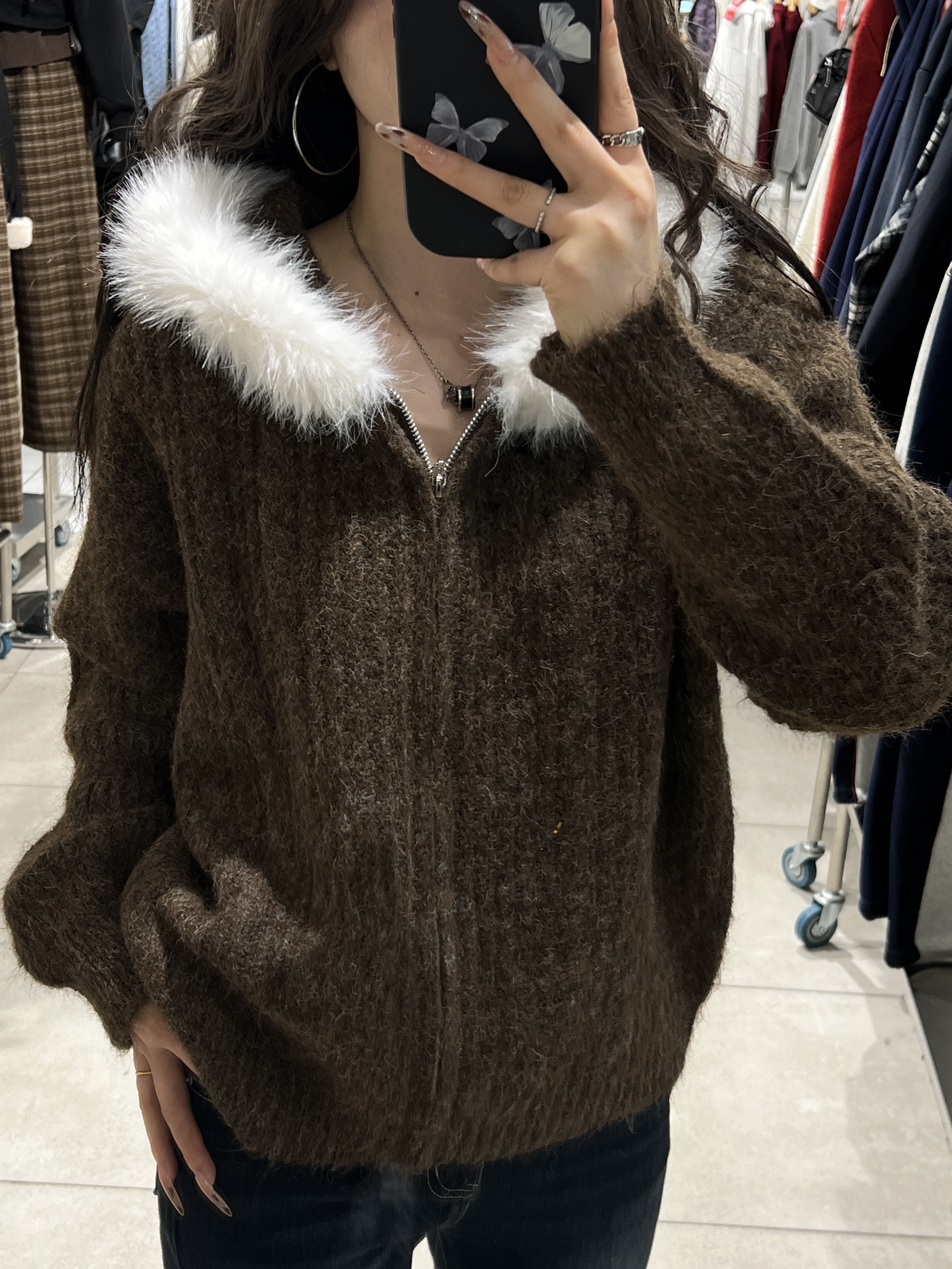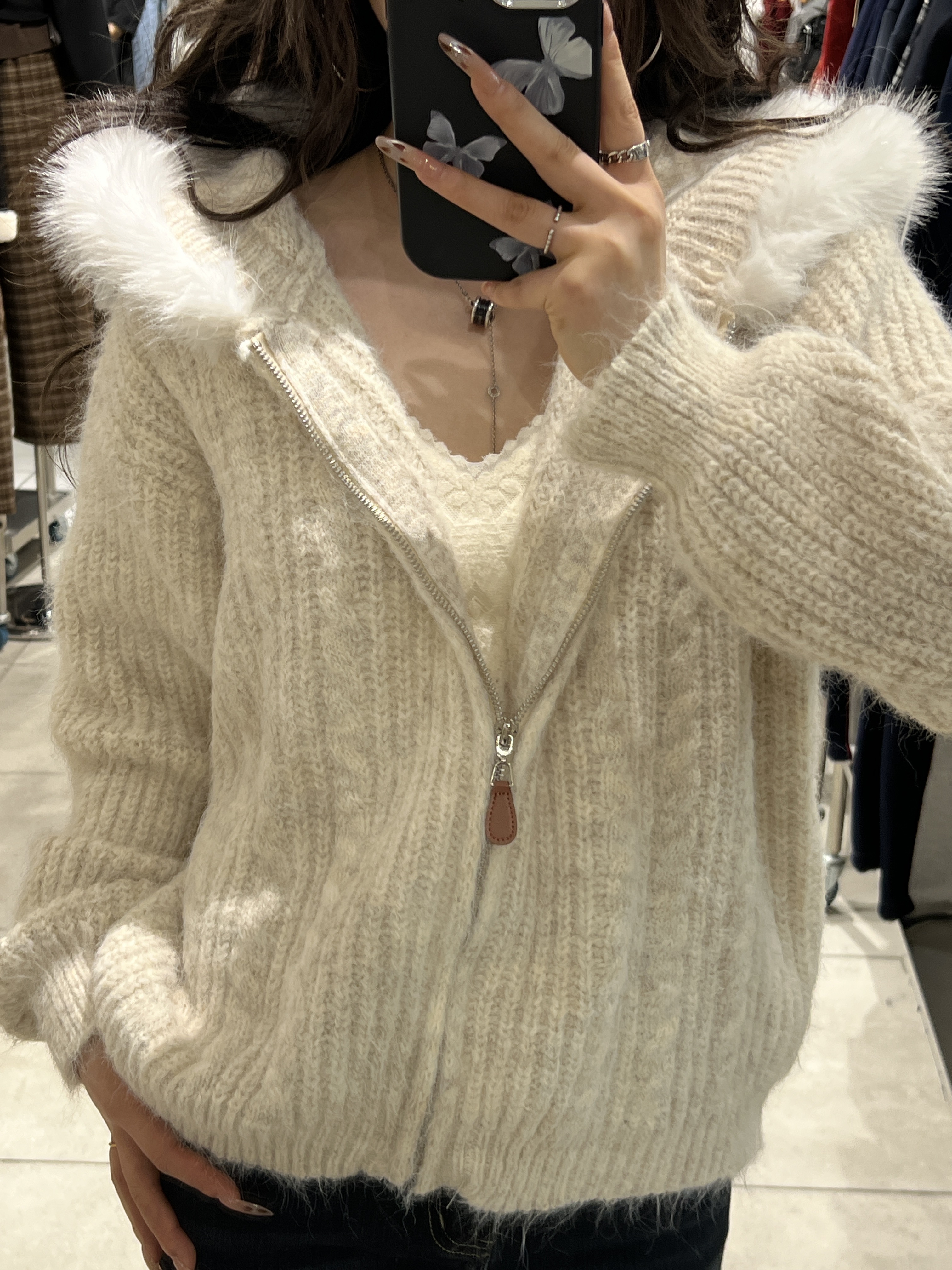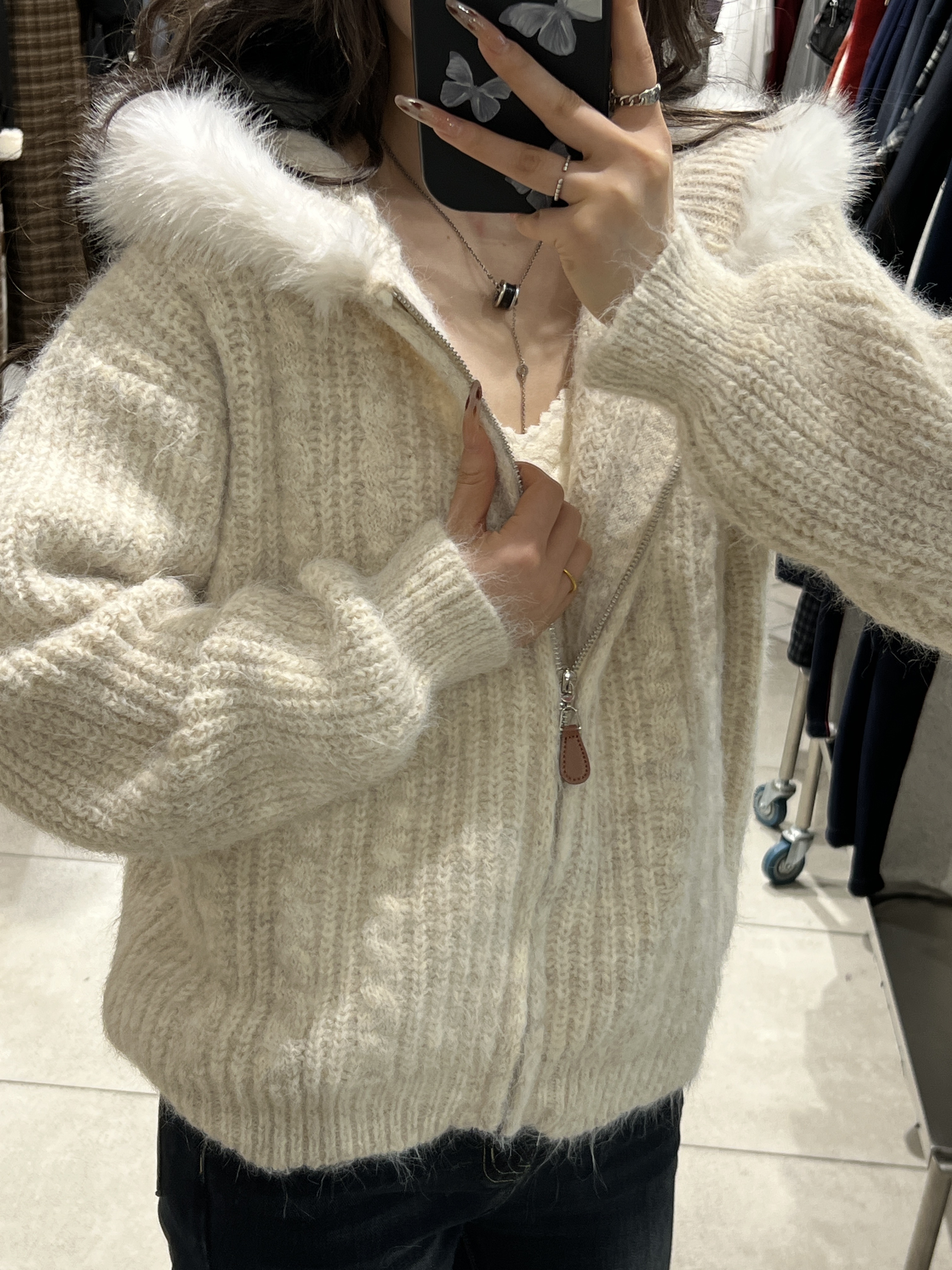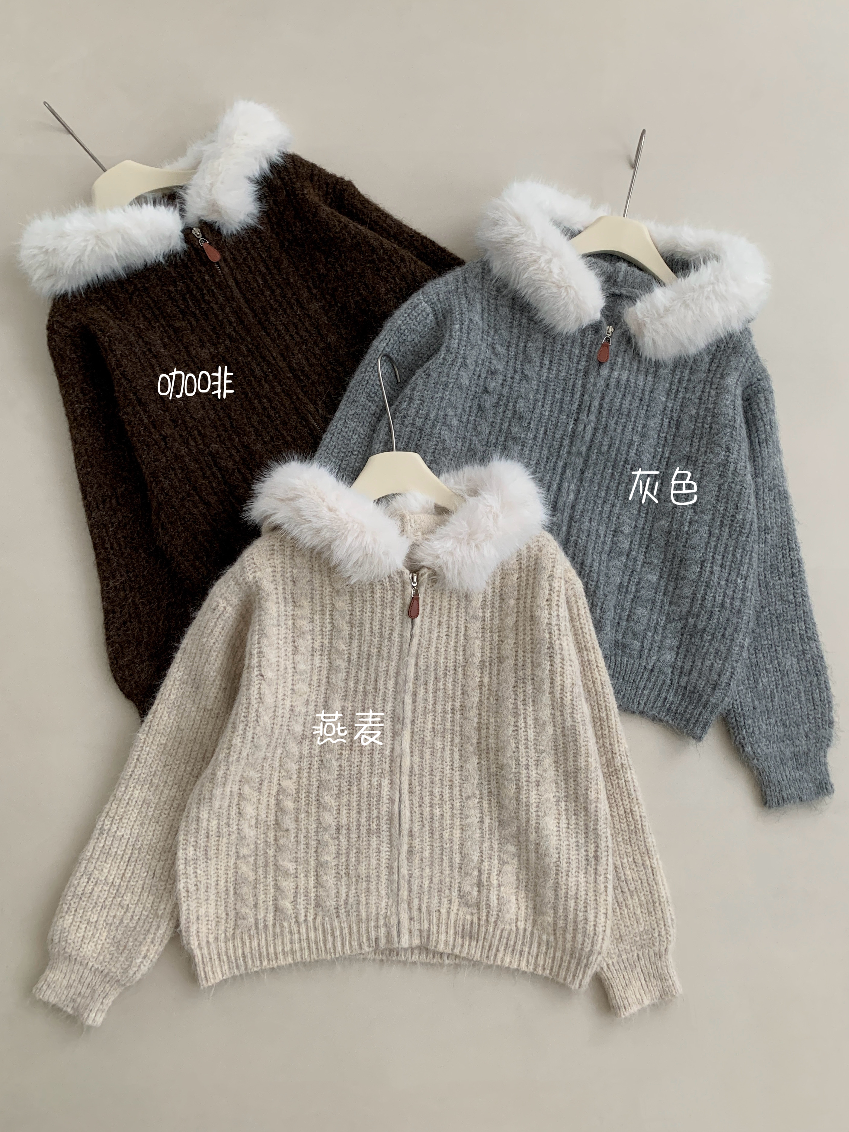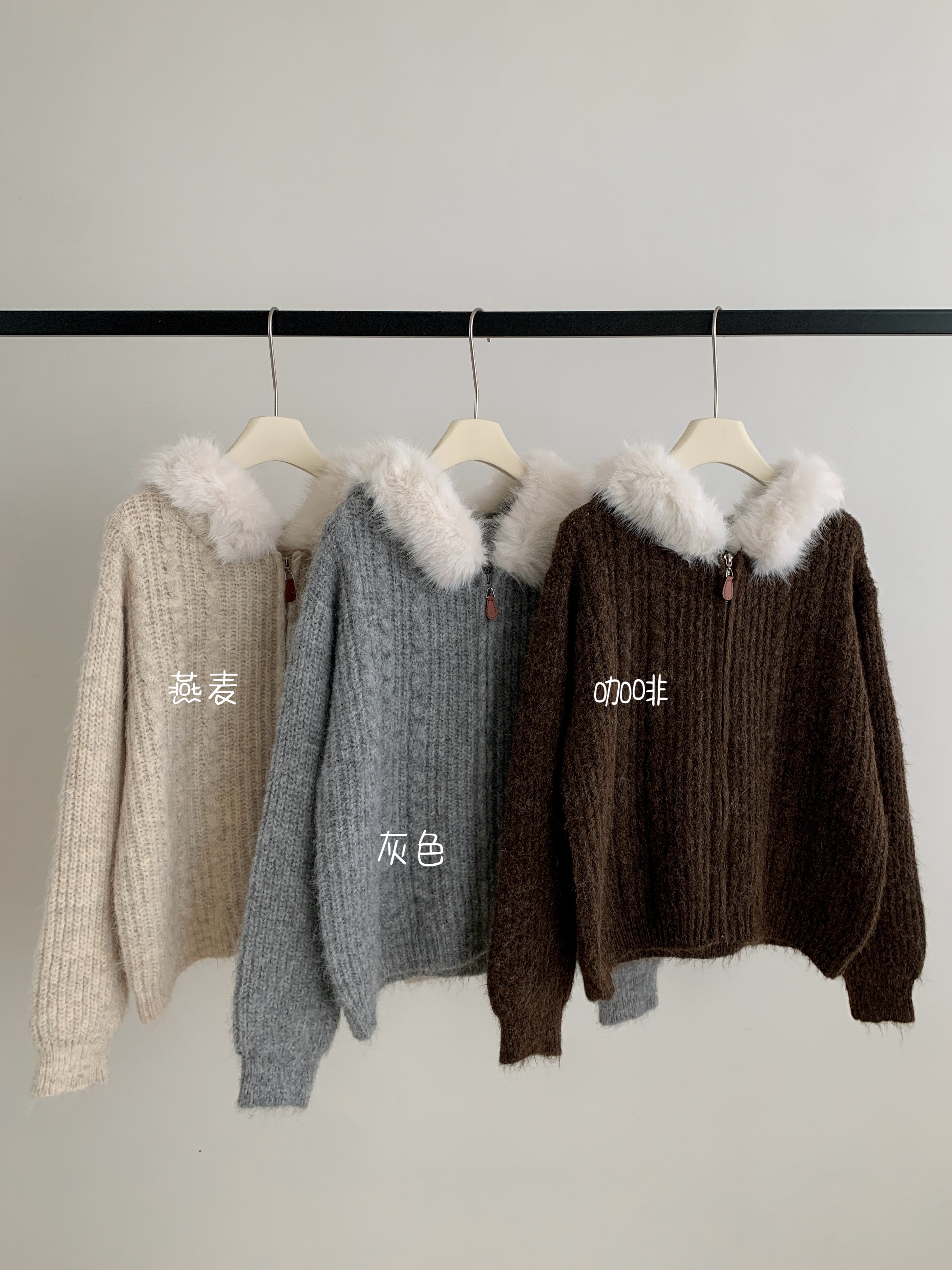 【YW】无忧购连帽毛领羊驼针织衫外套女秋冬款简约休闲开衫66179(截单后3-5天发货)