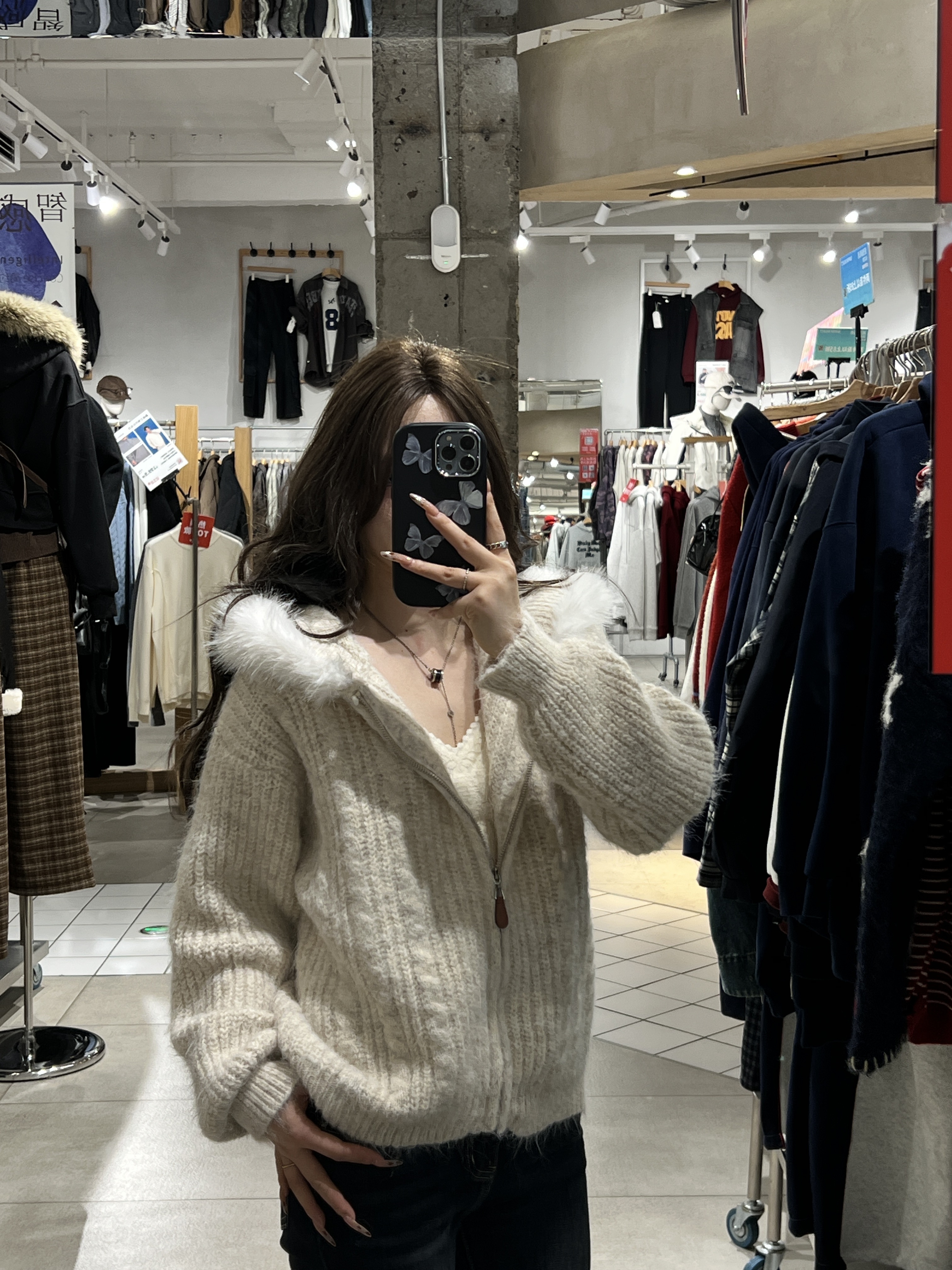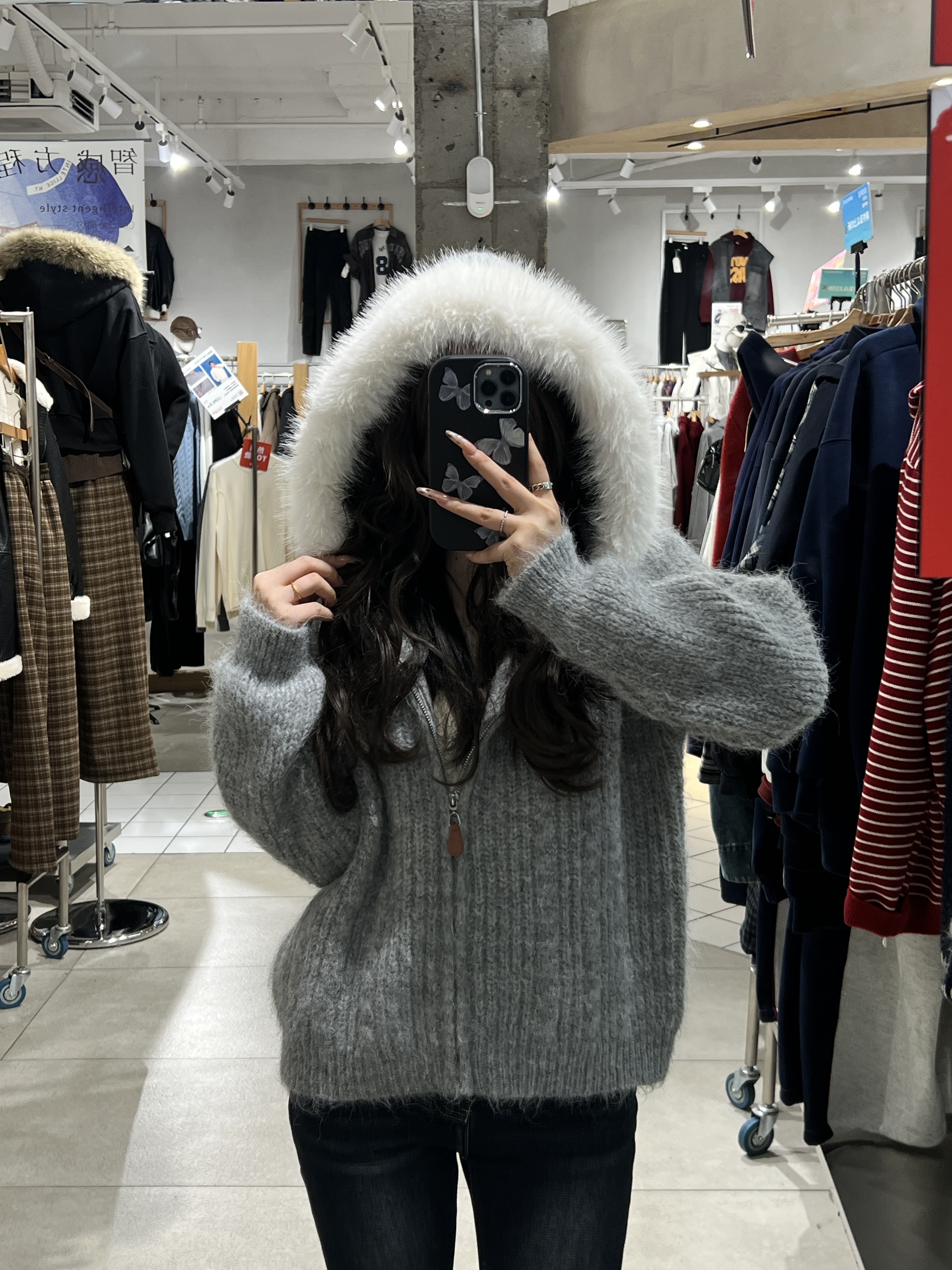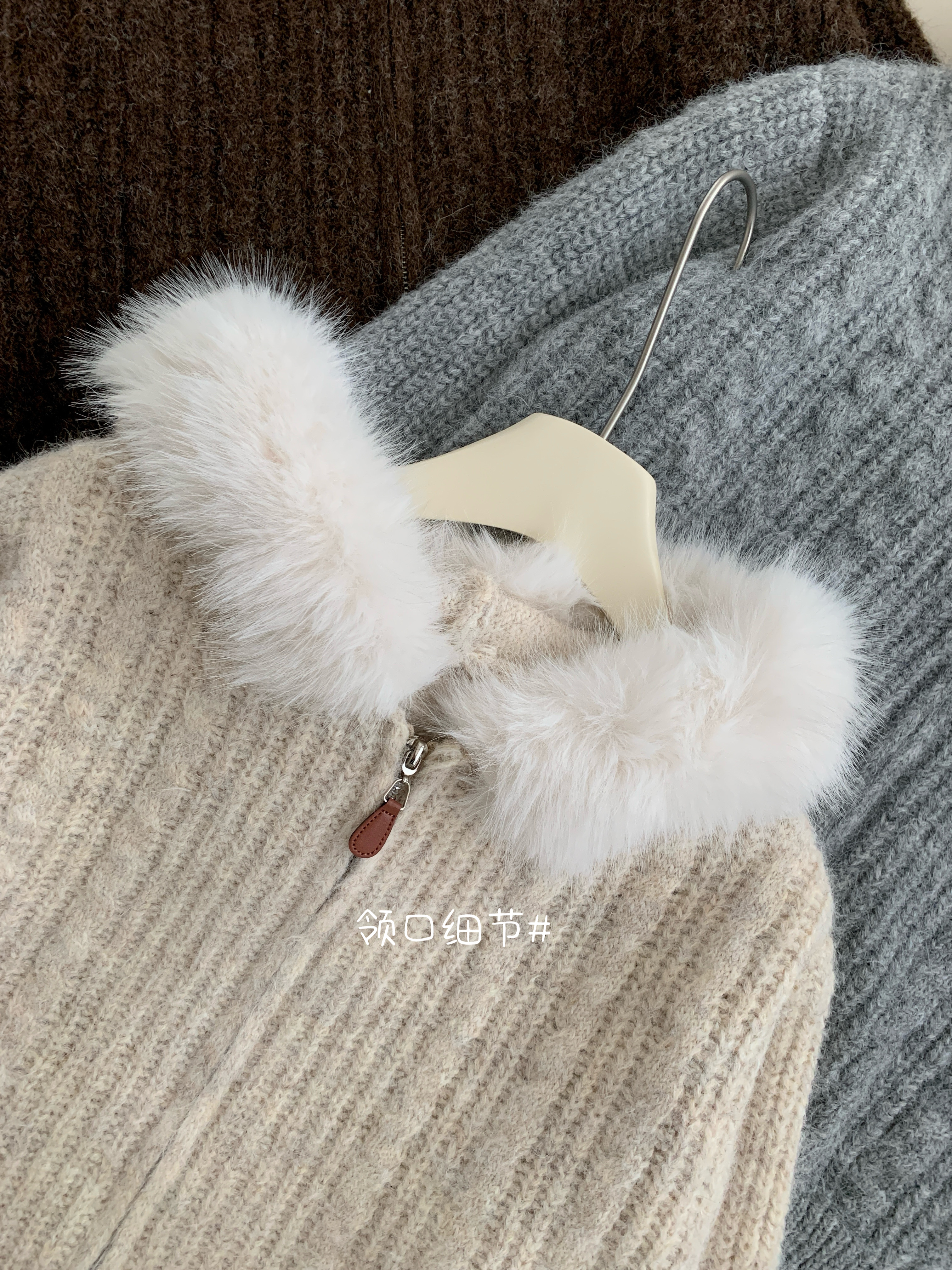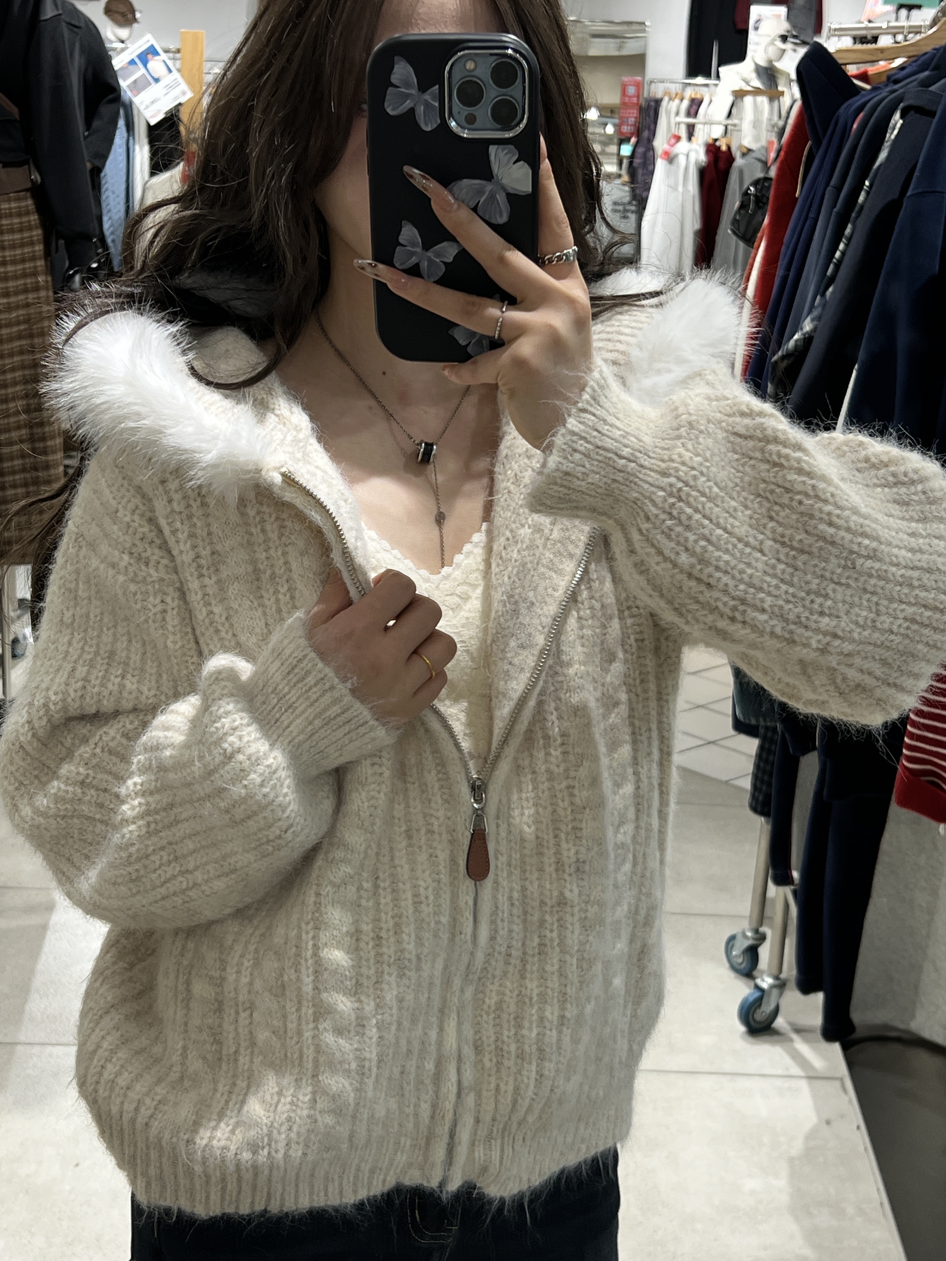 【YW】无忧购连帽毛领羊驼针织衫外套女秋冬款简约休闲开衫66179(截单后3-5天发货)
