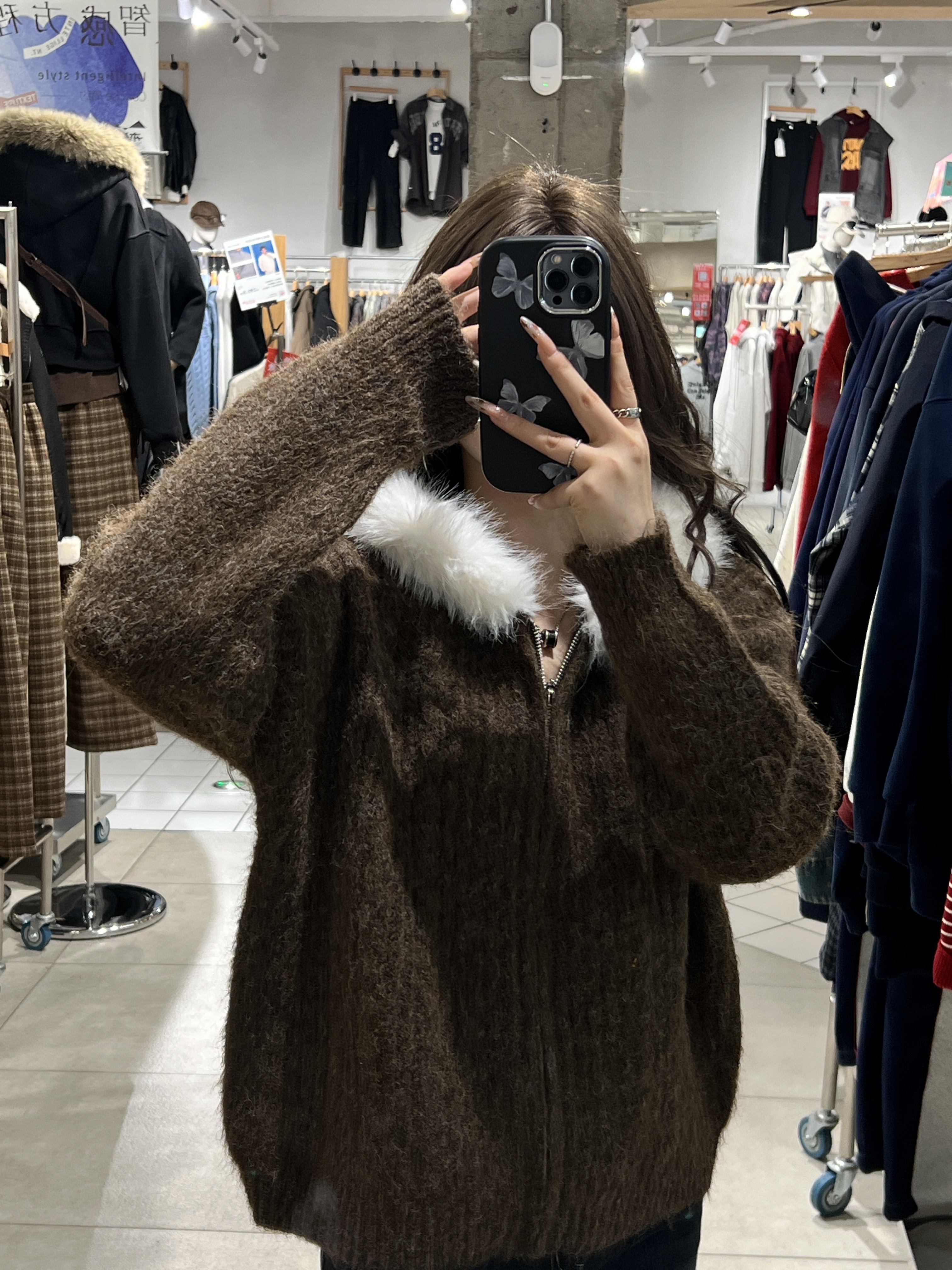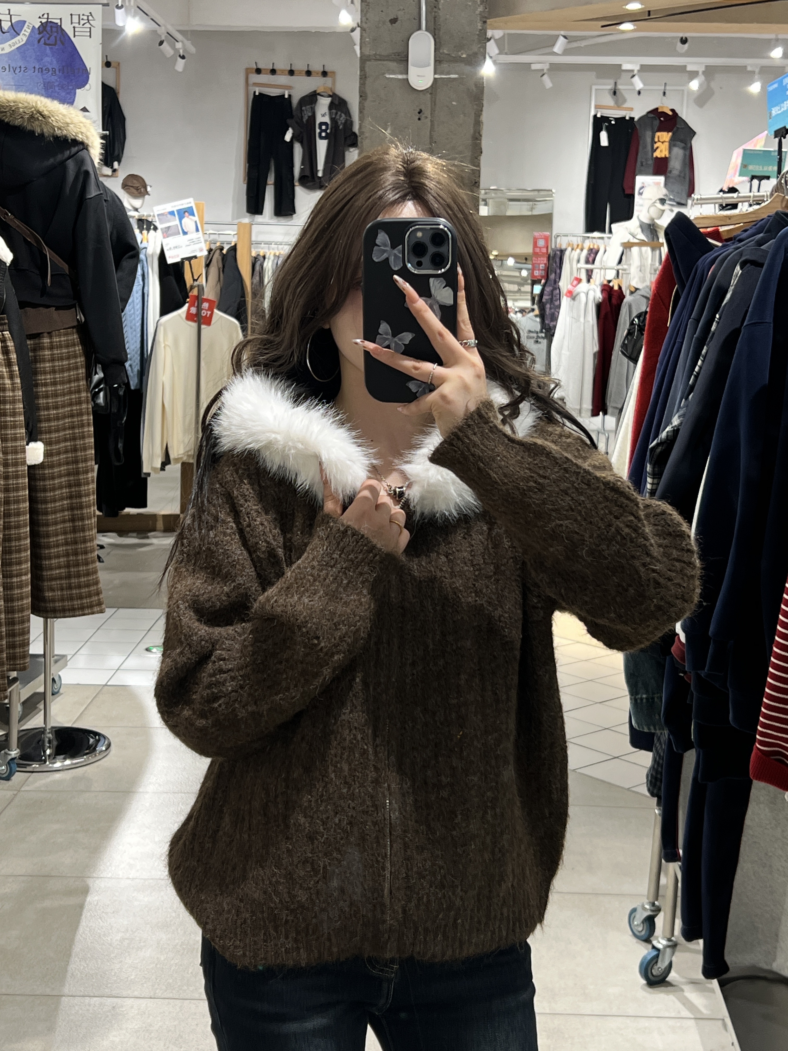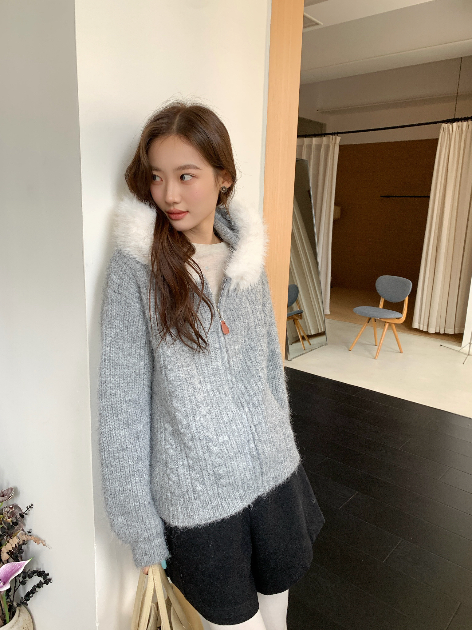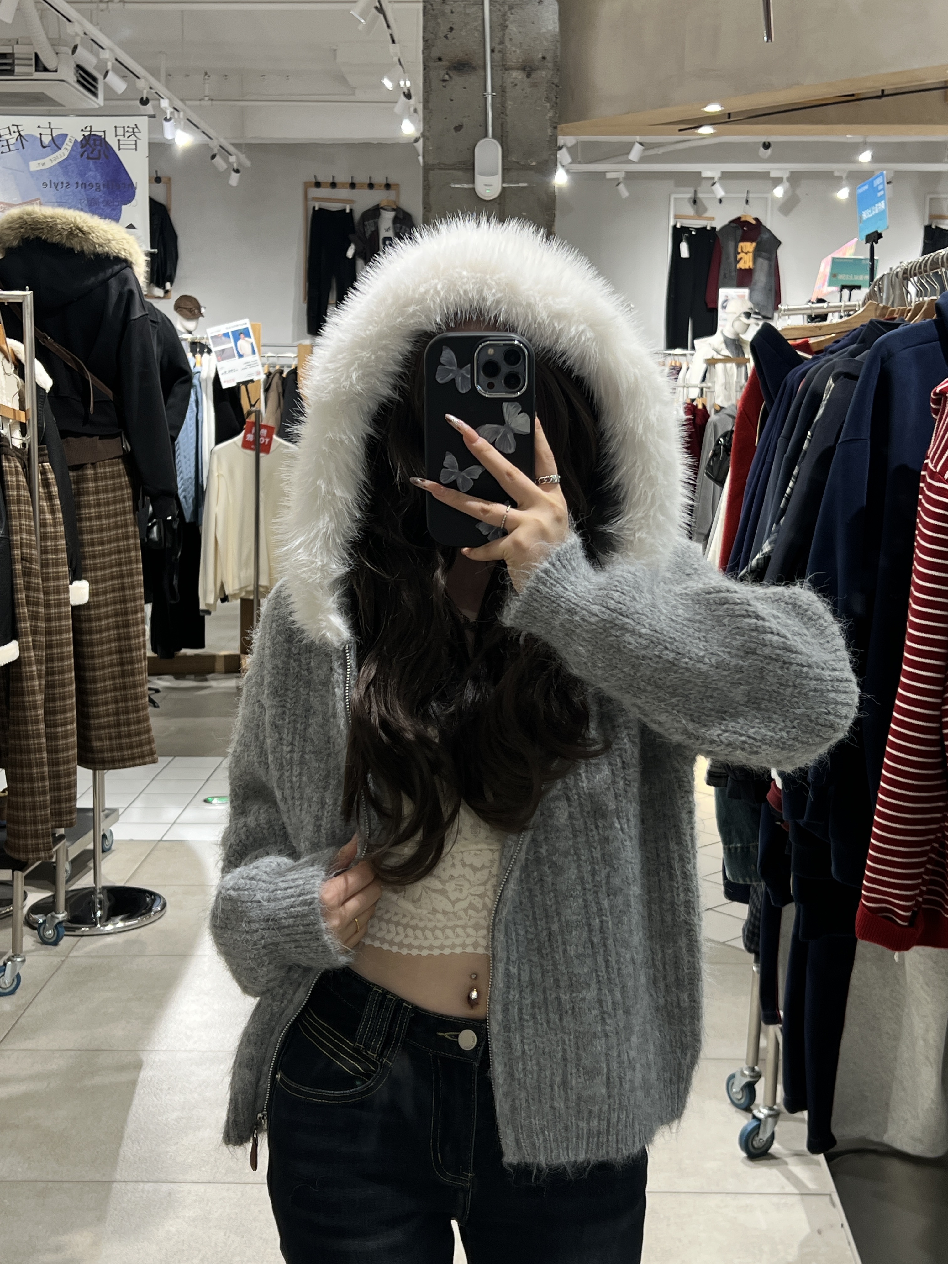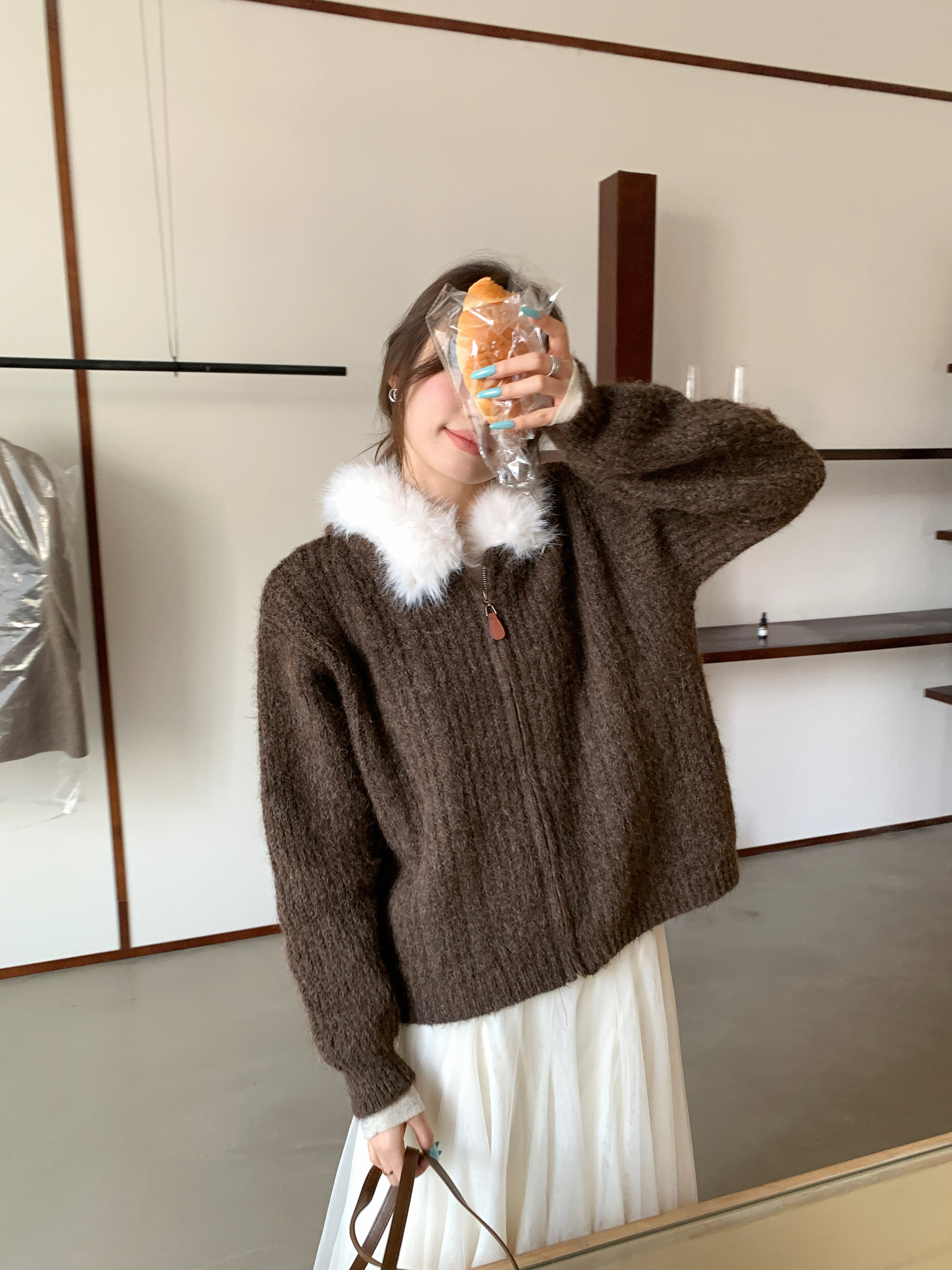 【YW】无忧购连帽毛领羊驼针织衫外套女秋冬款简约休闲开衫66179(截单后3-5天发货)