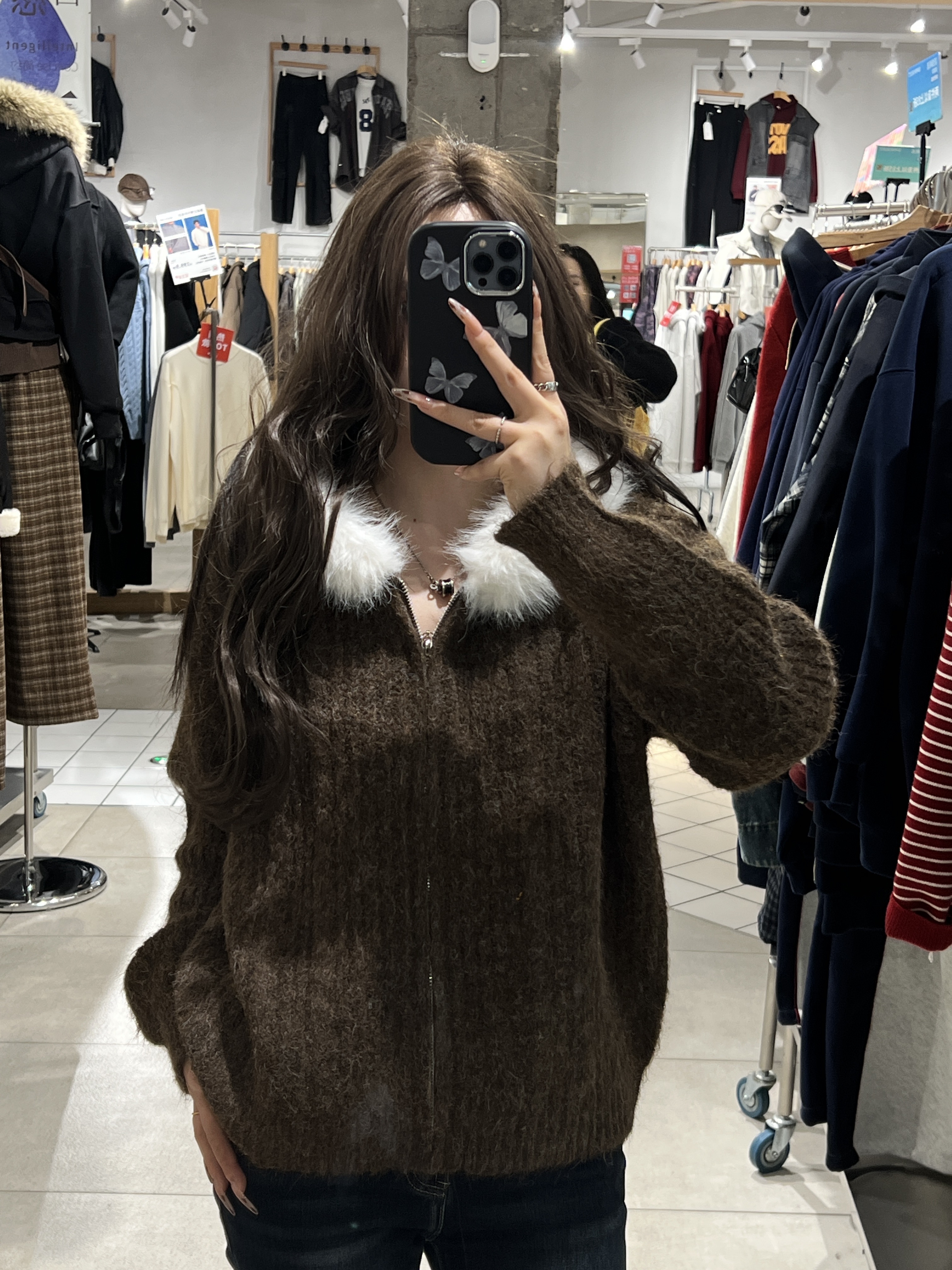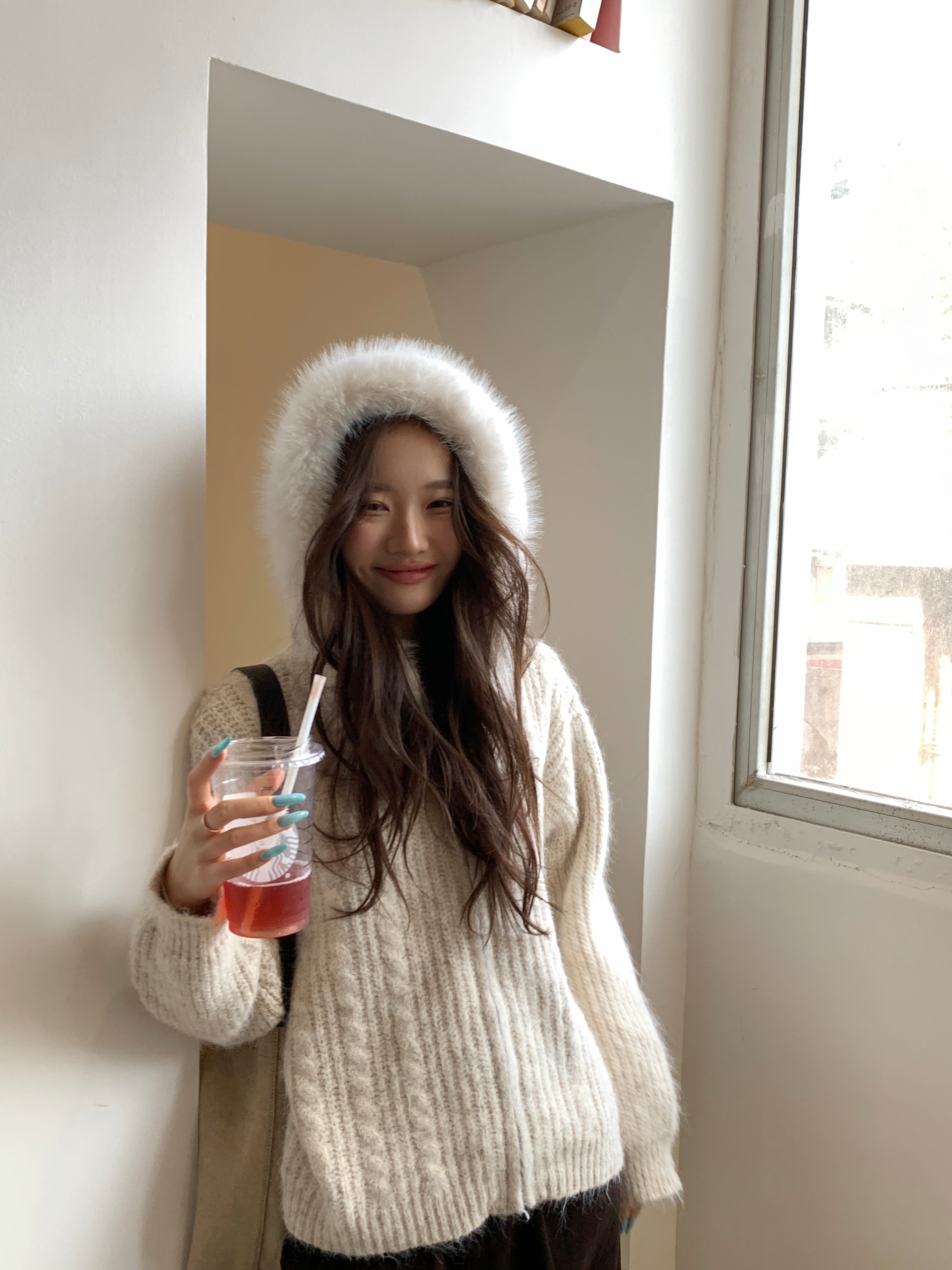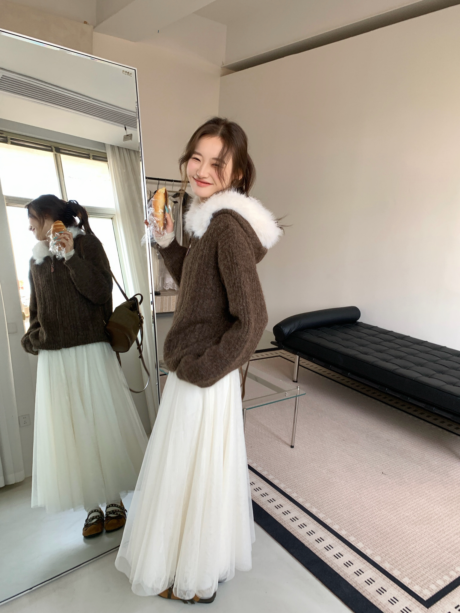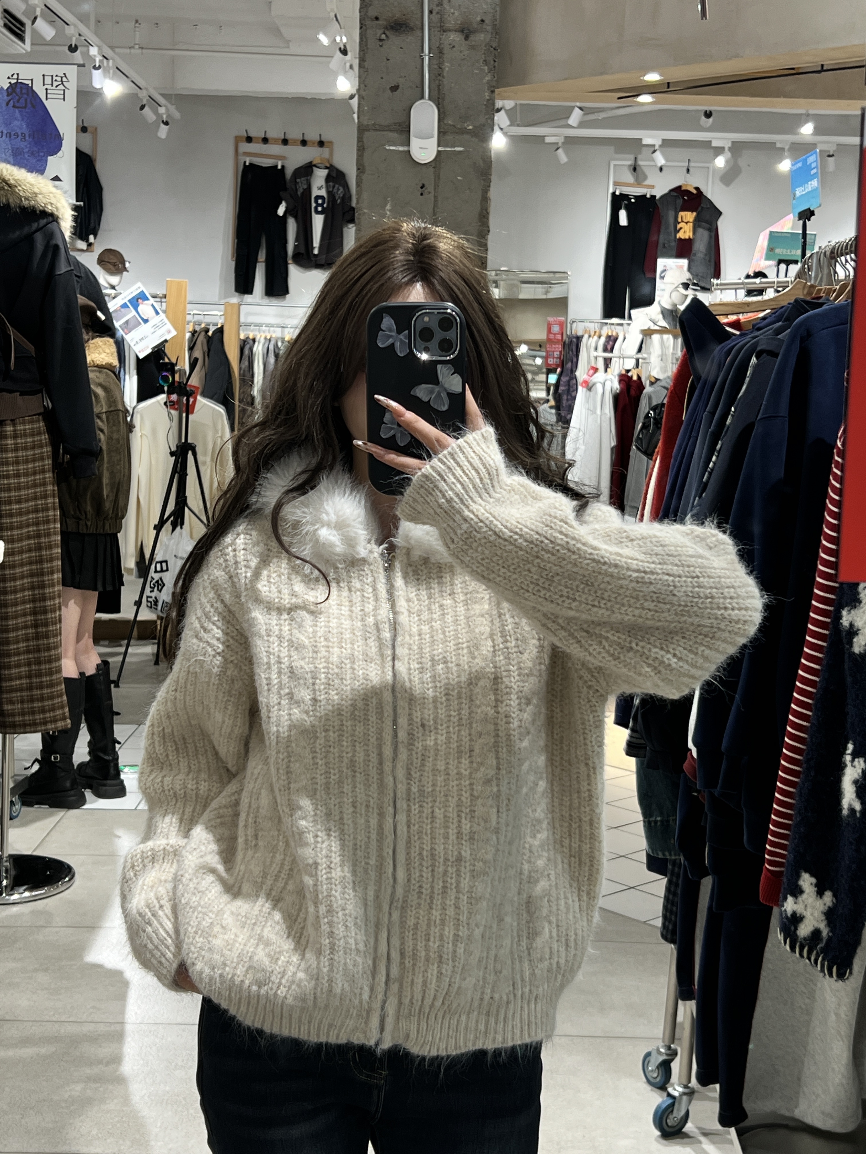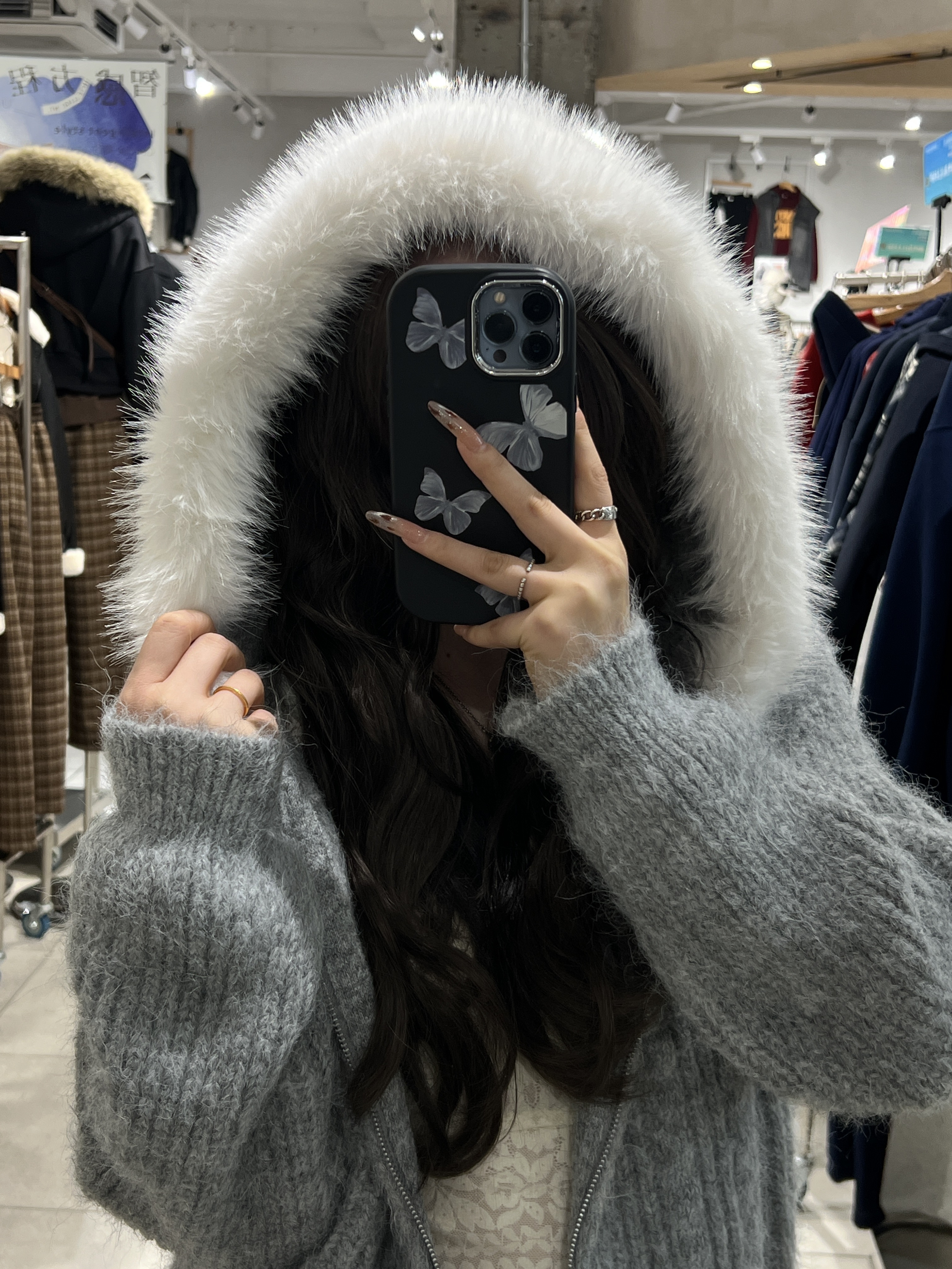 【YW】无忧购连帽毛领羊驼针织衫外套女秋冬款简约休闲开衫66179(截单后3-5天发货)