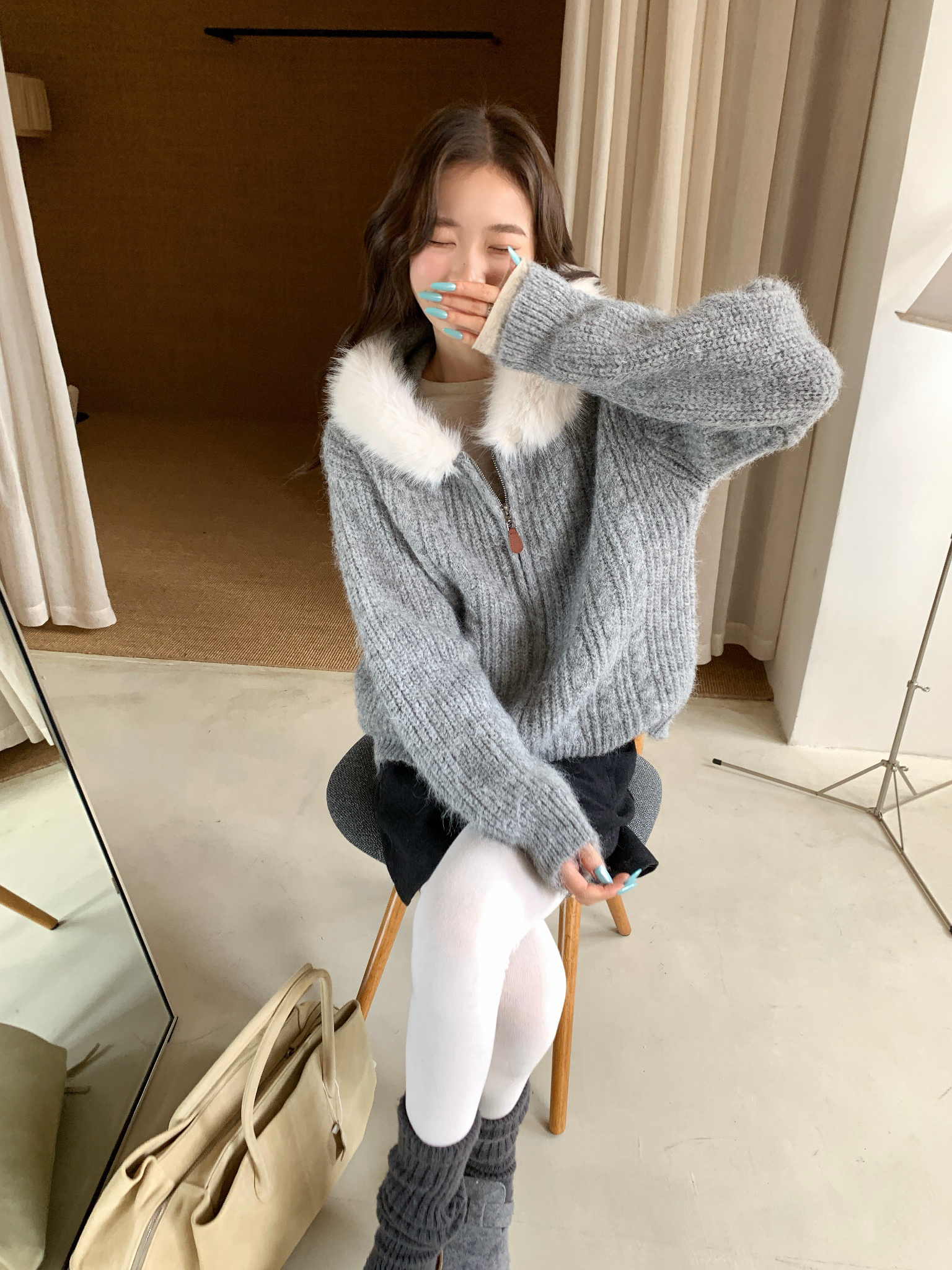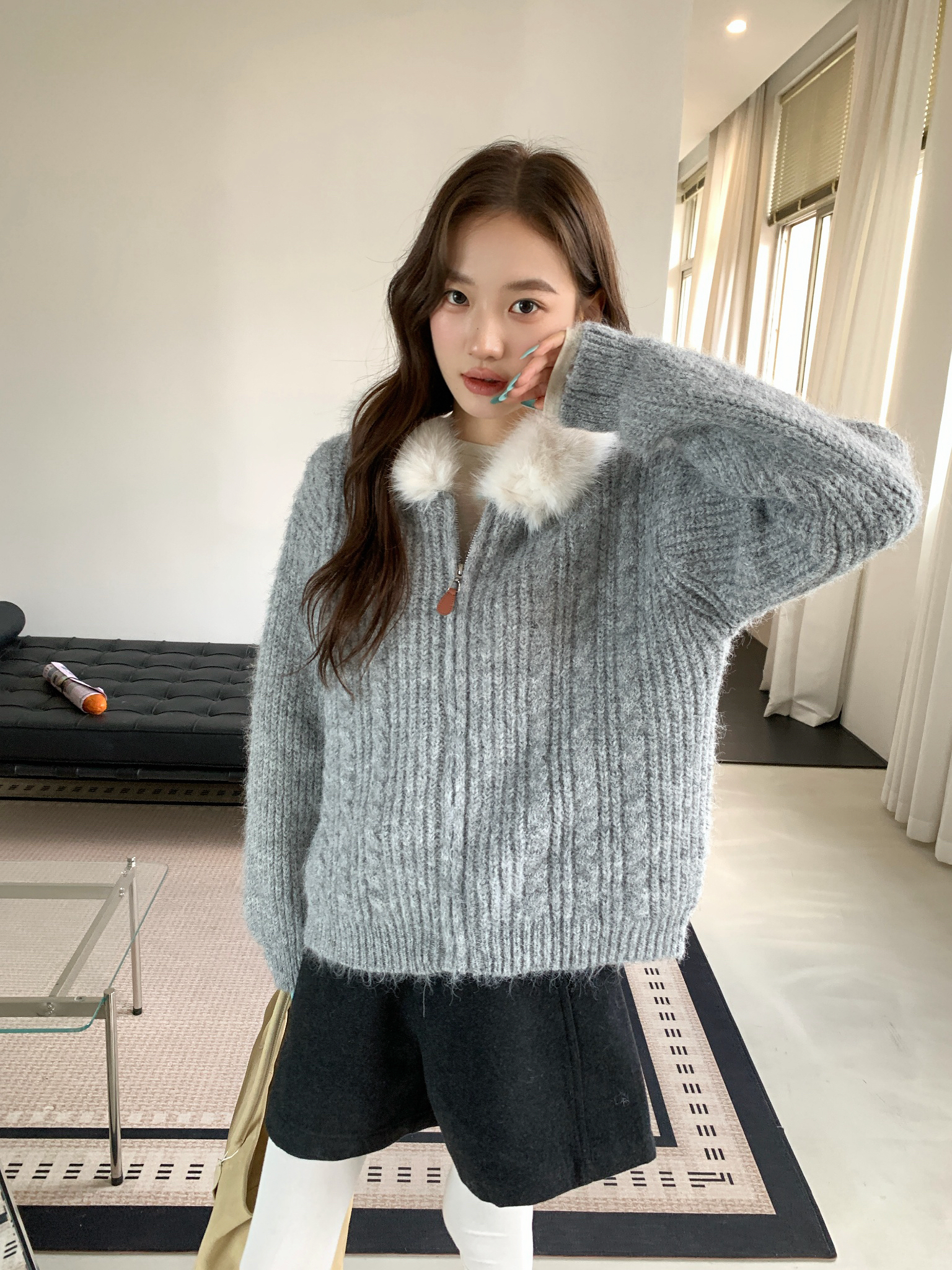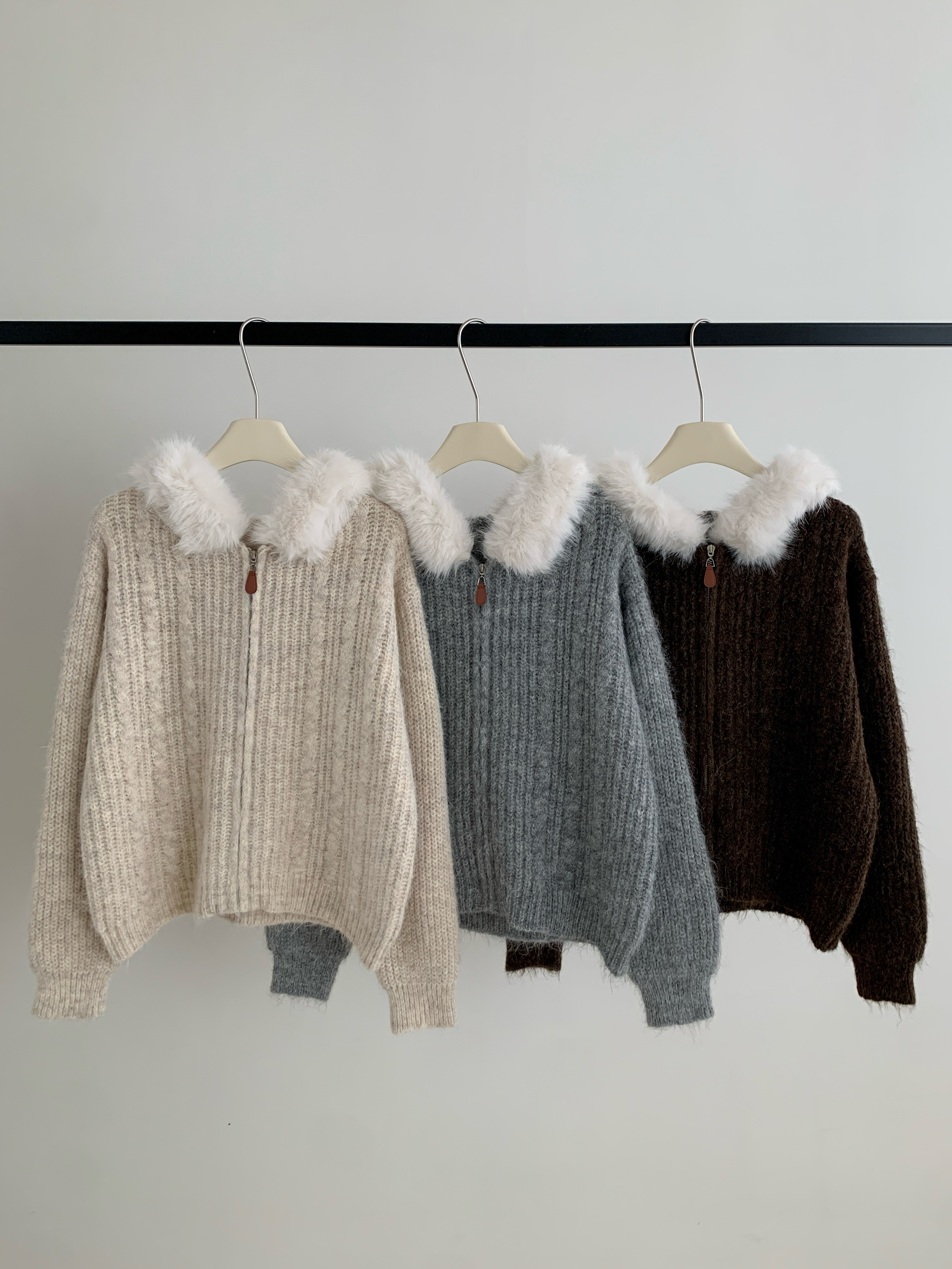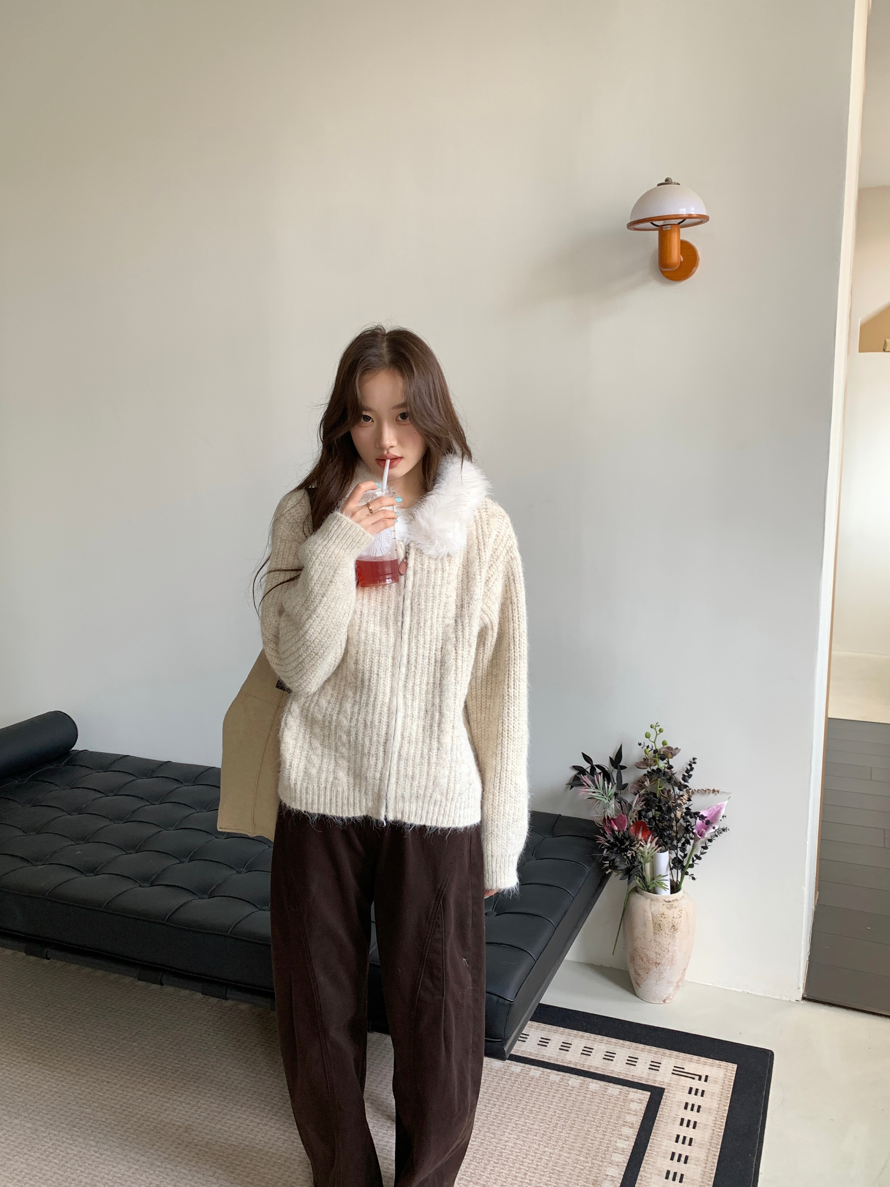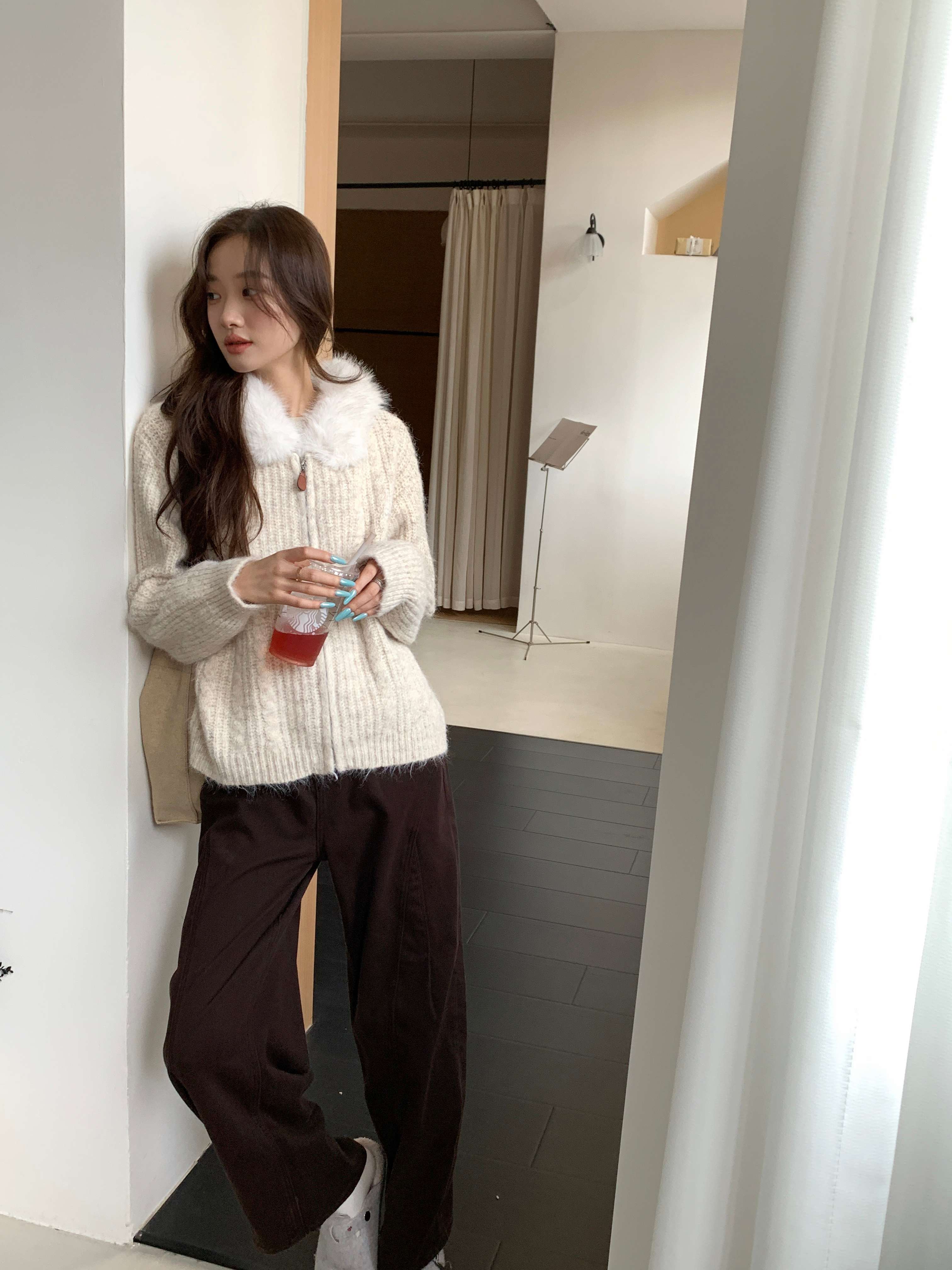 【YW】无忧购连帽毛领羊驼针织衫外套女秋冬款简约休闲开衫66179(截单后3-5天发货)
