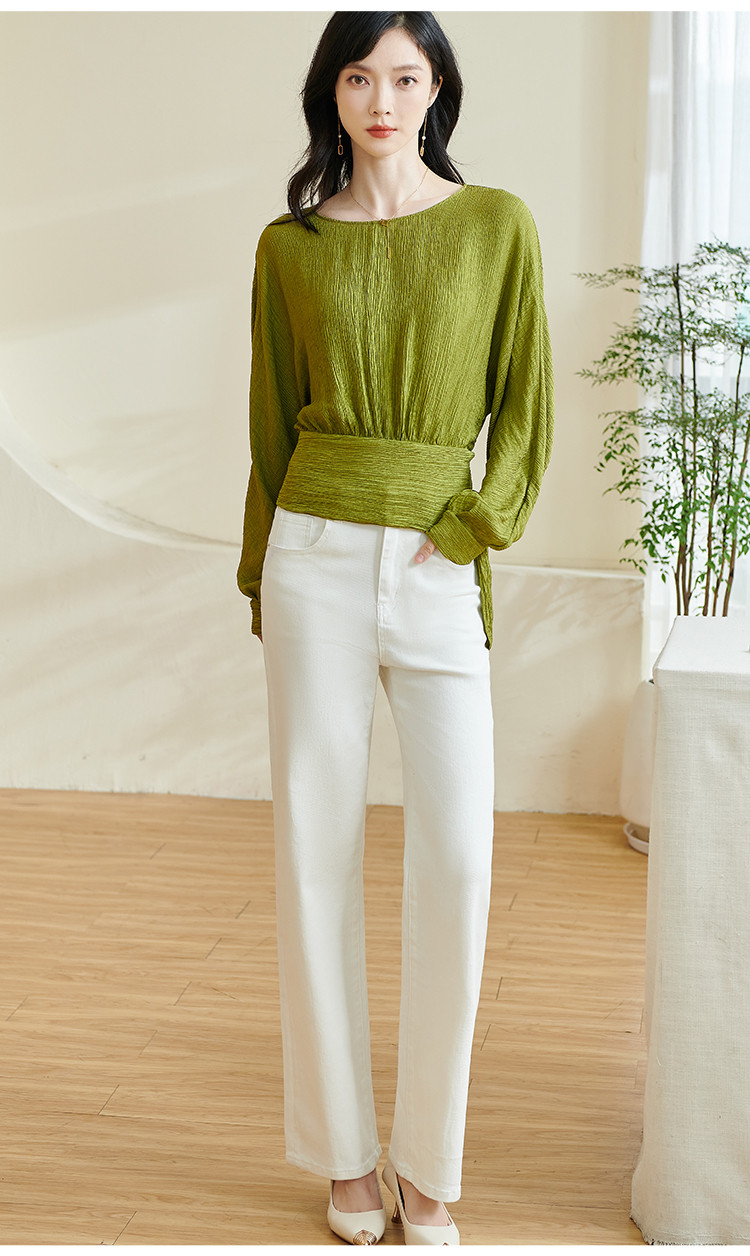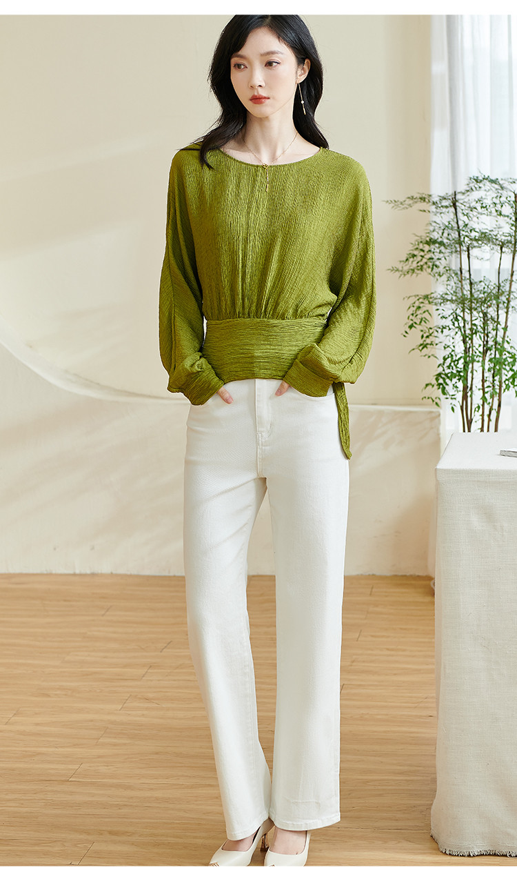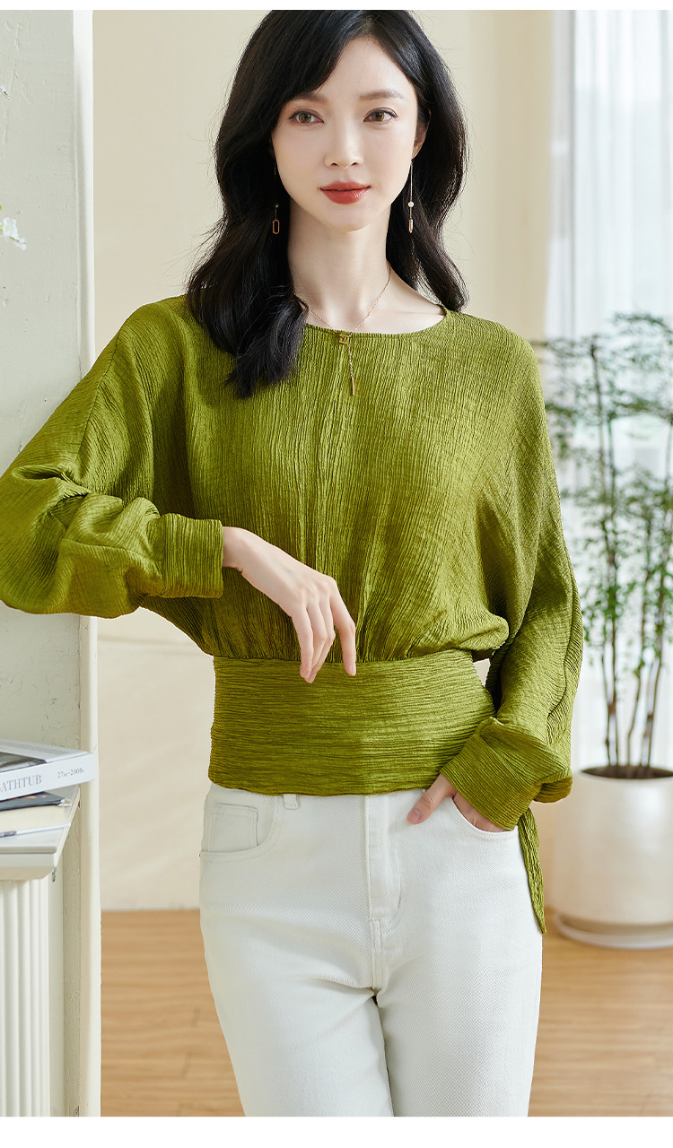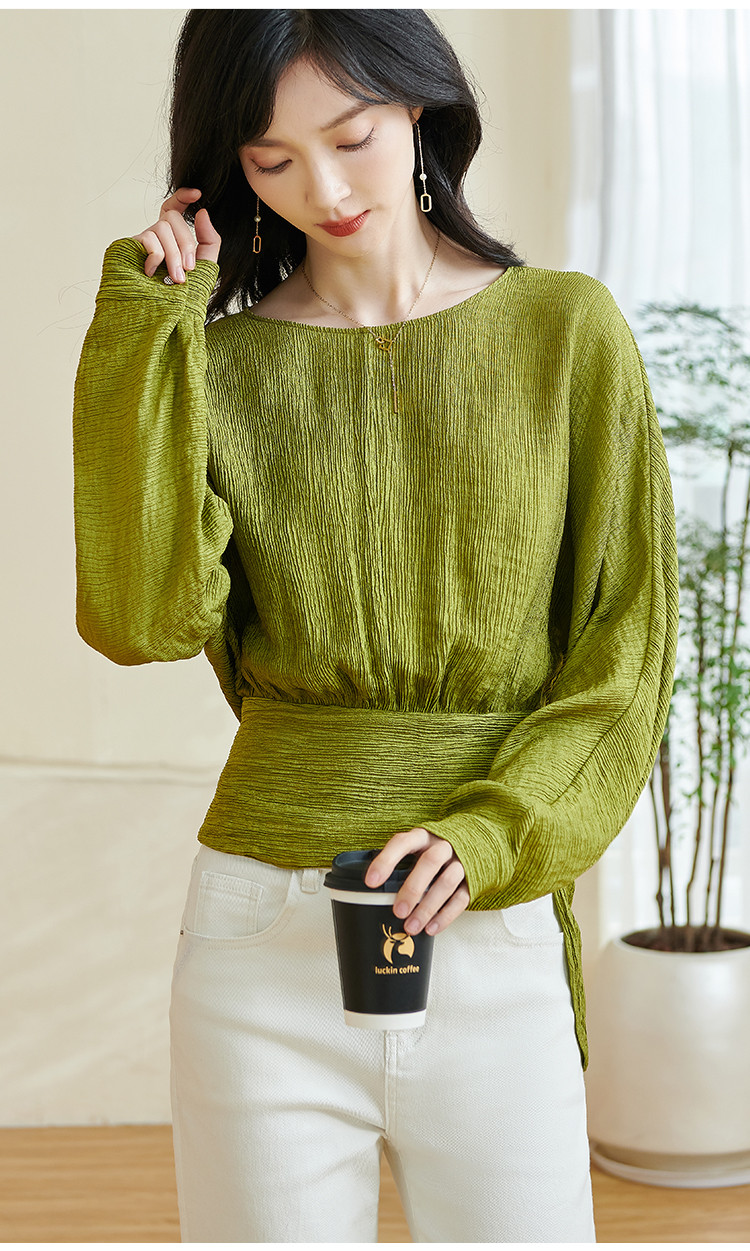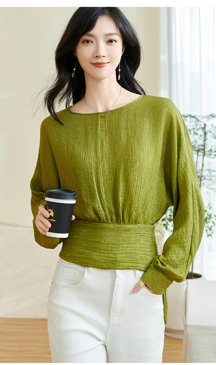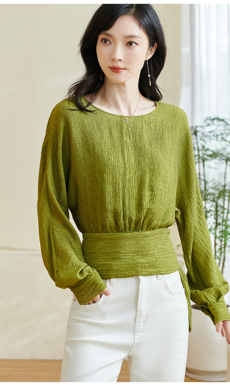 米思阳2026春季新款优雅别致肌理感衬衫蝴蝶结修身绿色上衣女0460