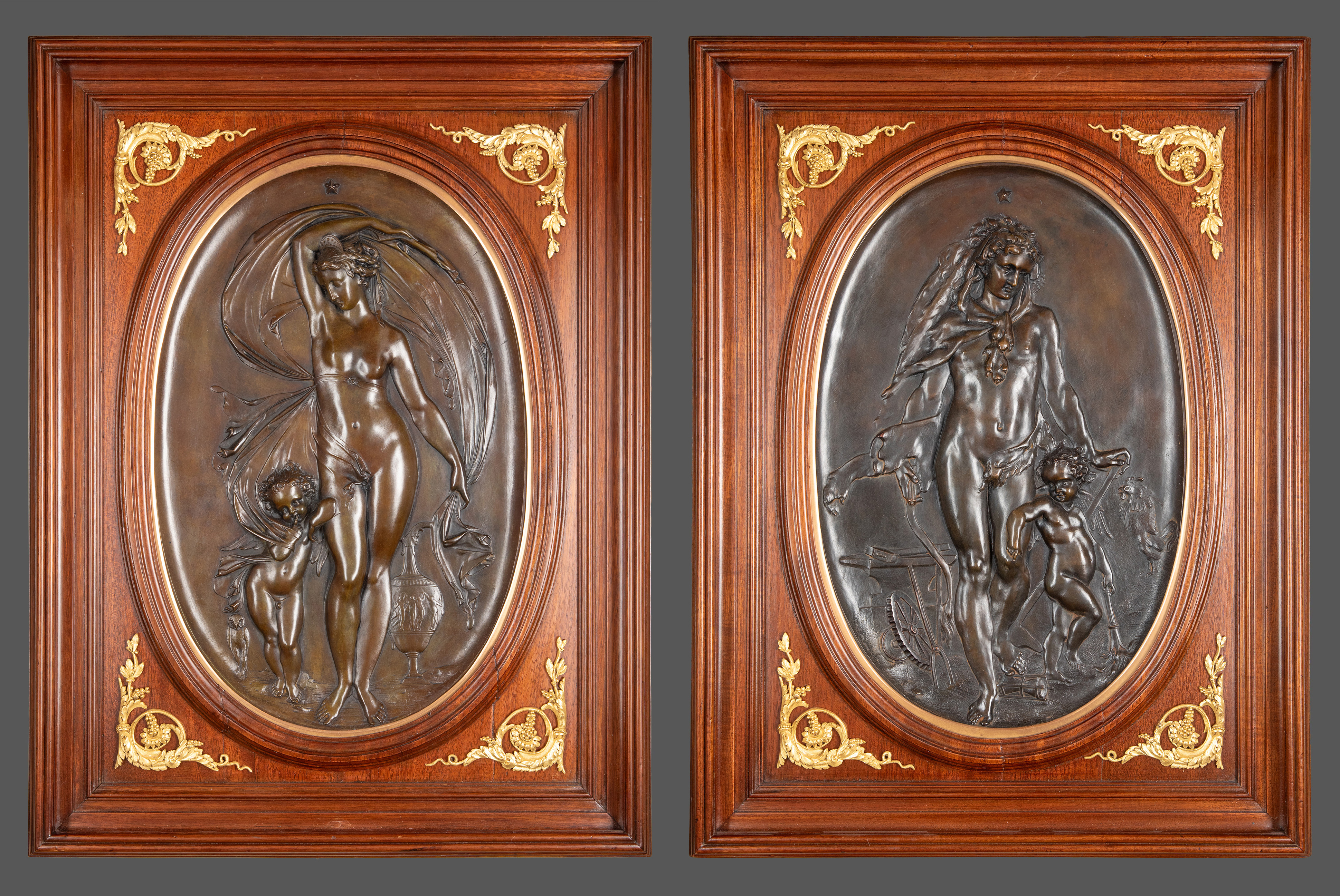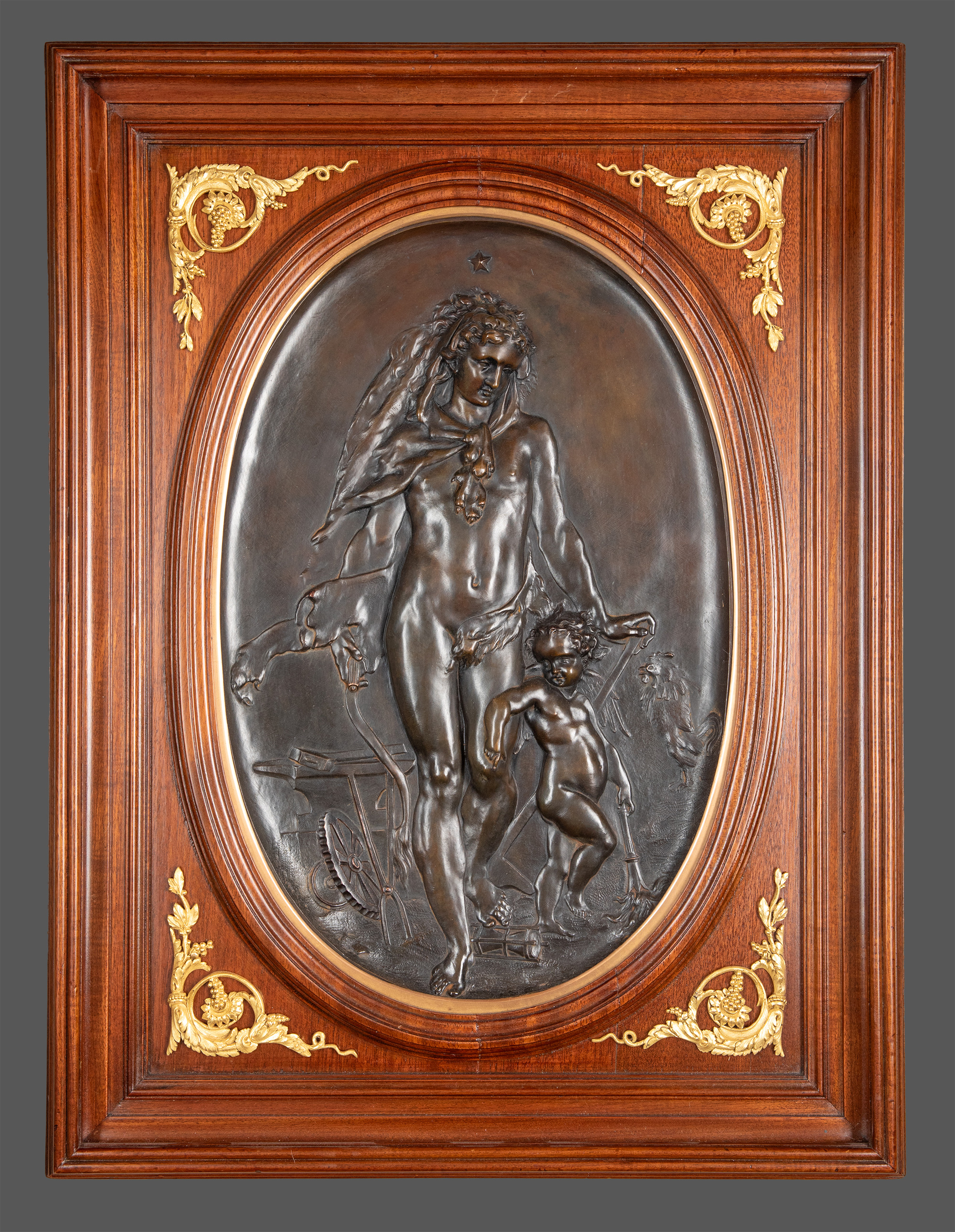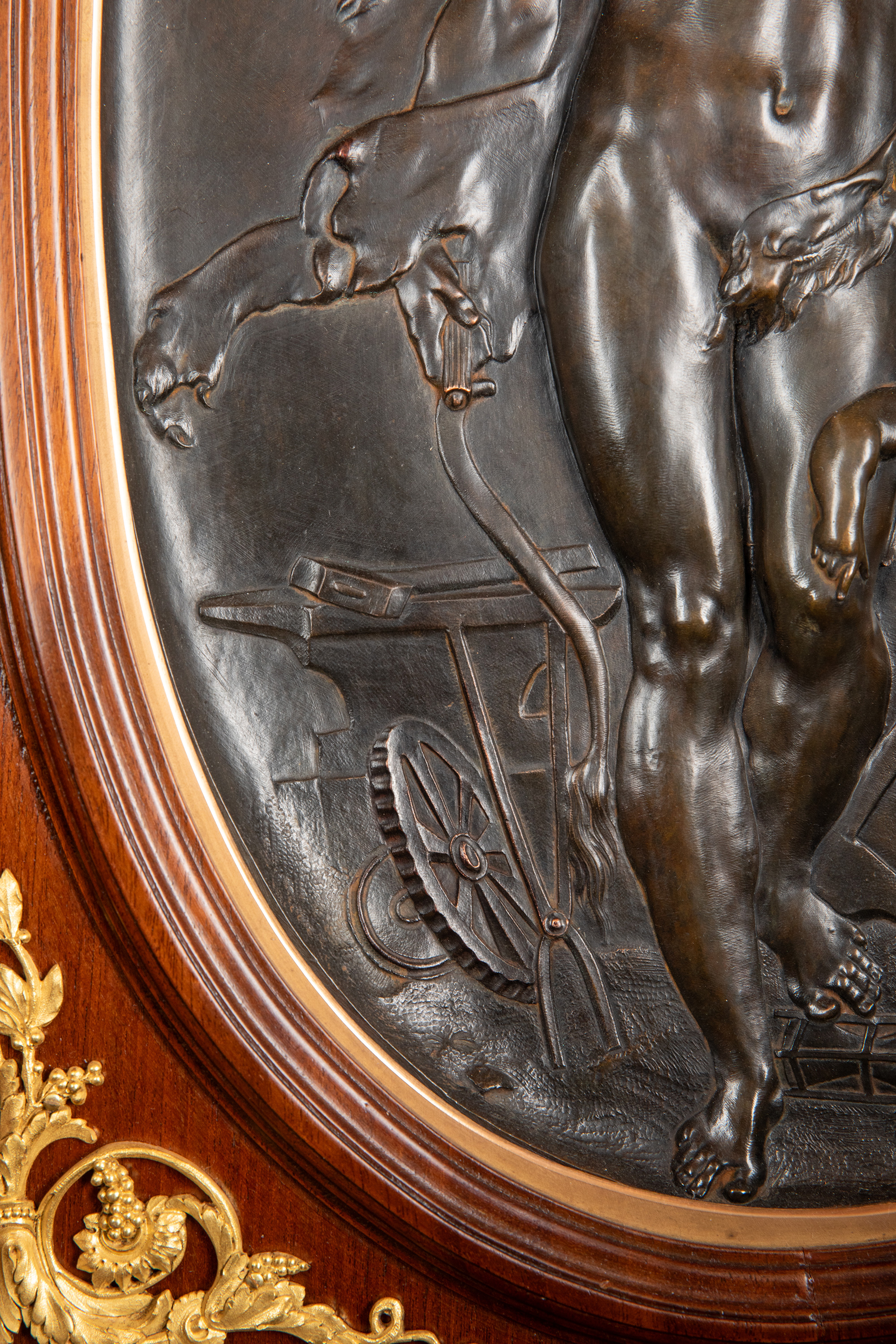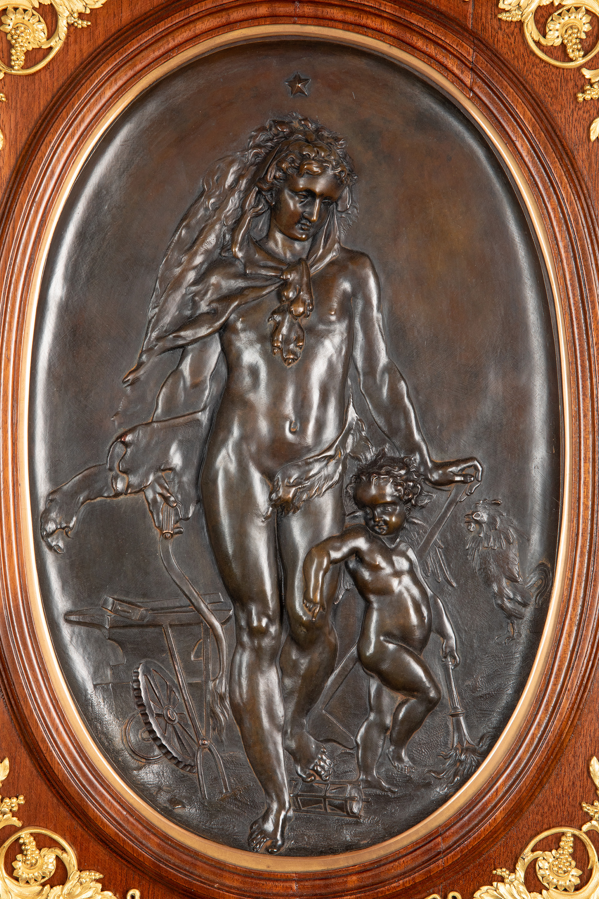 19世纪法国出品卷叶纹铜鎏金精雕装饰硬木画框古典神话主题青铜浮雕壁挂画一对