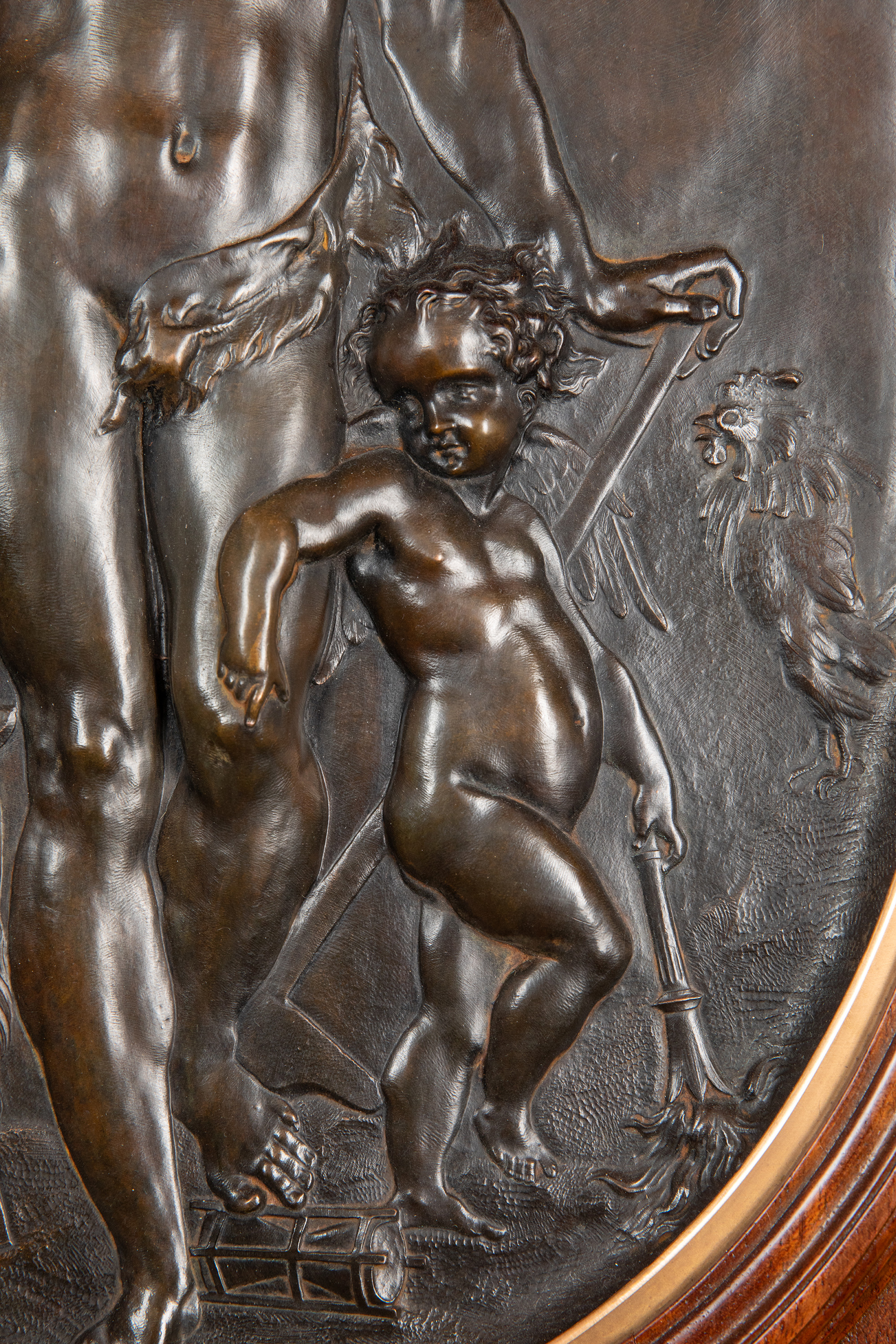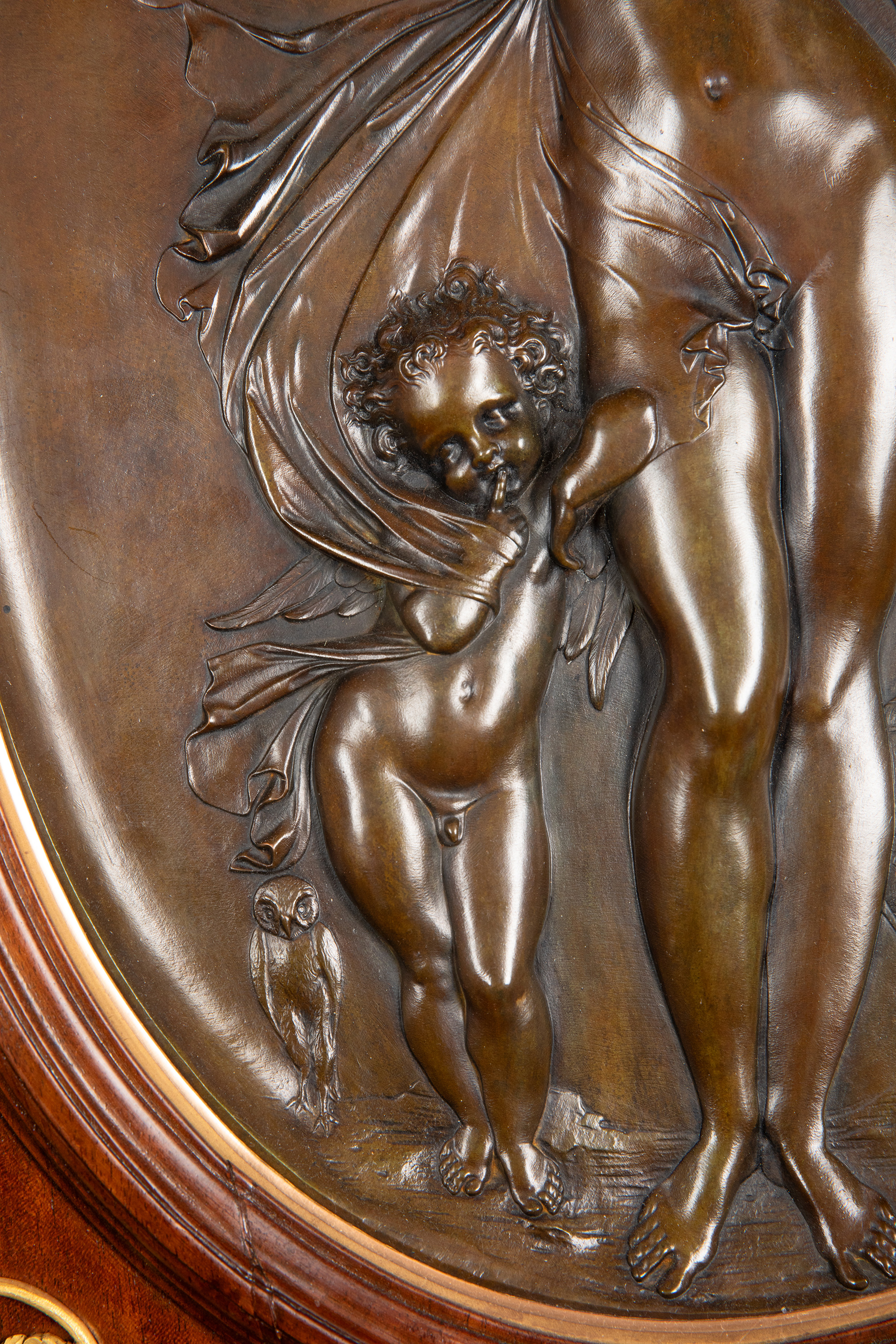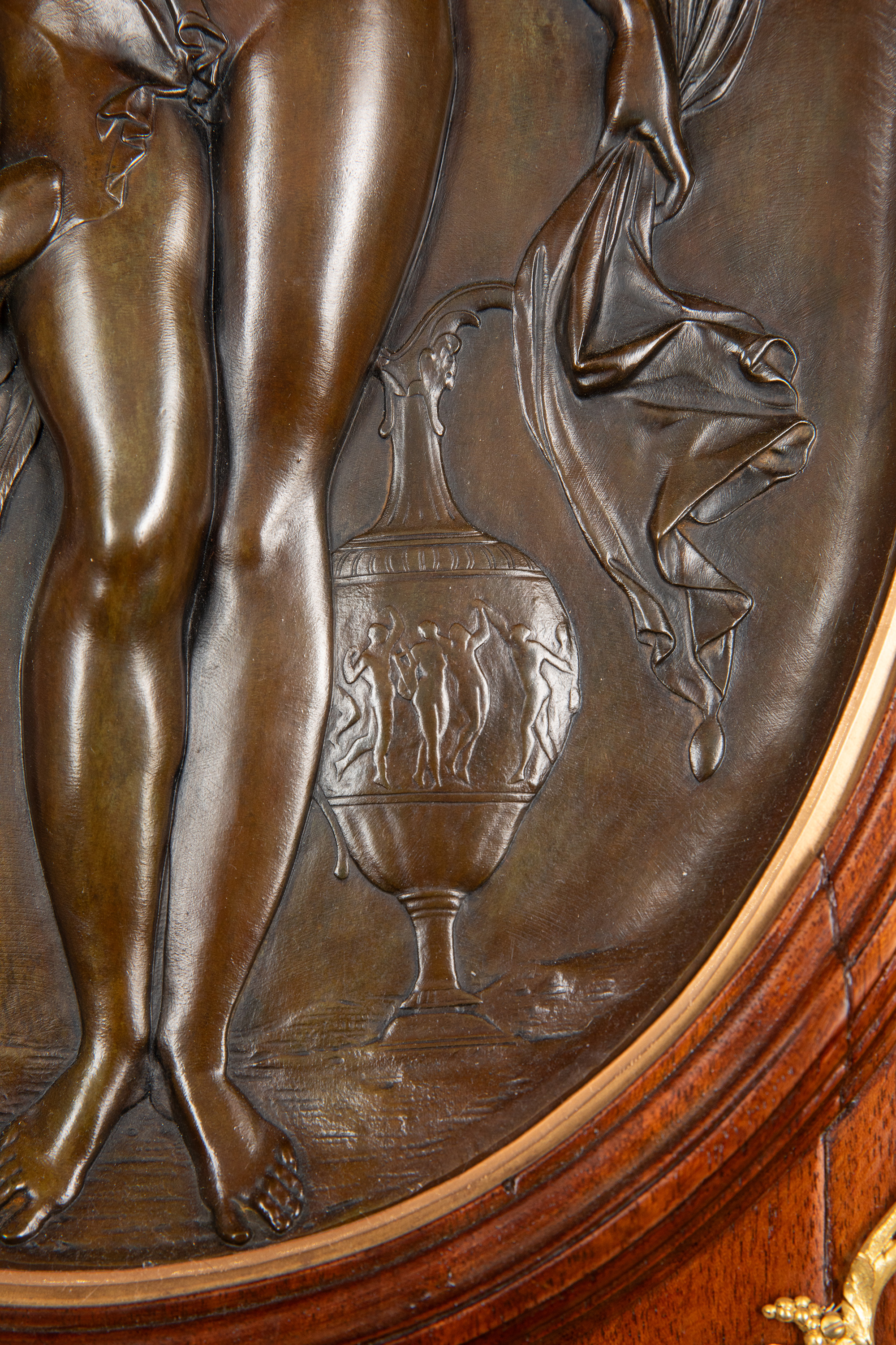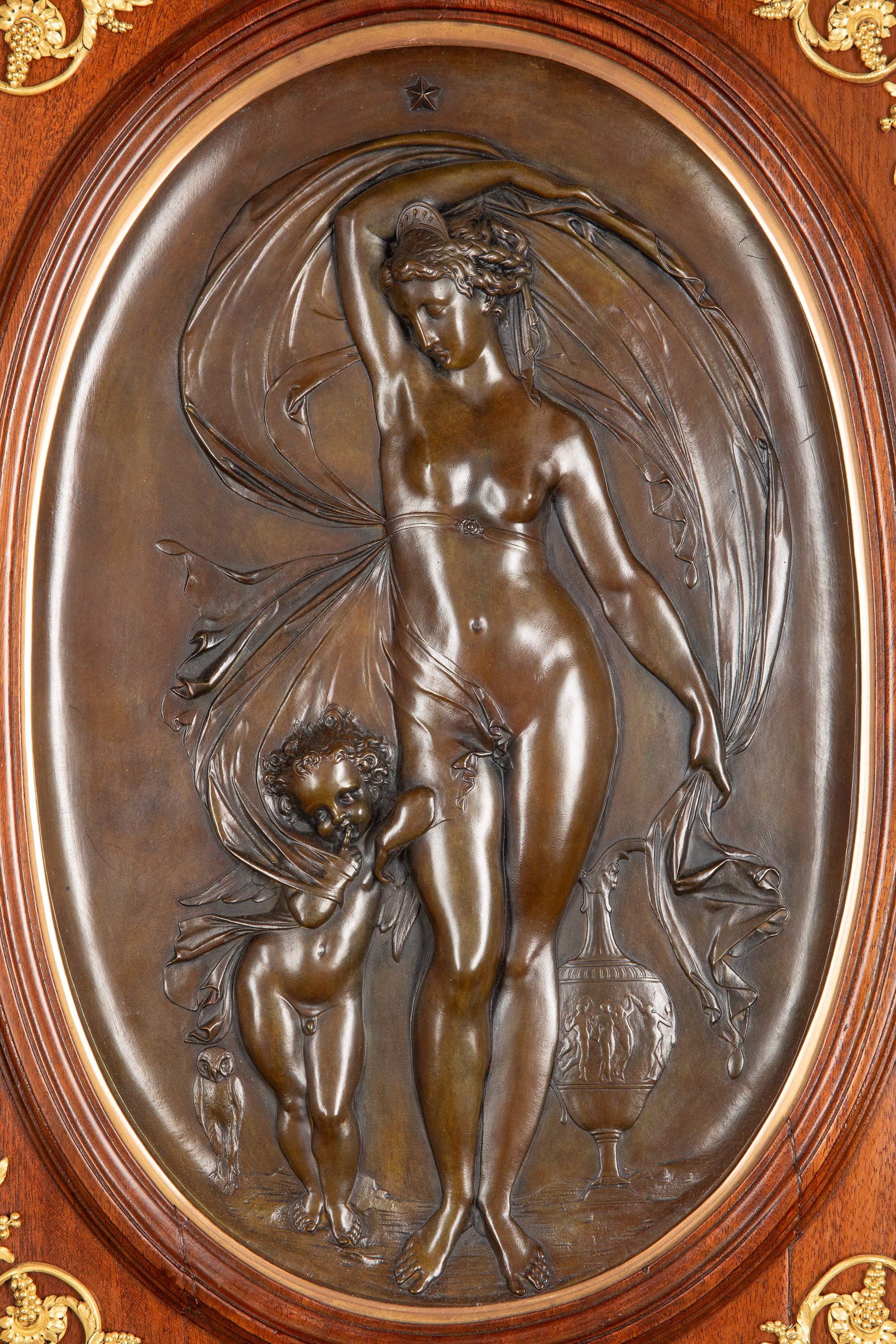19世纪法国出品卷叶纹铜鎏金精雕装饰硬木画框古典神话主题青铜浮雕壁挂画一对