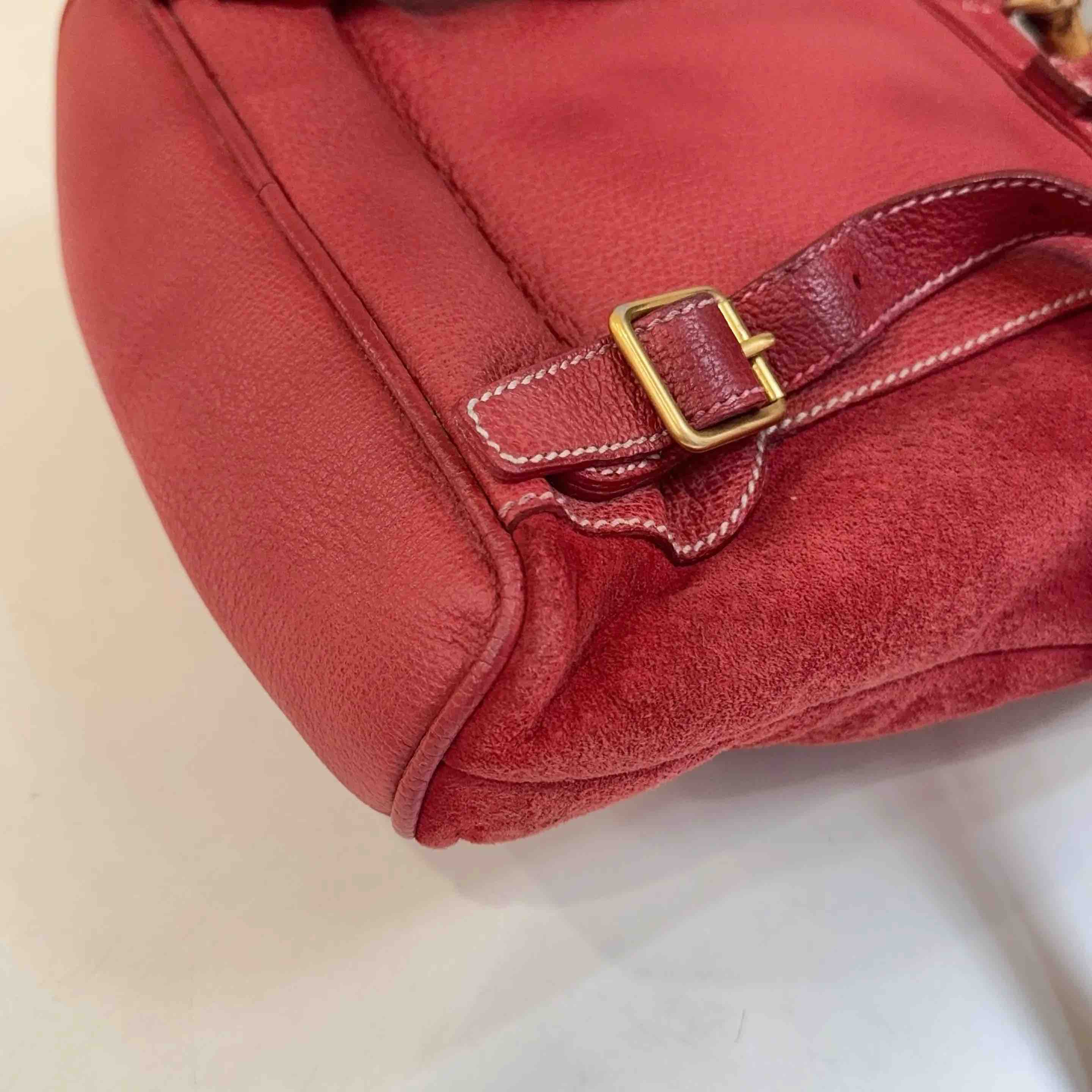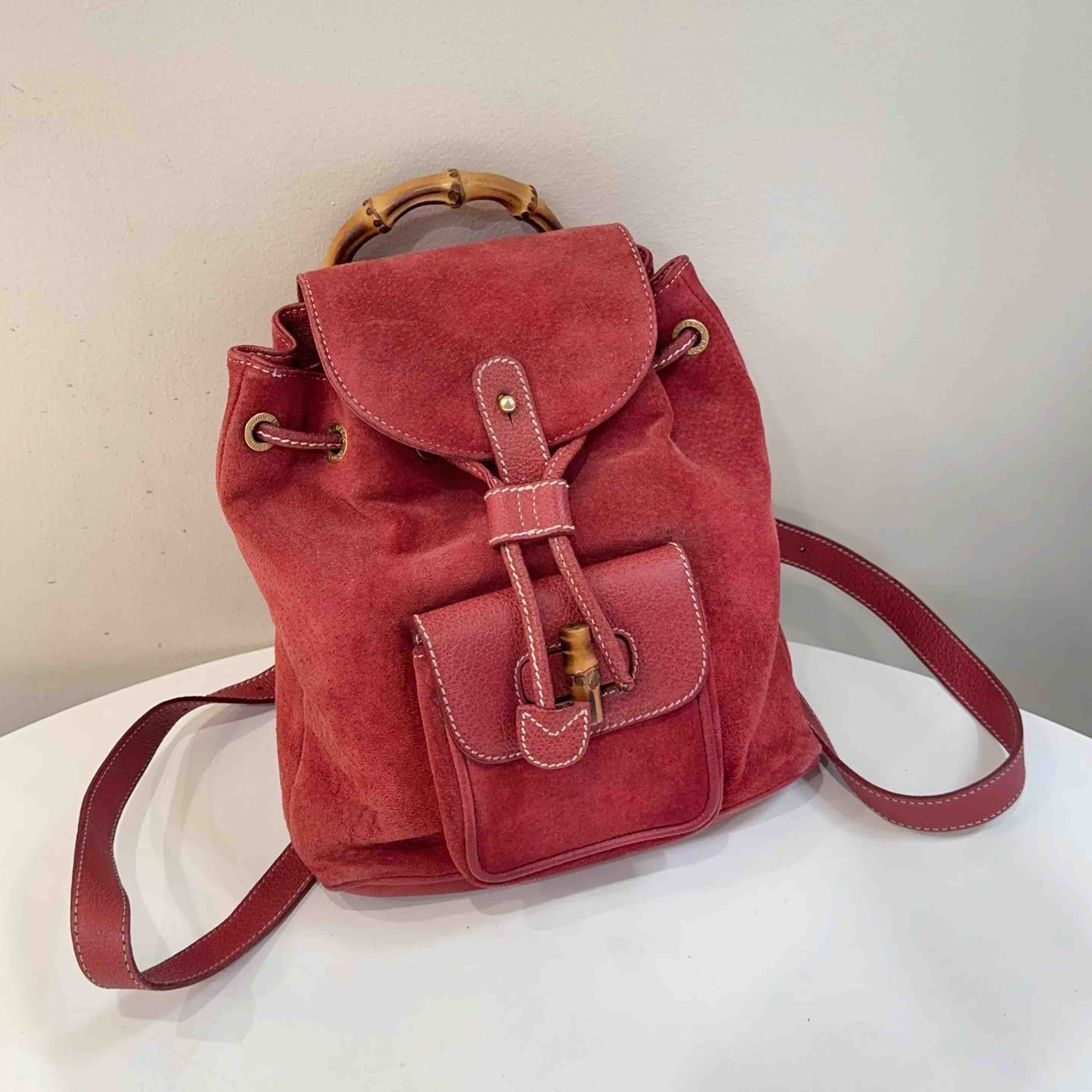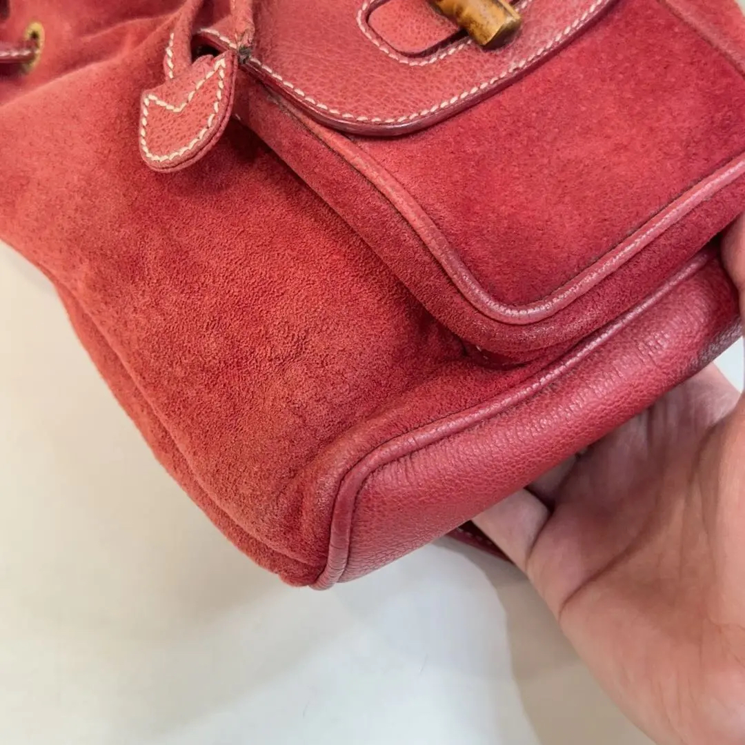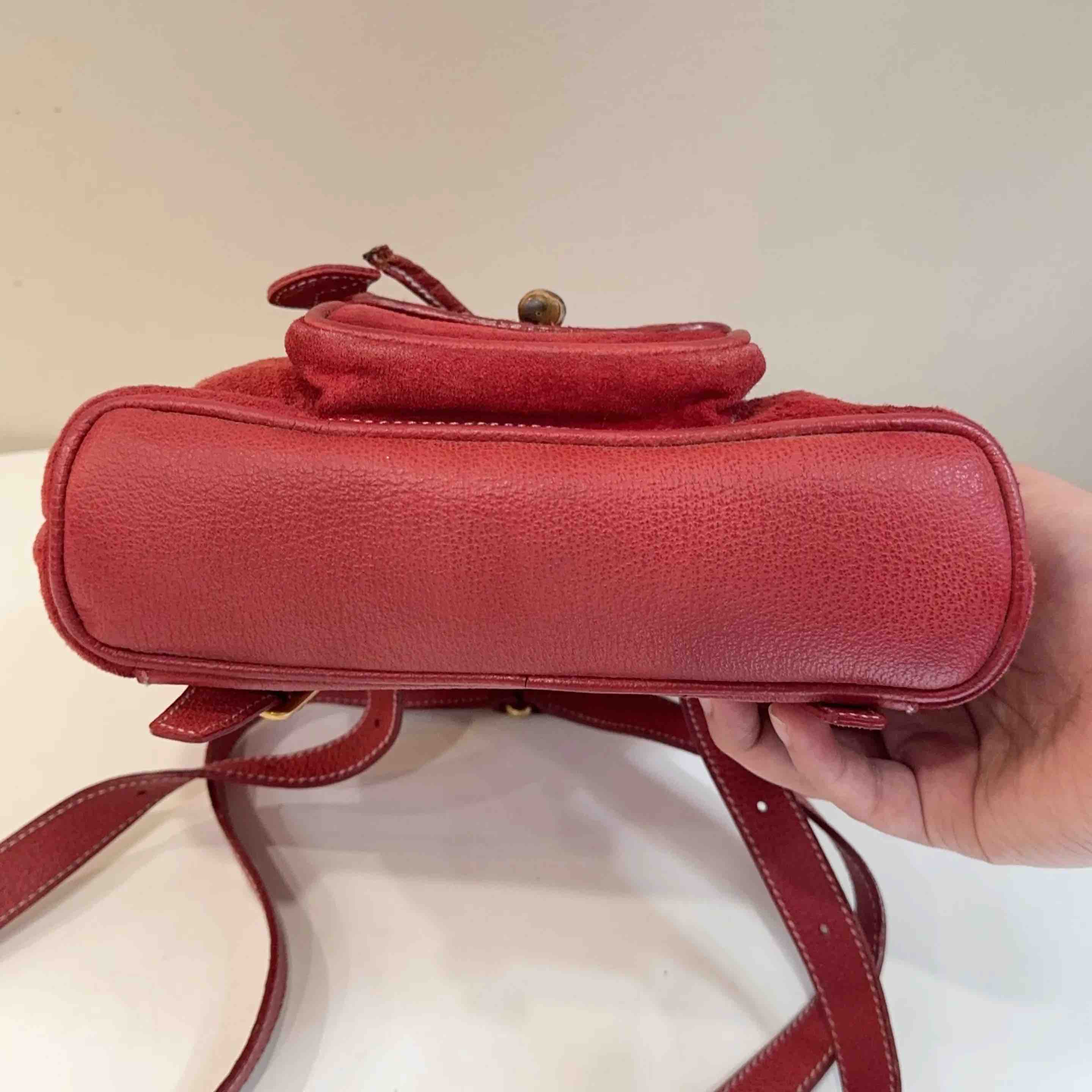 【商品详情】正品二手 Gucci 红色 麂皮 竹节 双肩包🎒95新 21*22。边角轻微使用磨擦感。中古市场超受欢迎。