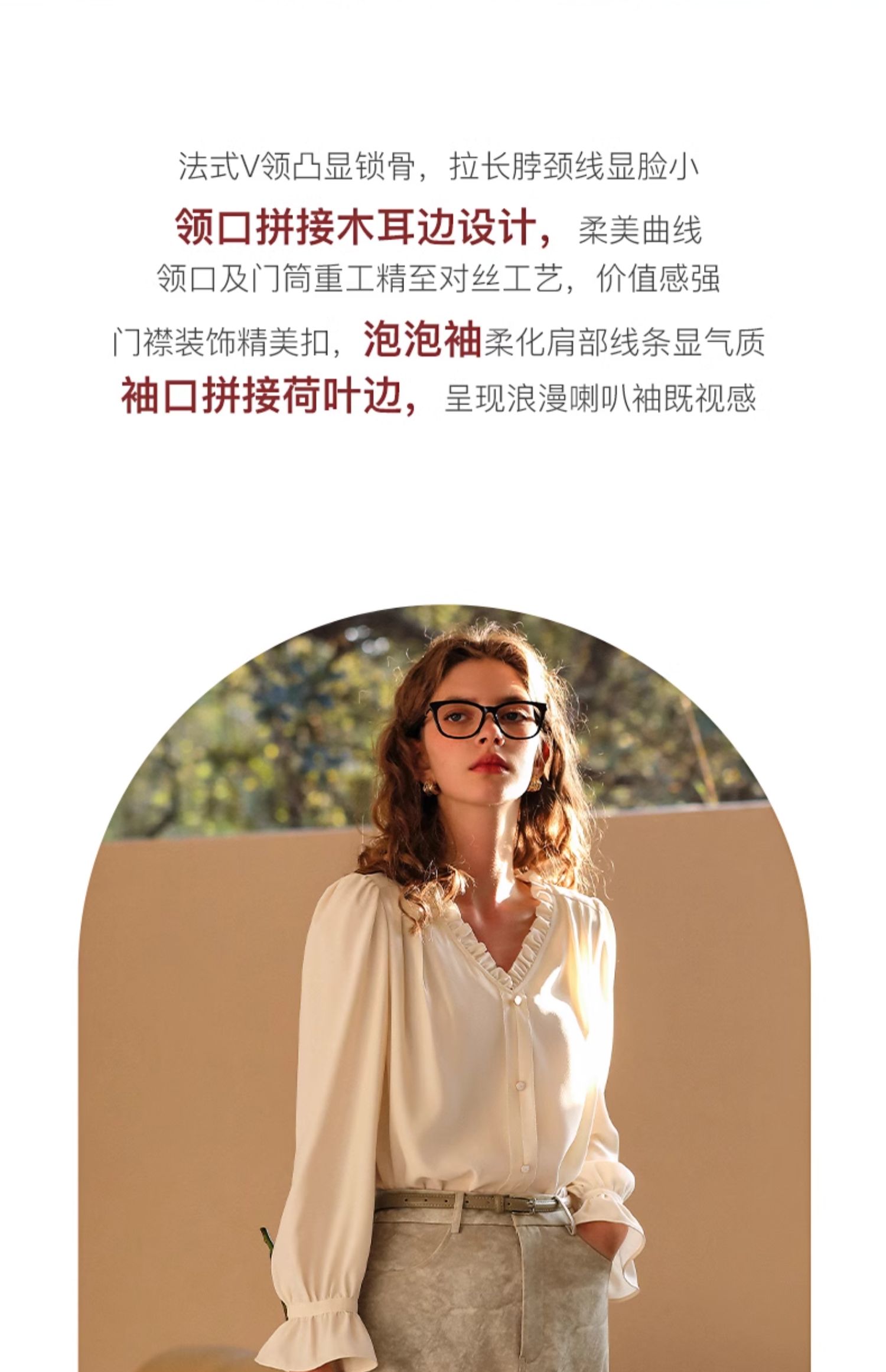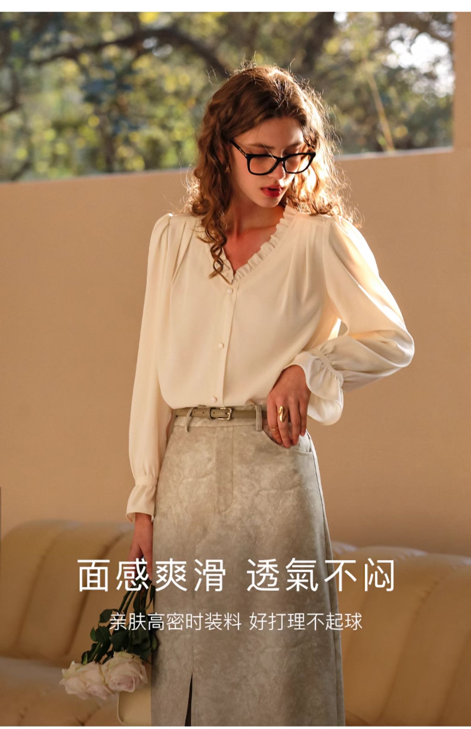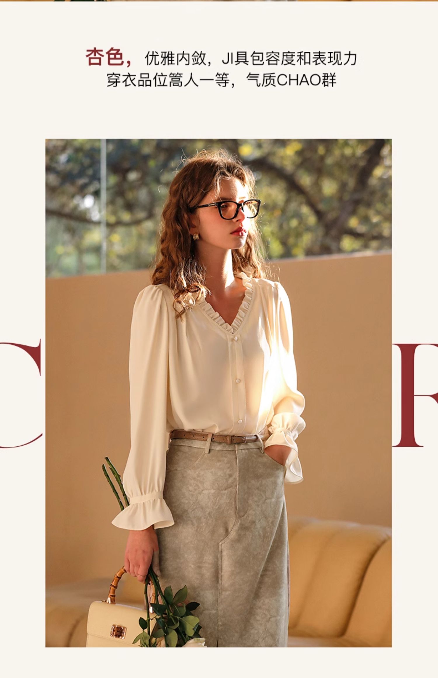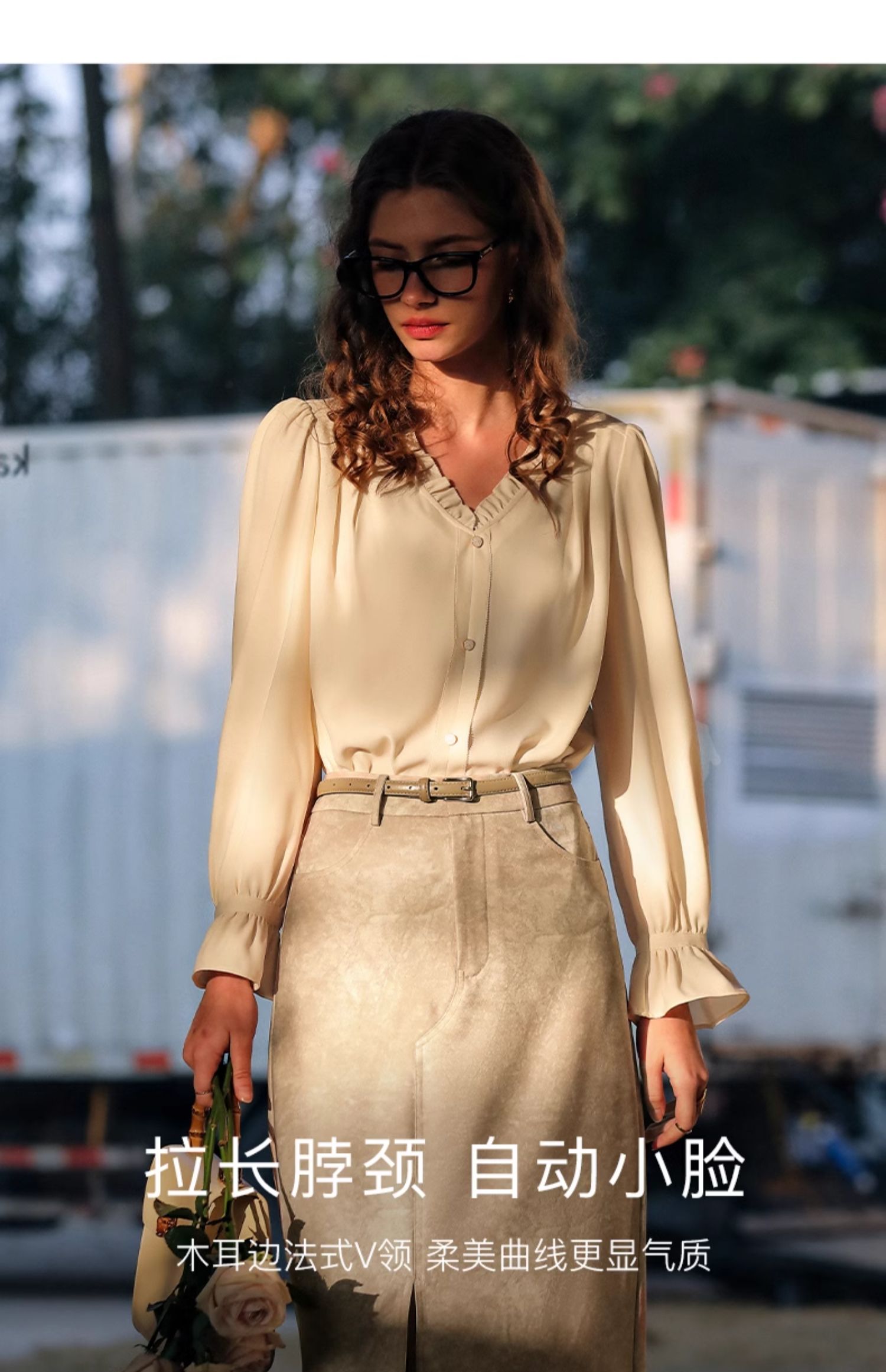 OLrain欧芮儿法式杏色雪纺衫女夏季2024年新款气质荷叶边V领衬衫