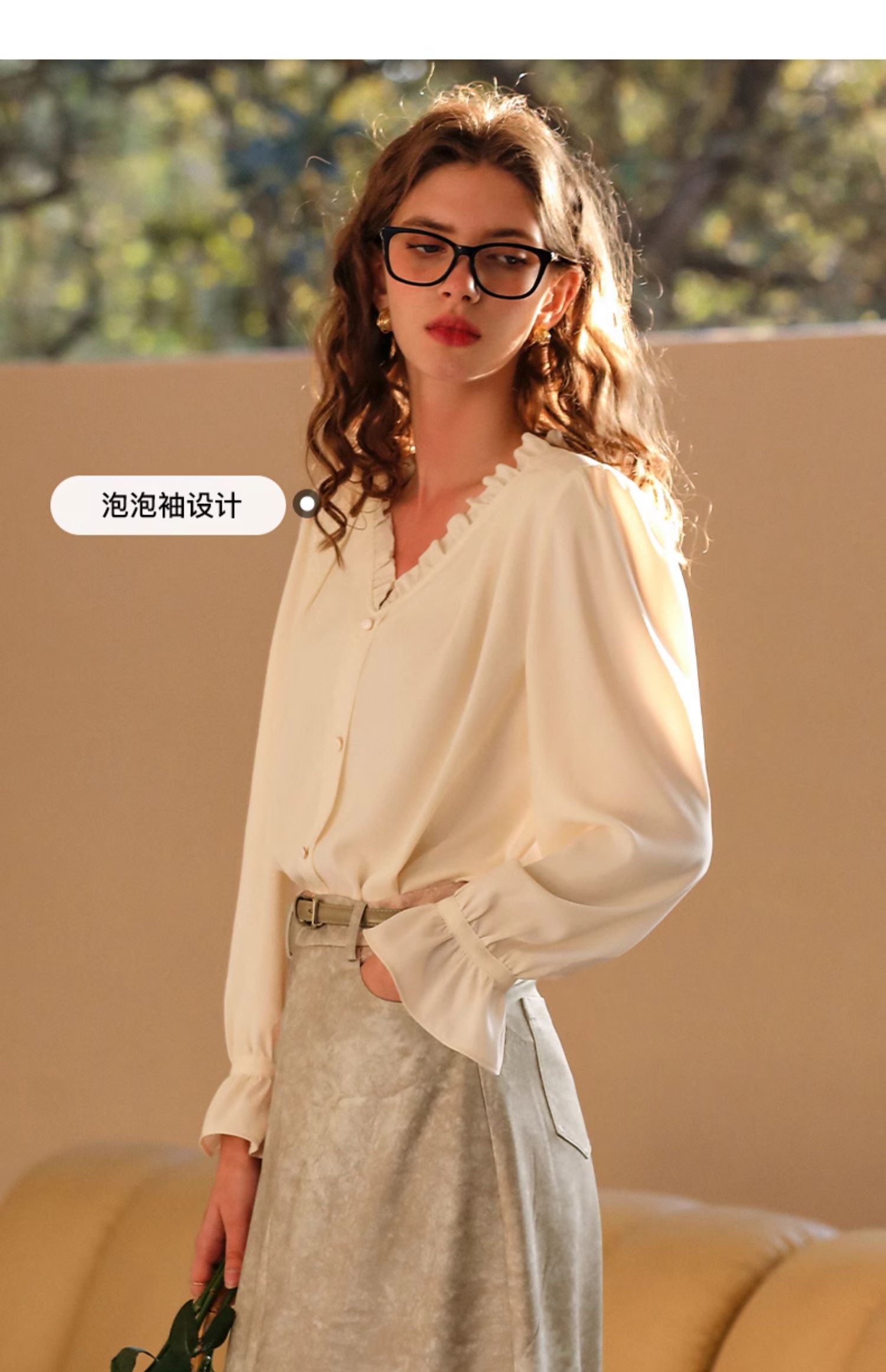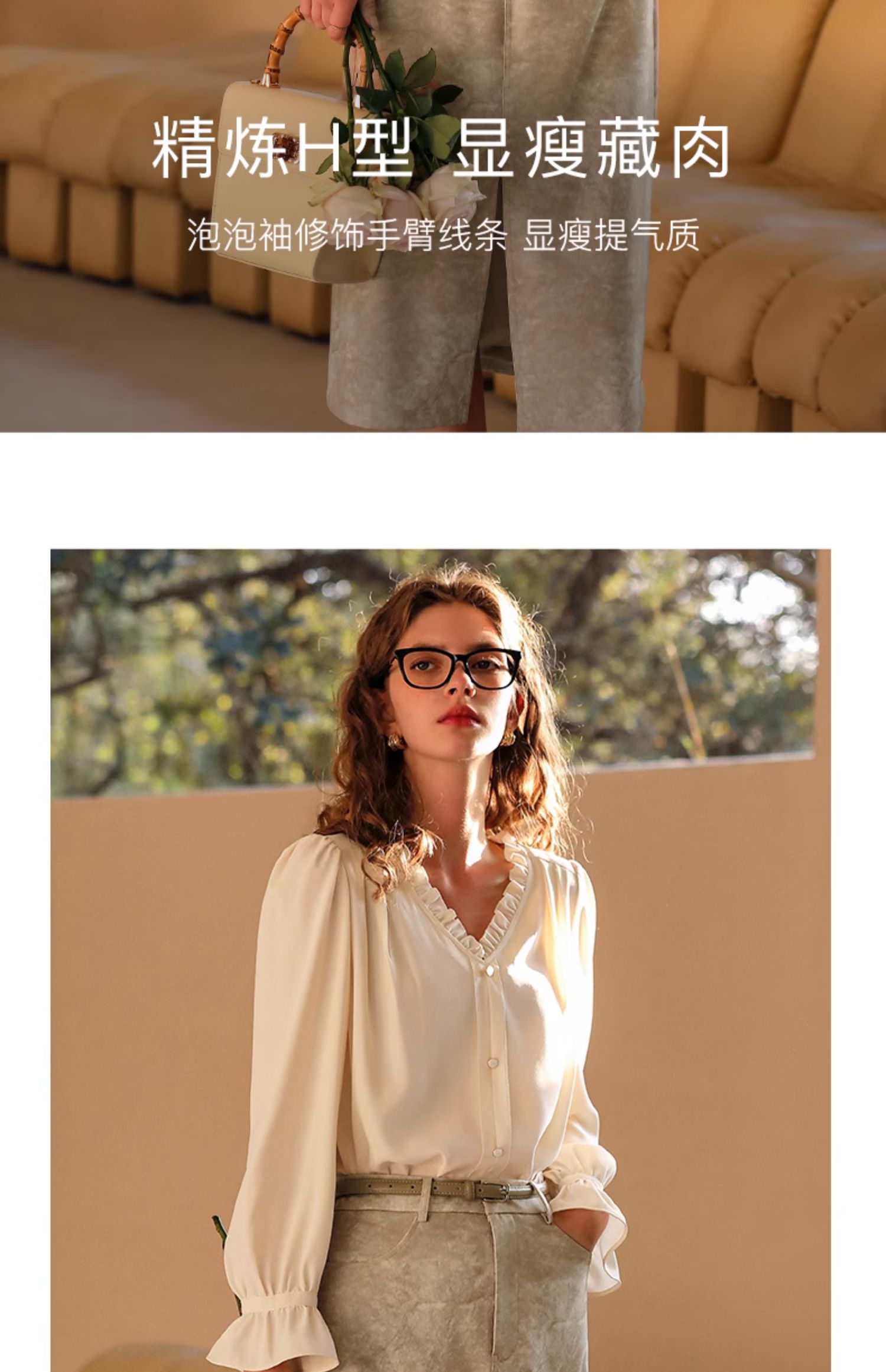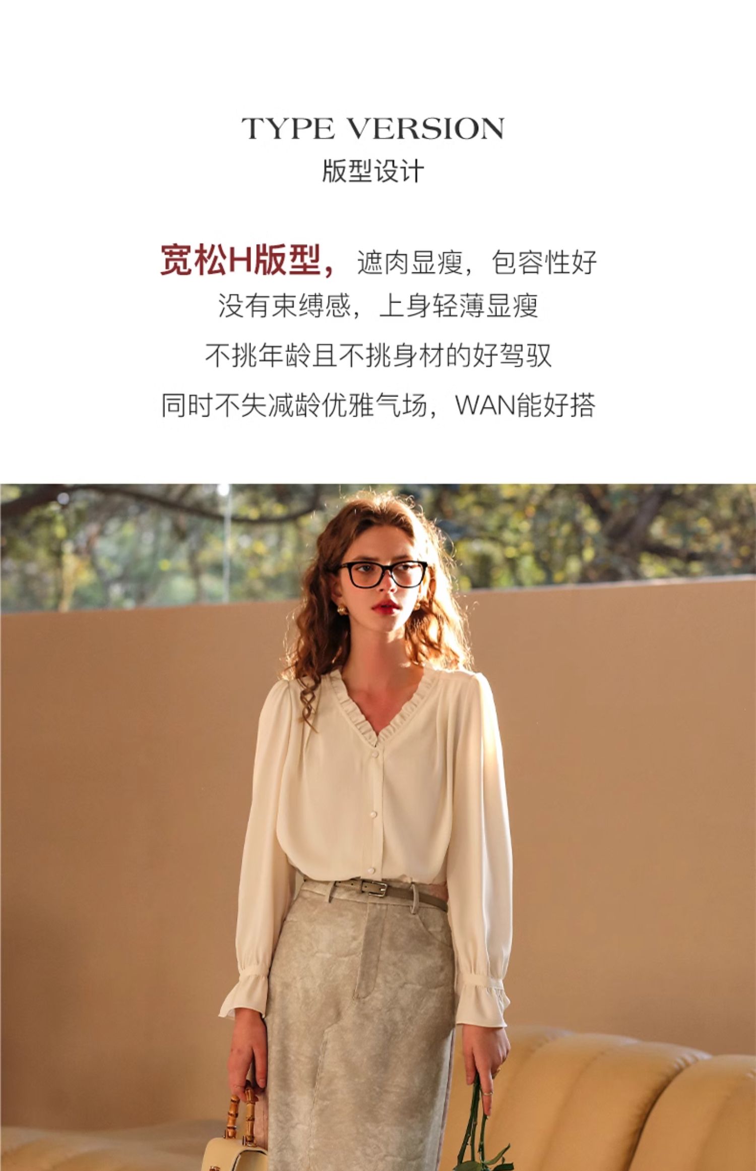 OLrain欧芮儿法式杏色雪纺衫女夏季2024年新款气质荷叶边V领衬衫
