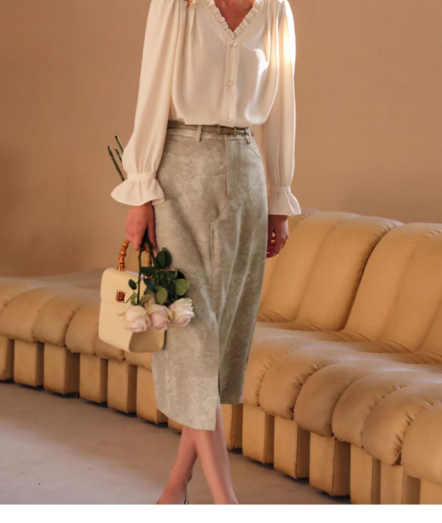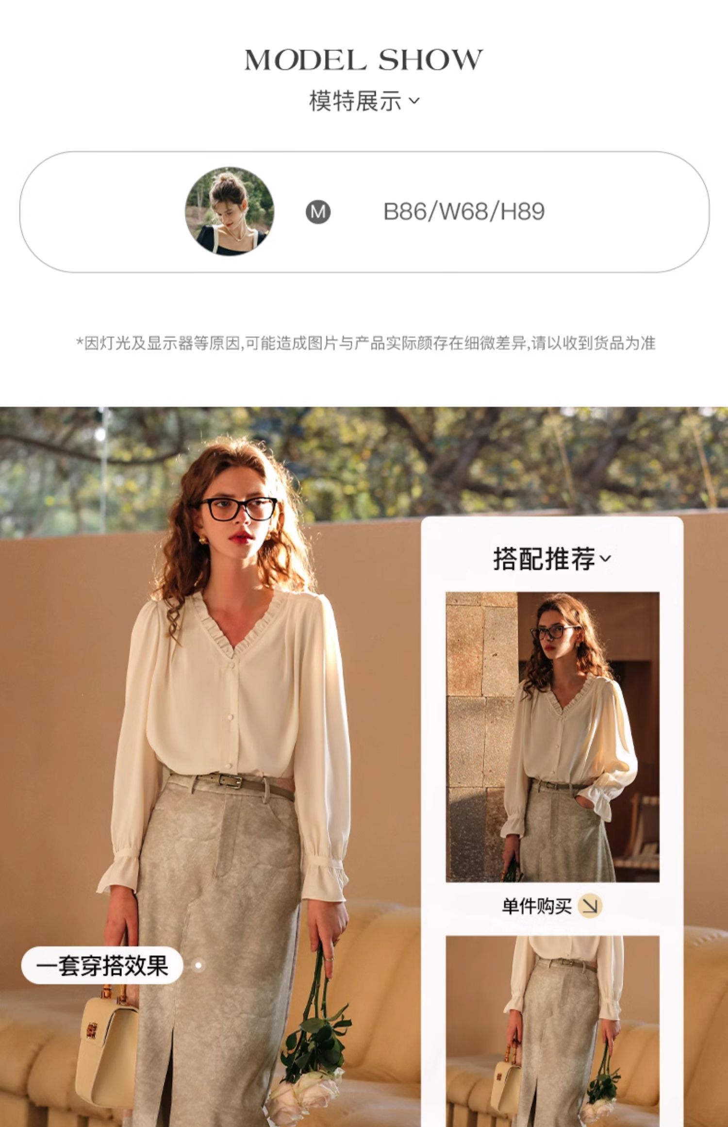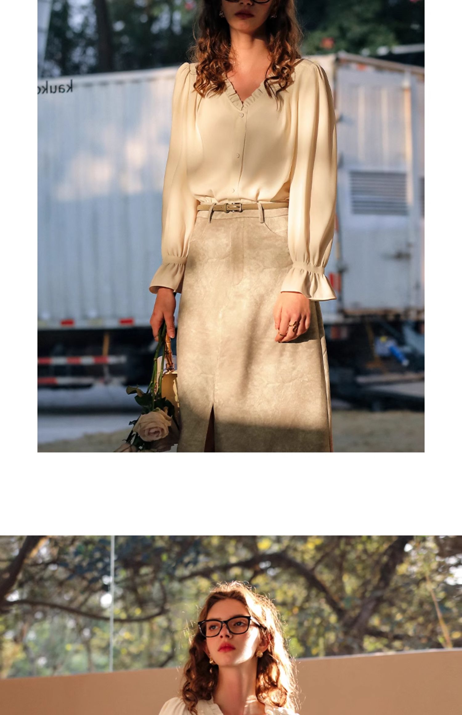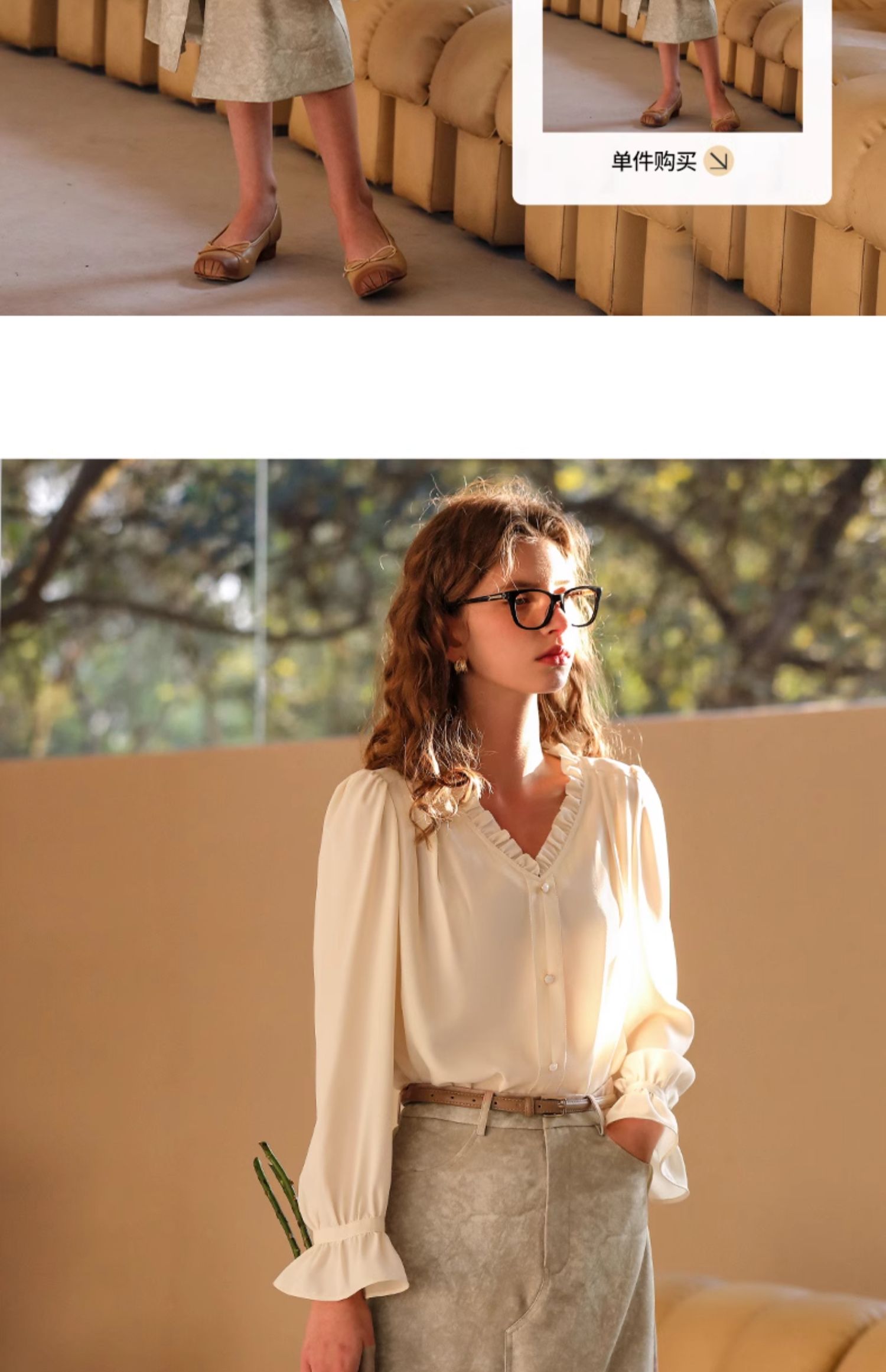 OLrain欧芮儿法式杏色雪纺衫女夏季2024年新款气质荷叶边V领衬衫