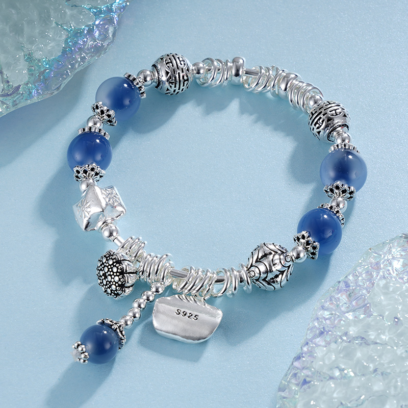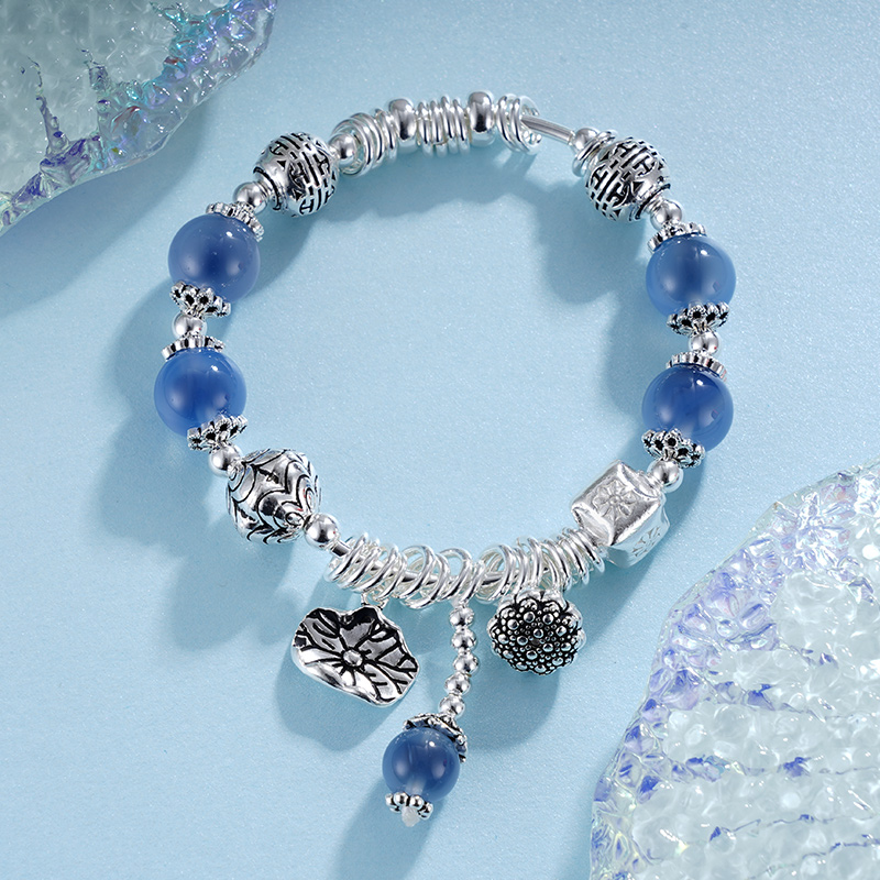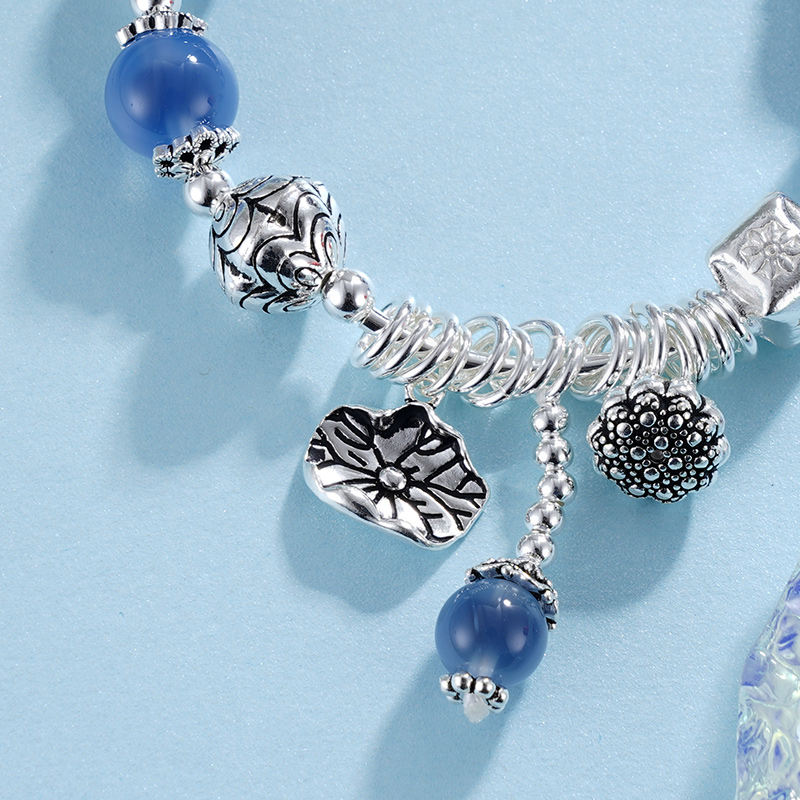 【寓意】:将晶莹剔透的糖心玛瑙精心雕琢,与纯银圆珠串联搭配,并点缀莲蓬和莲叶小坠饰,整条手链洋溢着清新甜蜜气息,寓意一见倾心,两世欢甜。