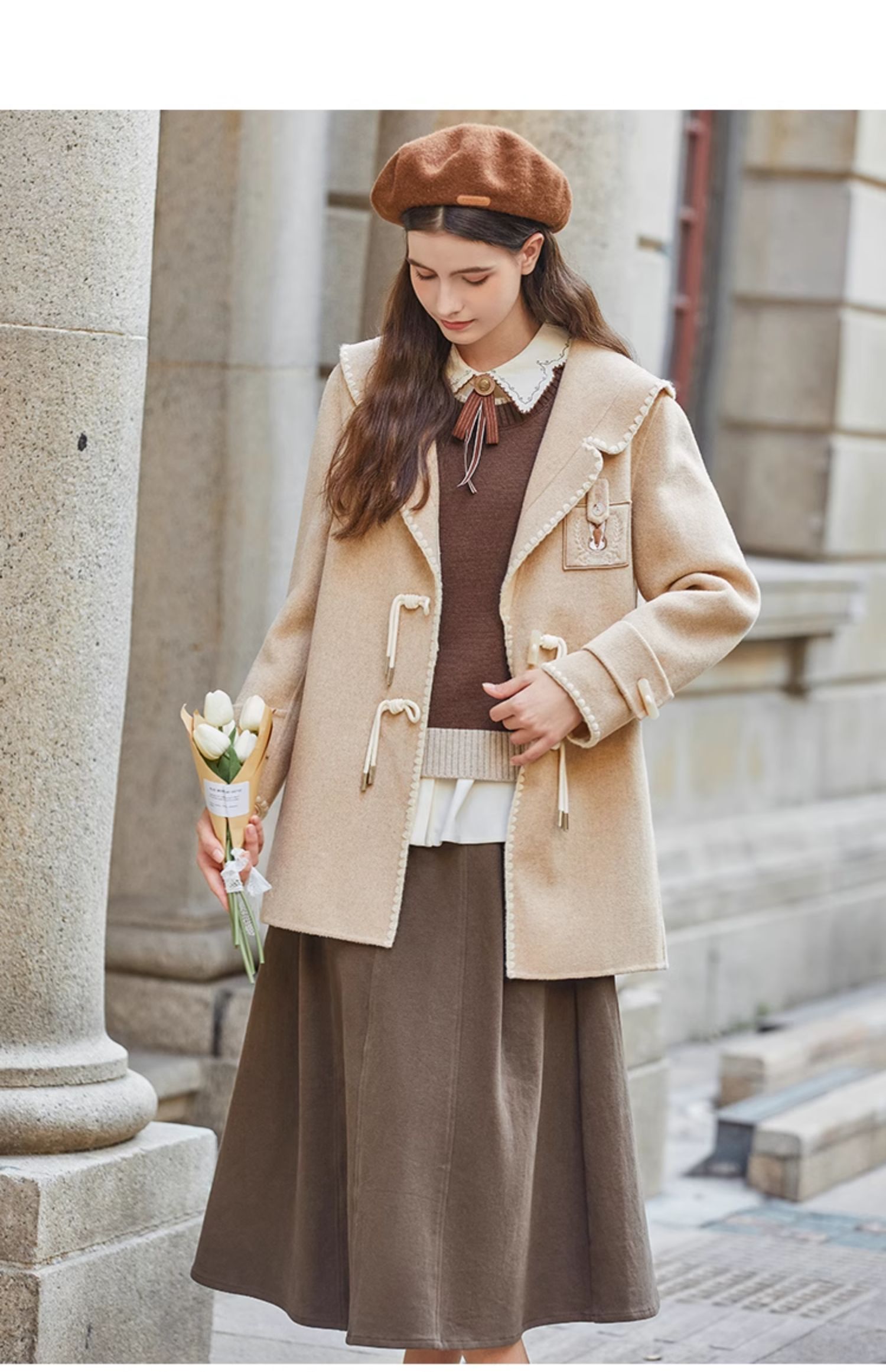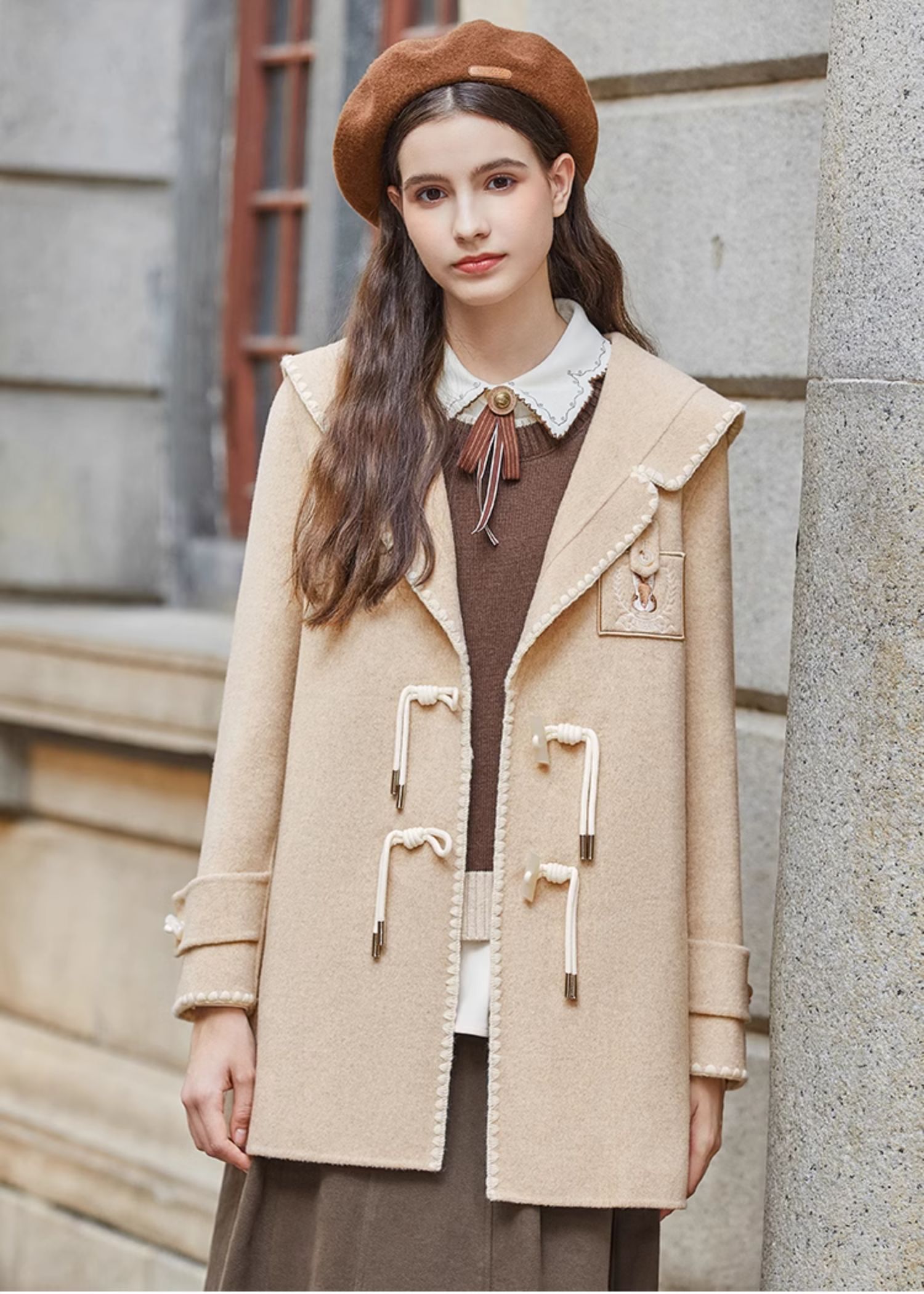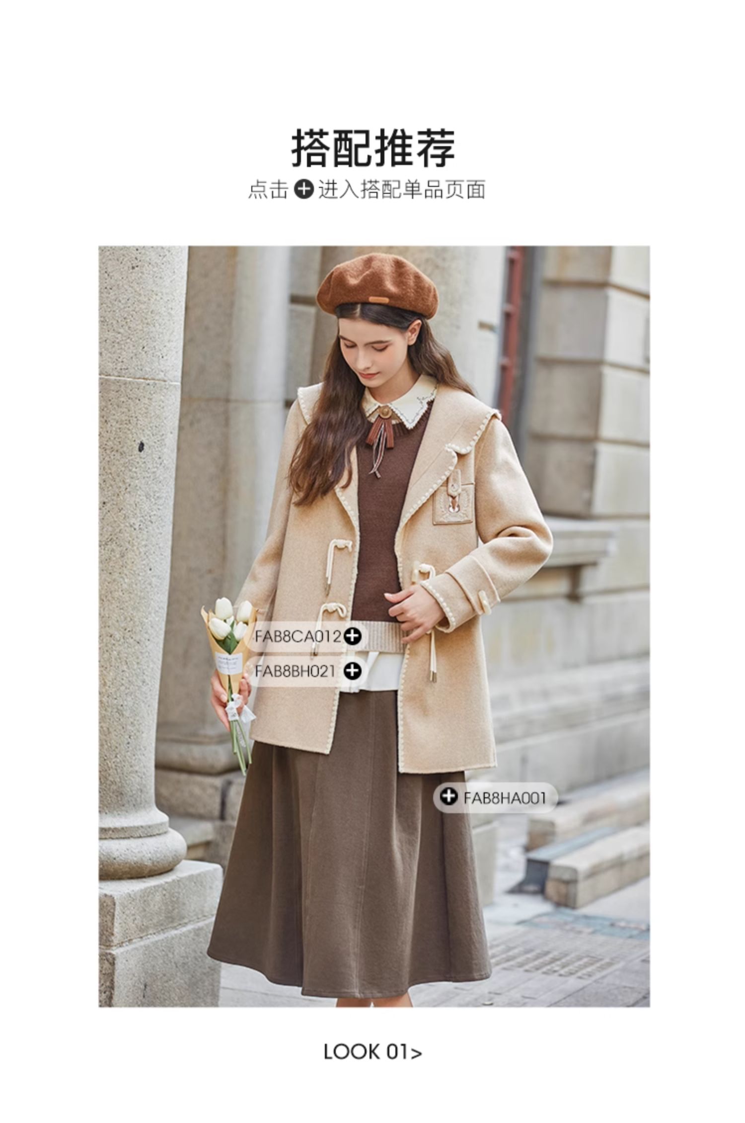 Famecoco兔子刺绣牛角扣学院风大衣外套女FAB8AS020