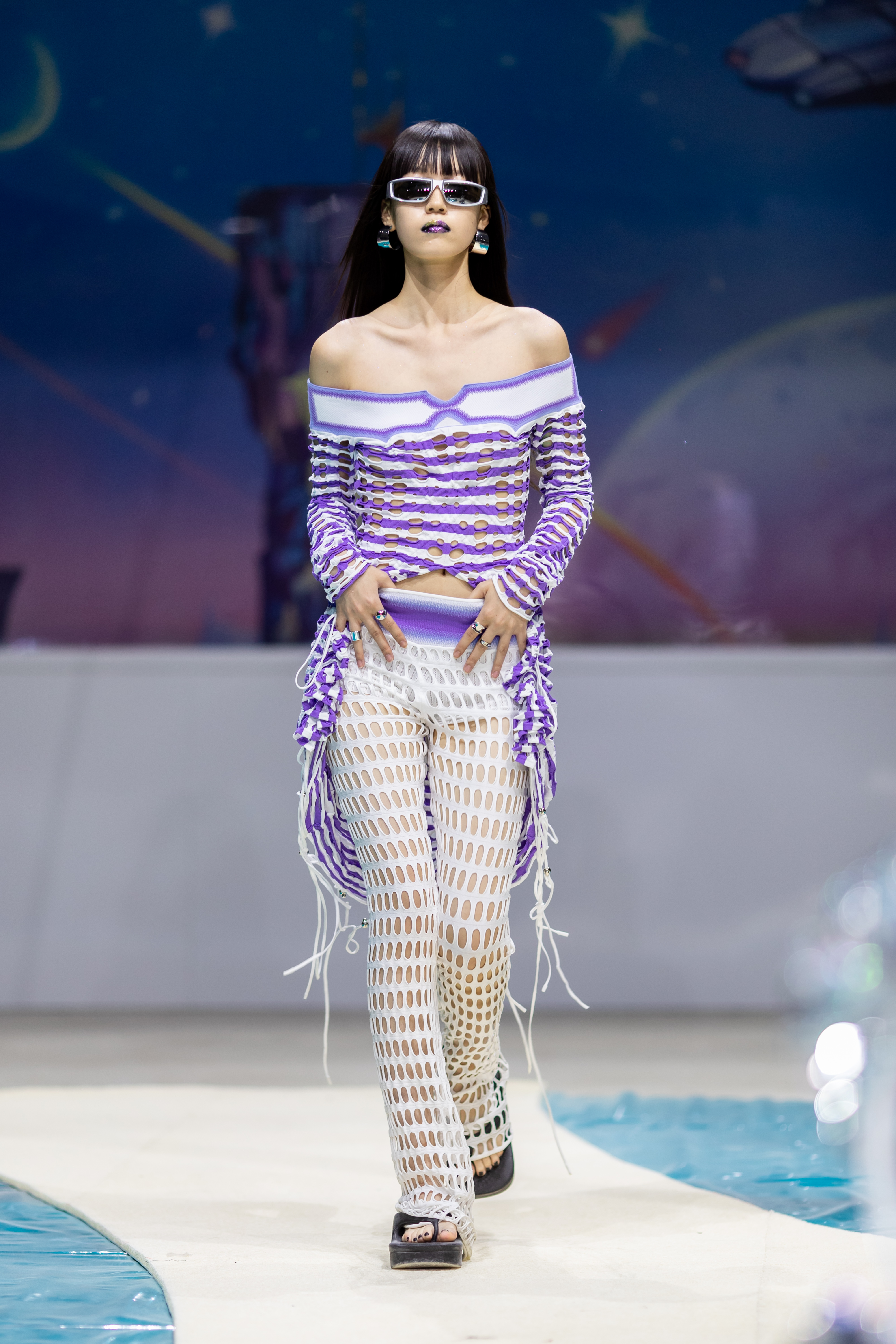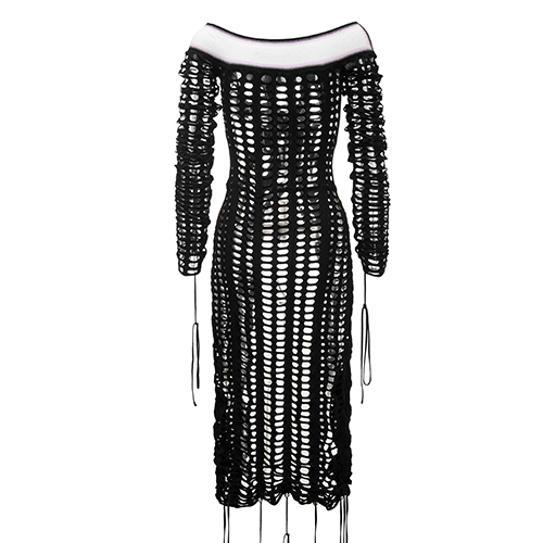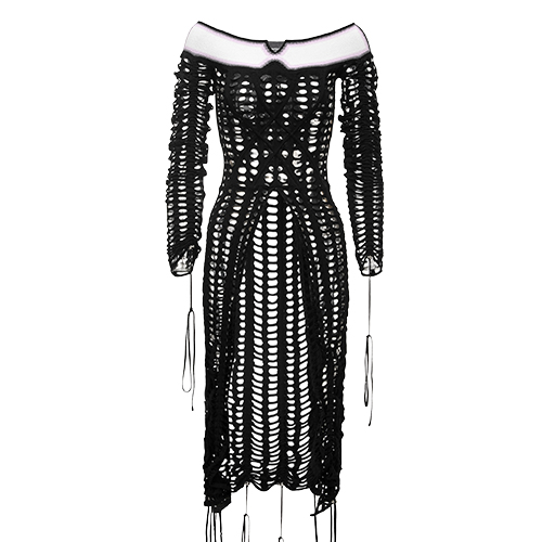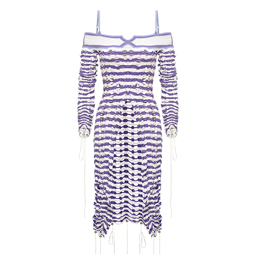 描 述:孔眼一字领连衣裙,胸前装饰几何渐变,保留品牌特色,开衩 到腰布的设计,可以搭配长裤