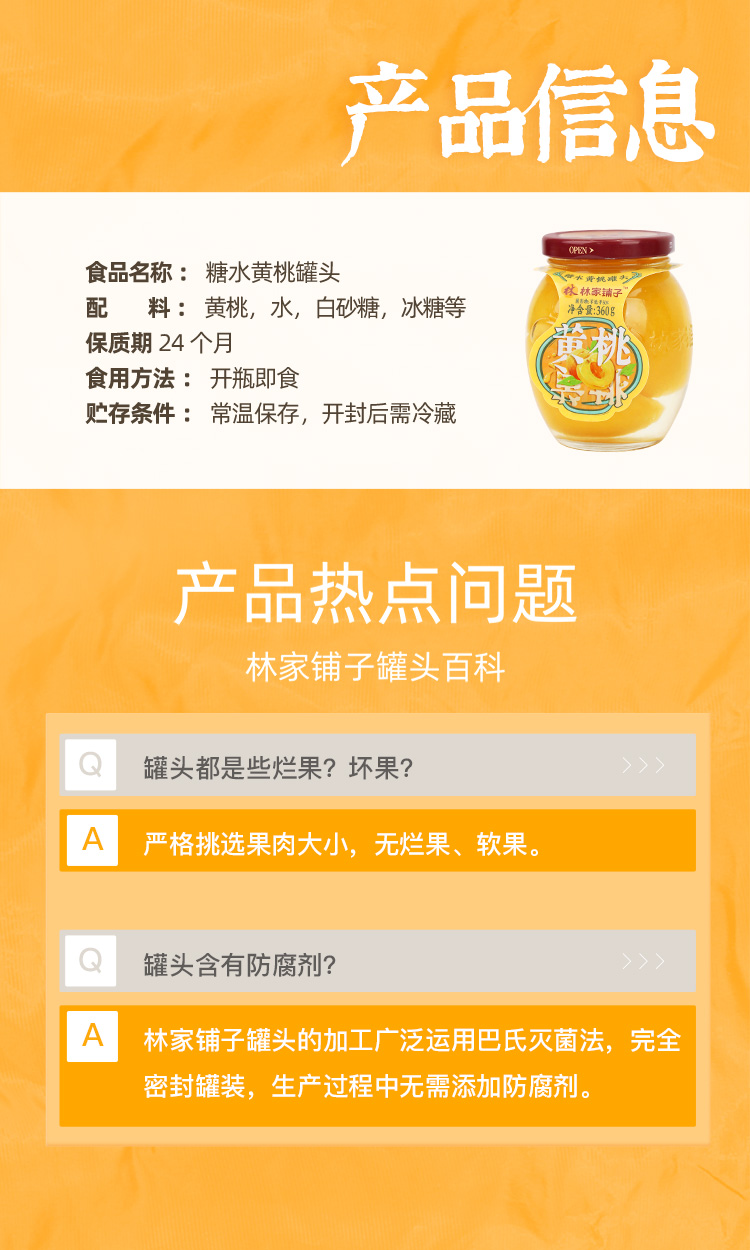林家铺子糖水黄桃罐头玻璃罐360g*6罐