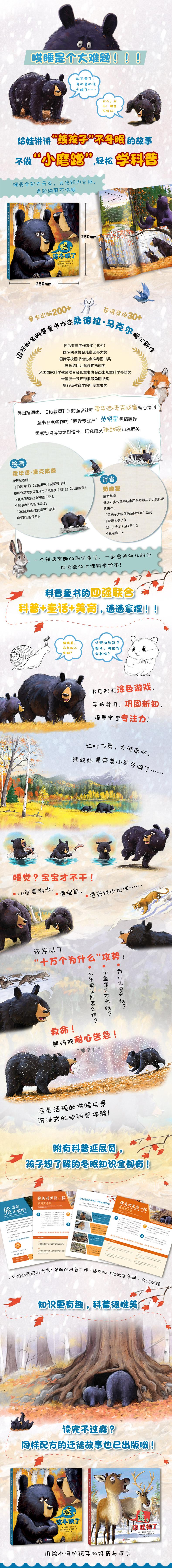 ·科普与绘本的巧妙结合,沉浸式的知识体验 本书以“小熊不冬眠”为故事主线,有趣生动地展开黑熊冬眠的知识,并结合森林里其他的动物普及科普知识。色彩靓丽的绘本里藏有超20个动物冬眠的知识点,潜移默化、由浅入深地打下科普基础 ·百万畅销书作者、多料大奖获得者、国际科普作家暖心新作 本书的作者是美国知名科普作家桑德拉,获得超过30项大奖,她的代表作《如果你有动物尾巴》畅销百万册 ·国家动物博物馆副馆长逐字审核,专业严谨 作为科普绘本,本书在专业领域毫不含糊,邀请国家动物博物馆副馆长、研究馆员张劲硕审读,细节入手,力求给孩子提供专业严谨的知识,有趣丰富的故事 ·唯美插图,细腻生动,美育熏陶从细节入手 美,是绘本的基础。本书的插图精美、细腻,角色表情丰富、灵动,无障碍和小读者交流,使其同步感受绘本中角色的喜怒哀乐,更能从细节入手,进行美育熏陶 ·美国柯克思绘本评选组倾情推荐 ·丰富的知识拓展和互动游戏,手眼脑协调发展,吸引孩子主动探索 故事结束后,还有一些知识点归纳和拓展,把动物的生活拉近到孩子的眼前,更有代入感。尤其动物的涂色游戏,寓教于乐的同时,培养专注力
