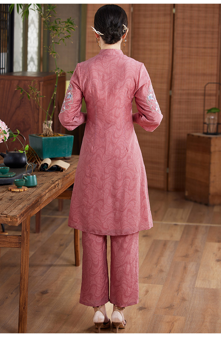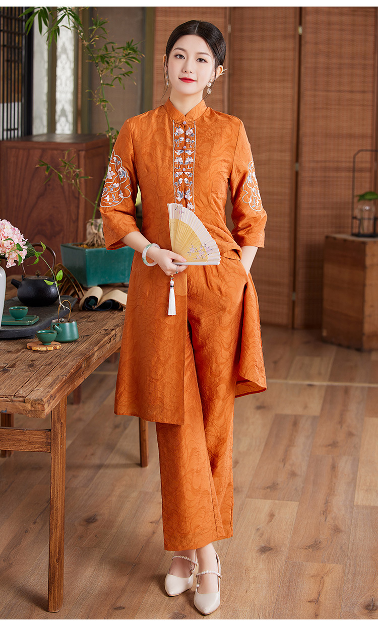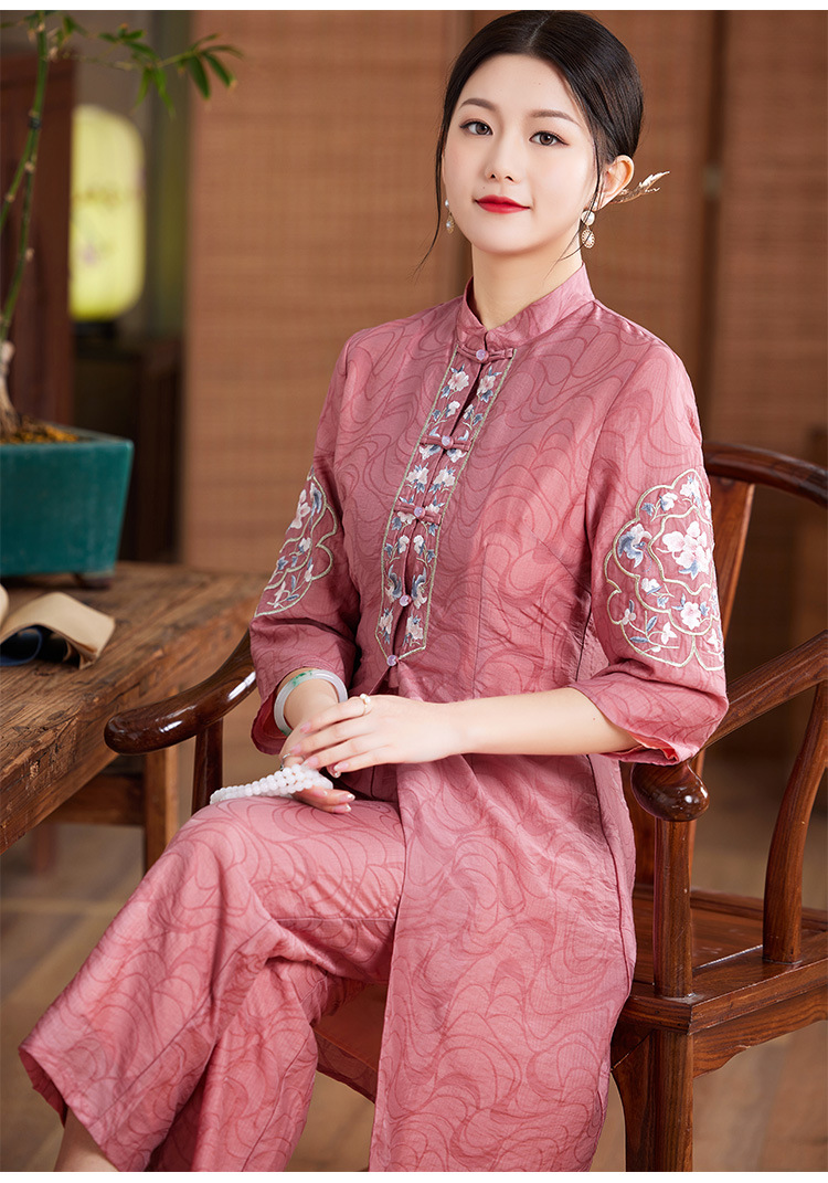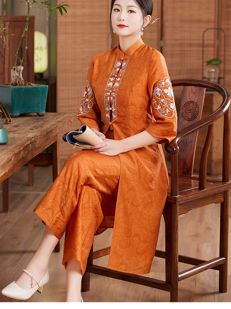 国风优雅,茶服中式绣花阔腿裤两件套KDS-2236