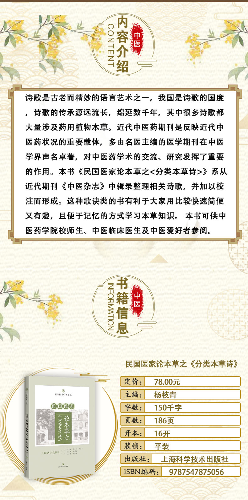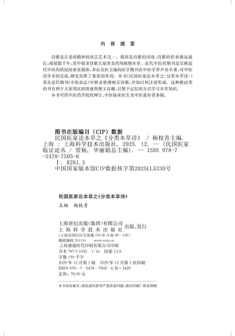 民国医家论本草之《分类本草诗》 民国医家临证论丛 杨枝青 主编 可供中医药学院校师生及中医爱好者参阅 上海科学技术出版社