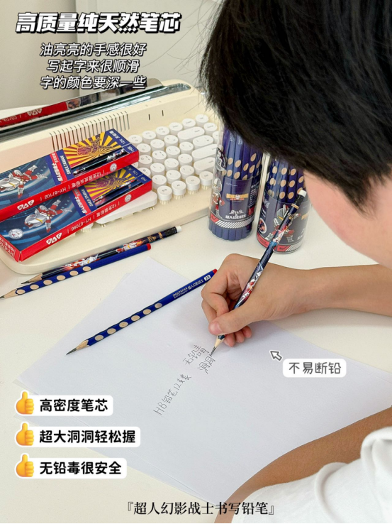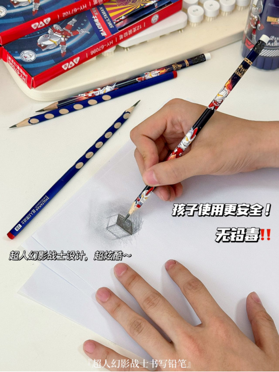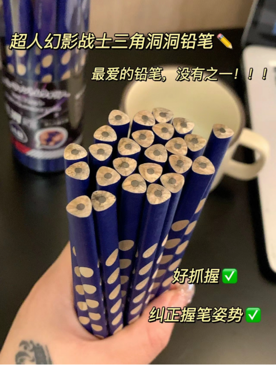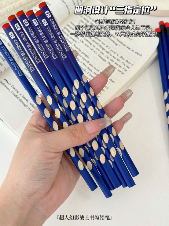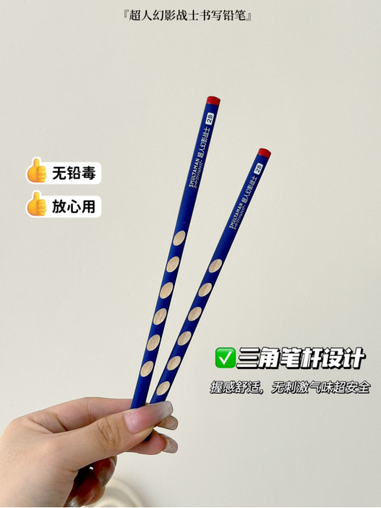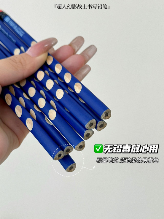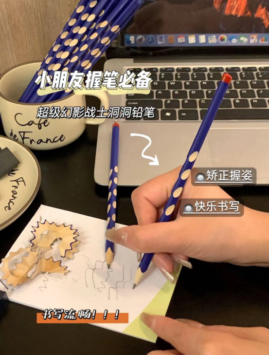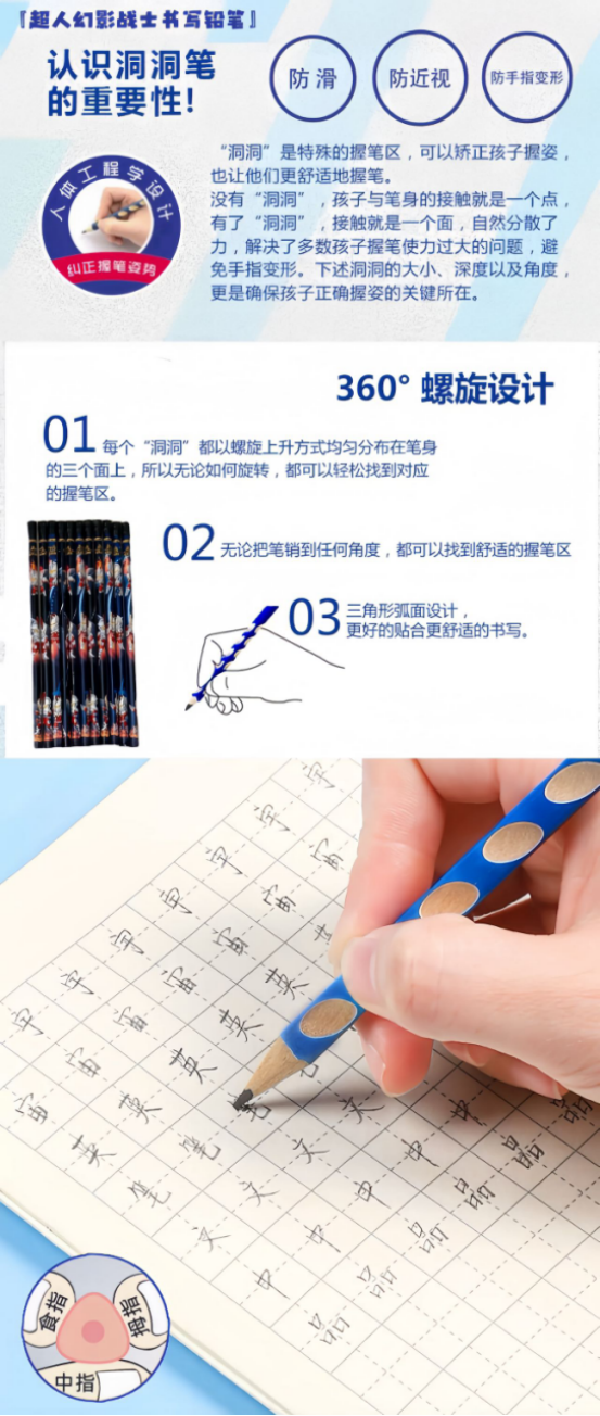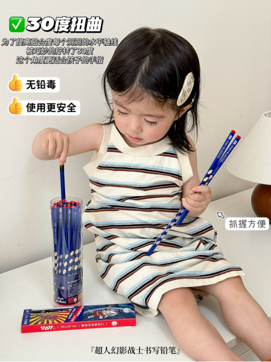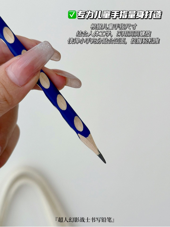 所以选择一款合适的铅笔非常重要哦~ 这款洞洞铅笔是专门为孩子养成正确的书写姿势而设计的 让孩子在轻松书写的同时,还能改善手部肌肉、手臂神经等的协调性 快速掌握正确的握笔姿势~ 而对于已经养成握笔错误姿势的孩子 更要及时纠正并且选择合适的铅笔~ 为了给娃选铅笔,我研究了很多类似产品 比较下来,还是最喜欢这款铅笔 『超人幻影战士书写铅笔』
