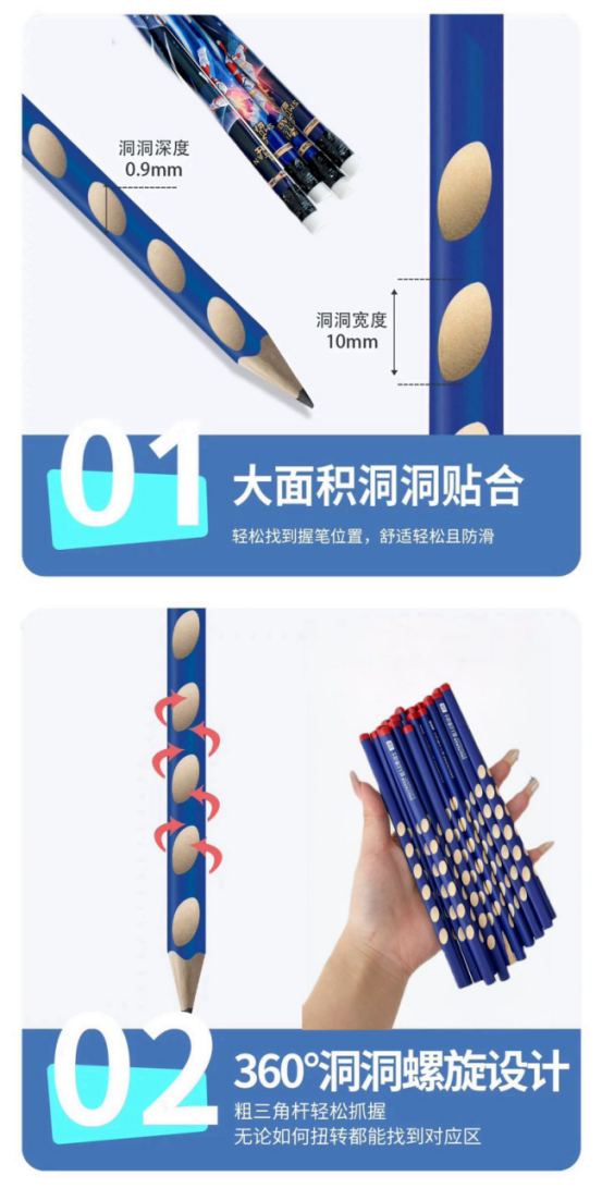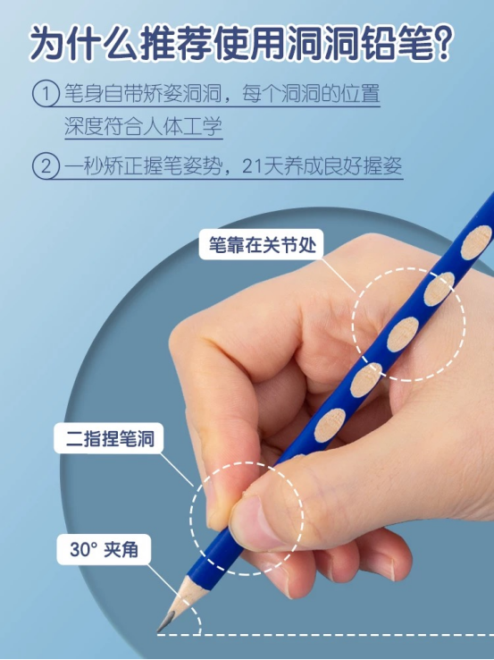 一拿就会握,迅速上手 正姿铅笔的秘密,就在笔杆自带的洞洞上 这里“洞洞”是经过设计的特殊握笔区 符合人体工学设计 握笔时,只需两指捏住洞洞✍🏻 辅助定位,标准握笔!!!