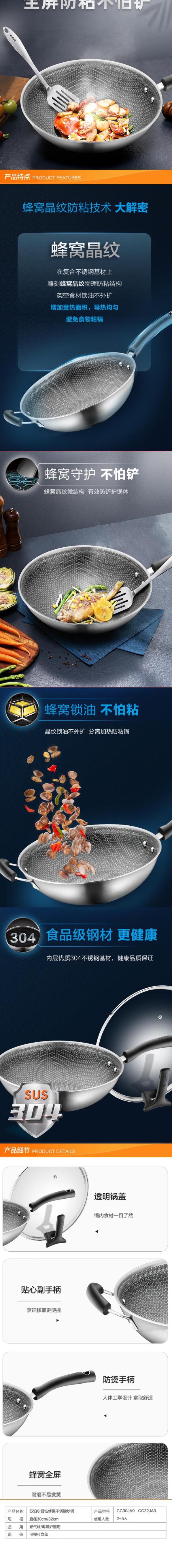 苏泊尔(510296)炒锅X晶盾蜂窝纹防粘炒锅不锈钢炒菜锅电磁炉燃气通用锅 CC32JA19