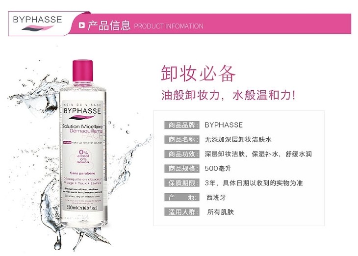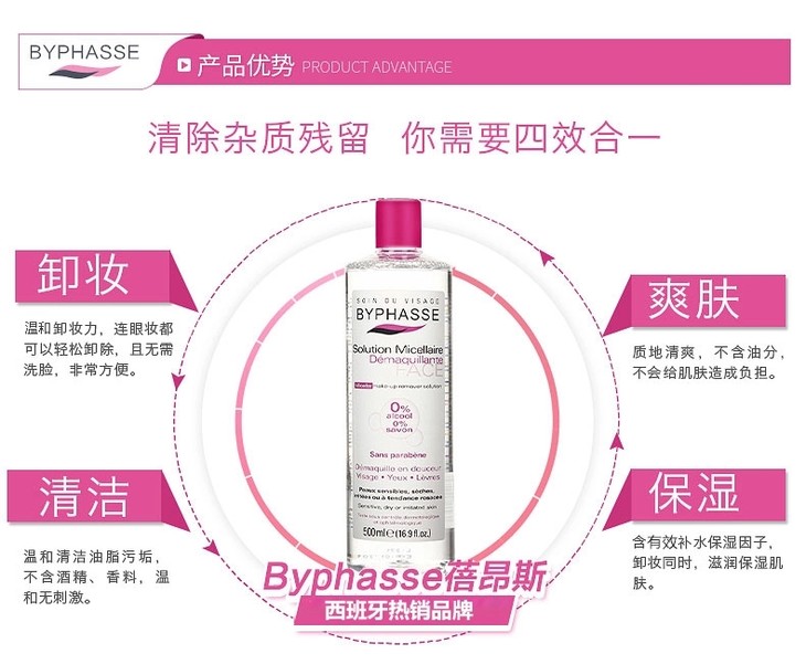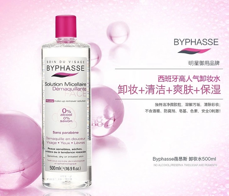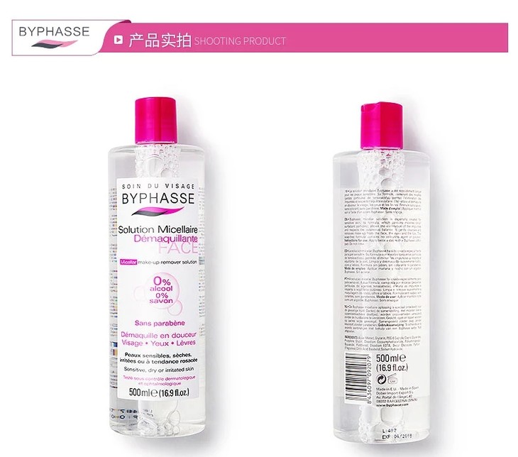 【现货】西班牙蓓昂斯卸妆水500ml/瓶BYPHASSE卸妆液唇眼部脸深层清洁保湿温和
