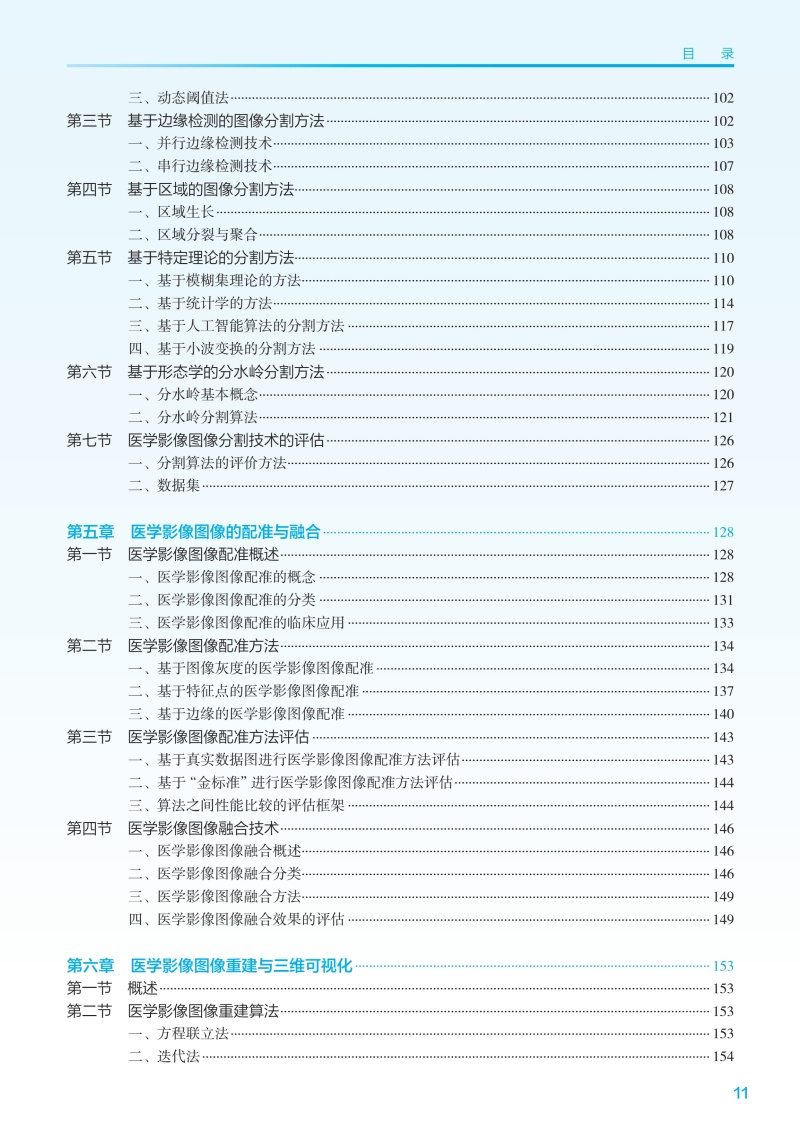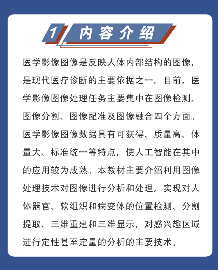 医学影像图像是反映人体内部结构的图像,是现代医疗诊断的主要依据之一。目前,医学影像图像处理任务主要集中在图像检测、图像分割、图像配准及图像融合四个方面。医学影像图像数据具有可获得、质量高、体量大、标准统一等特点,使人工智能在其中的应用较为成熟。本教材主要介绍利用图像处理技术对图像进行分析和处理,实现对人体器官、软组织和病变体的位置检测、分割提取、三维重建和三维显示,对感兴趣区域进行定性甚至定量的分析的主要技术。