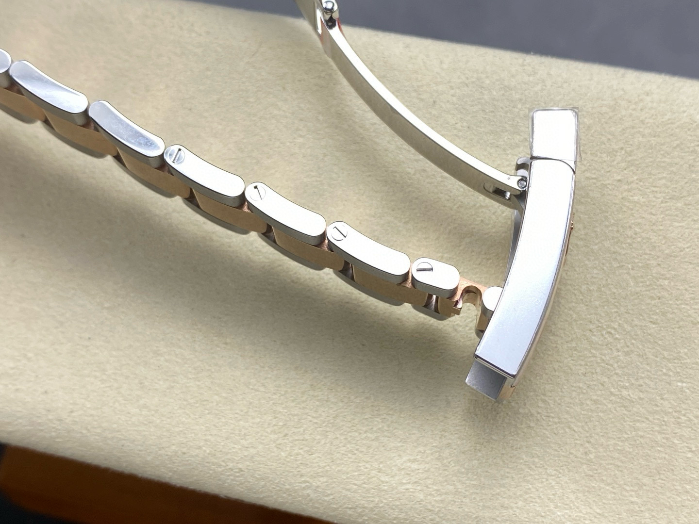 • 表带经过三次抛光打磨,触感细腻,佩戴时不会有割手感。活动顺滑度 经过微调,不会夹手,也不会过于松散,长时间佩戴依然舒适。表扣的开合力度精准,不会松垮但也不会过紧。