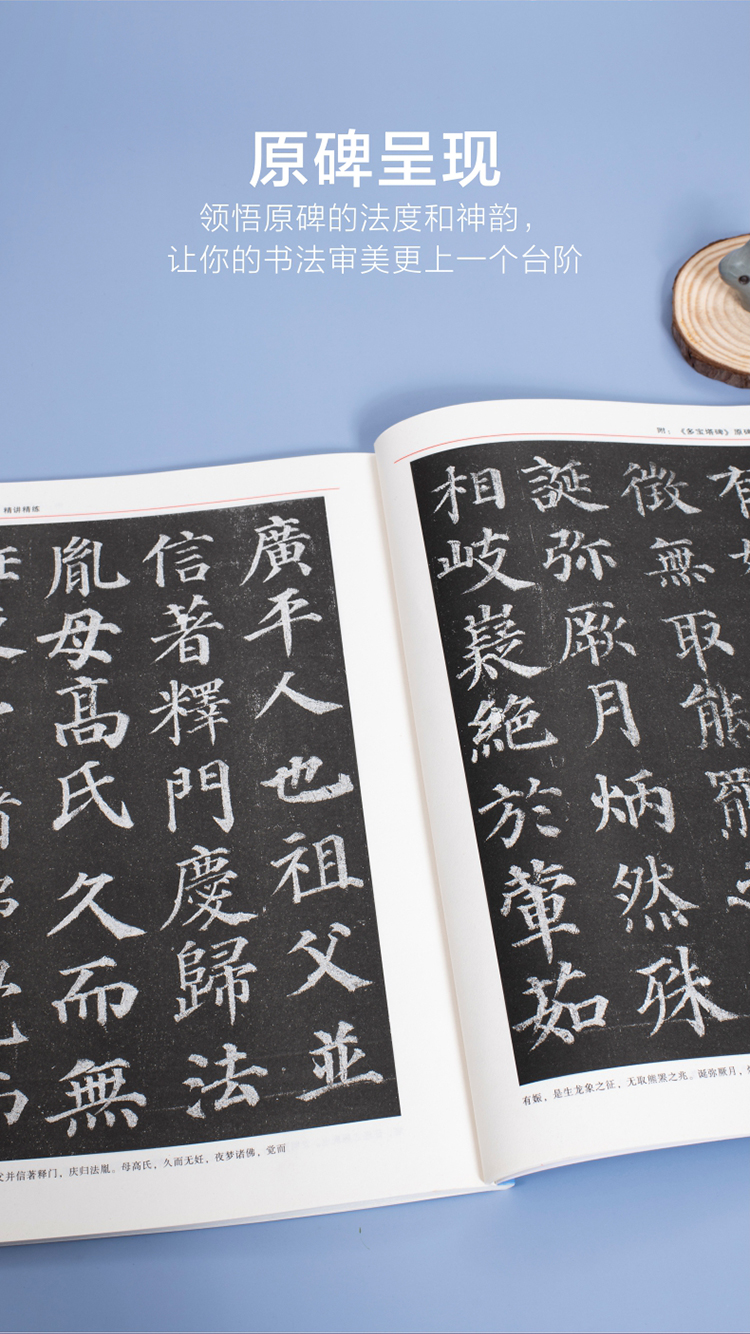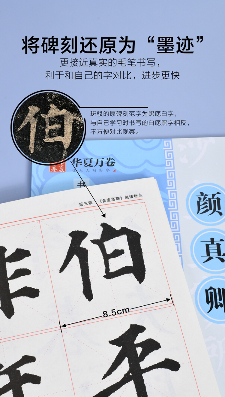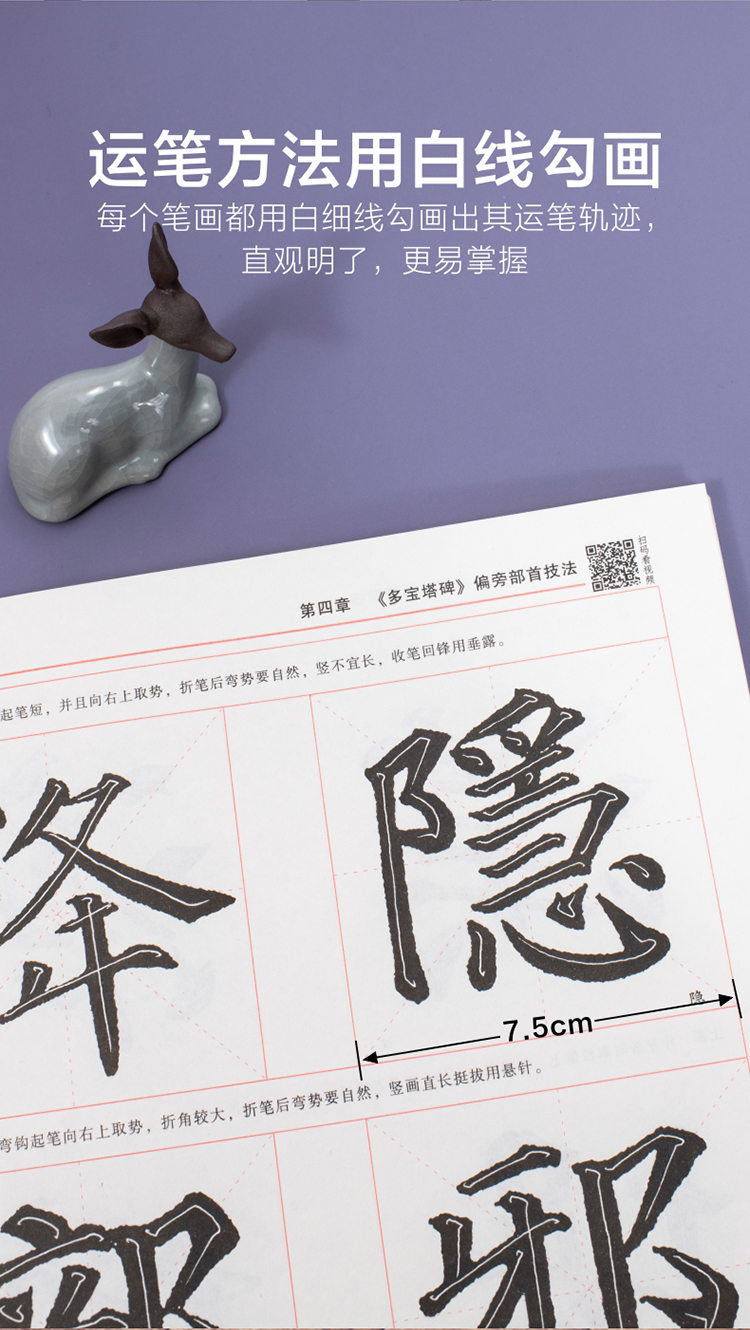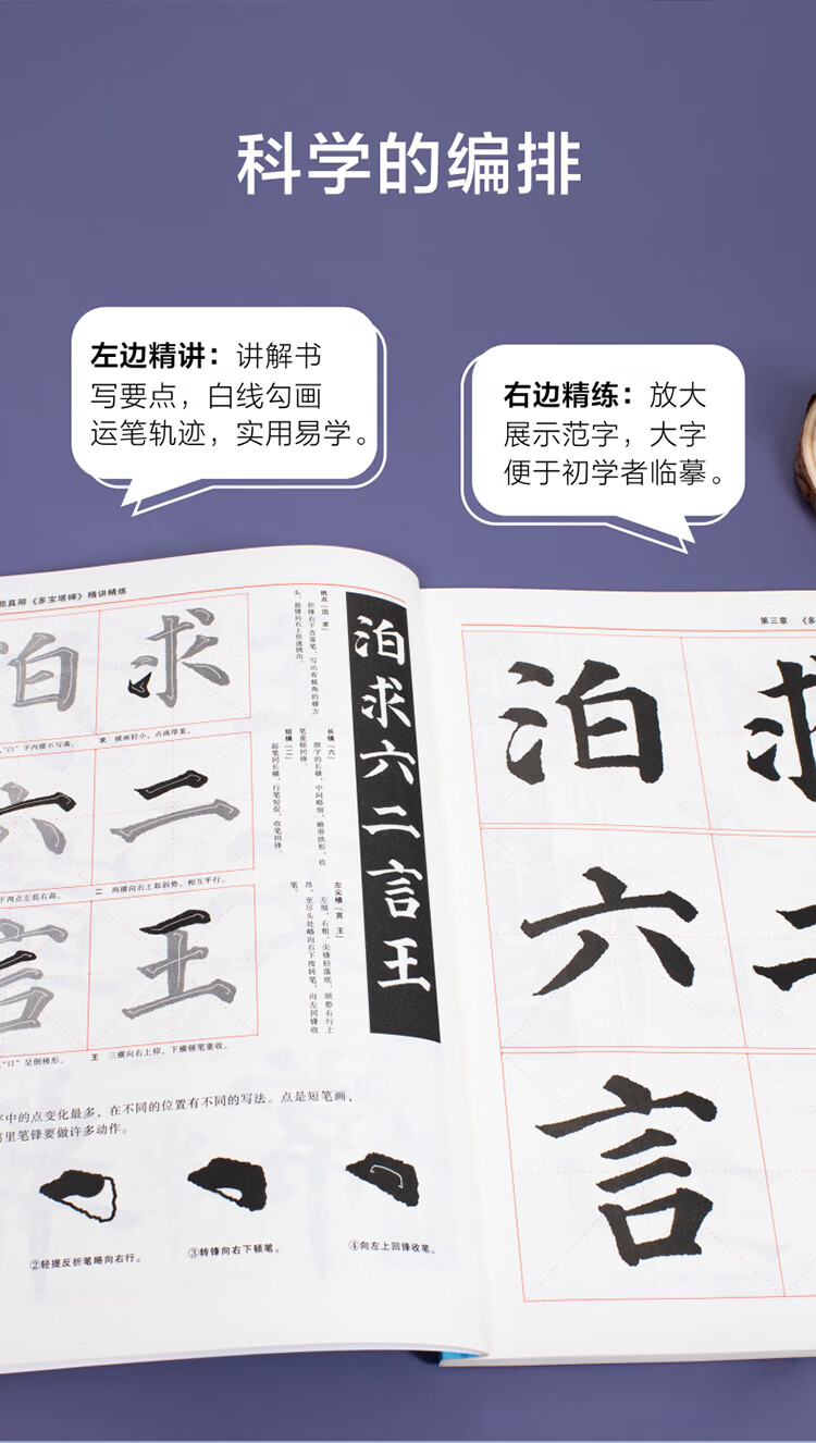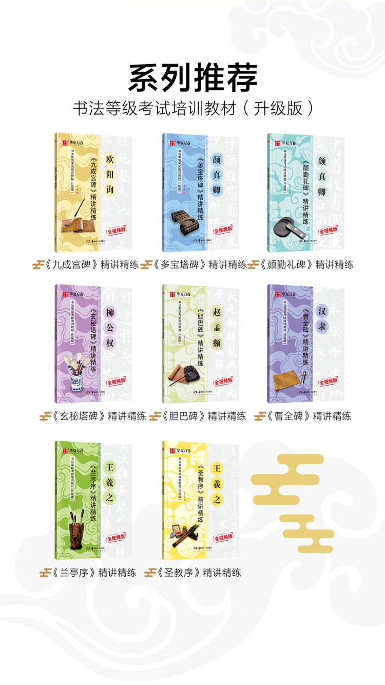 《精讲精练》丛书分为《欧阳询〈九成宫碑〉精讲精练》《颜真卿〈多宝塔碑〉精讲精练》《颜真卿〈颜勤礼碑〉精讲精练》《柳公权〈玄秘塔碑〉精讲精练》《赵孟頫 〈胆巴碑〉精讲精练》《王羲之〈兰亭序〉精讲精练》《王羲之〈圣教序〉精讲精练》和《汉隶〈曹全碑〉精讲精练》八册。本丛书将碑帖范字还原成墨迹,使其更接近书法大家的真迹,同时进行适度放大并辅以米字格定位,在笔画中用白细线勾画其运笔方法,更辅以逐字视频教学,这是本丛书的一大特点。这种直观明了的呈现方式,使学书者更容易领悟书体特点,以提高书法基础训练的效果。
