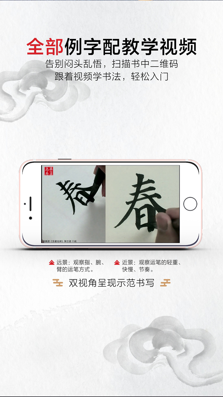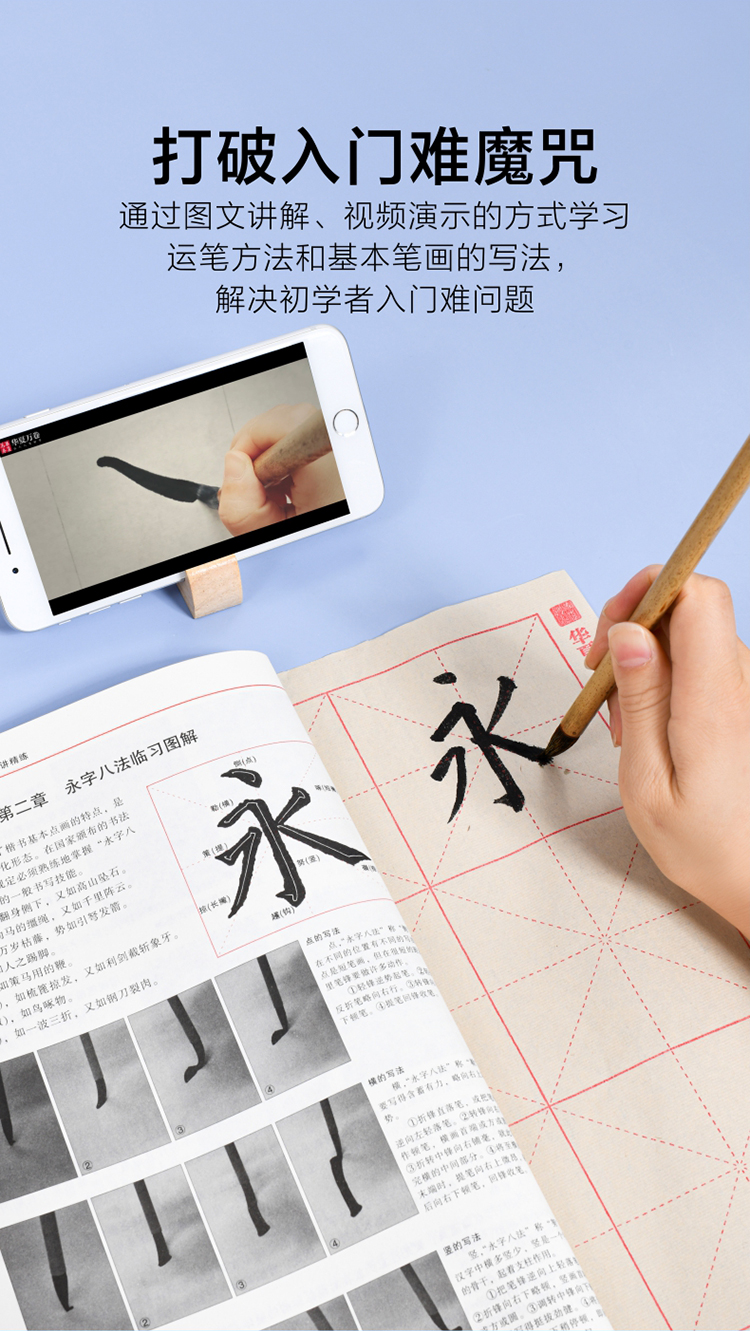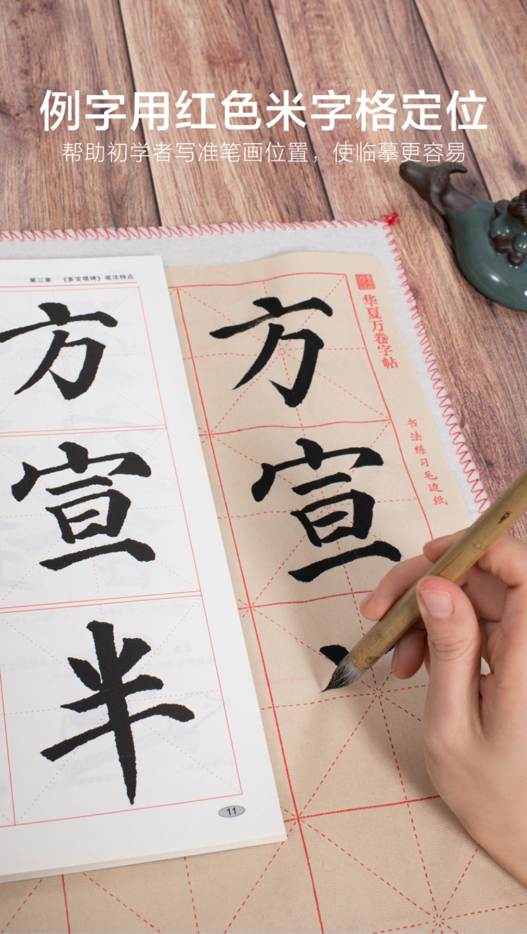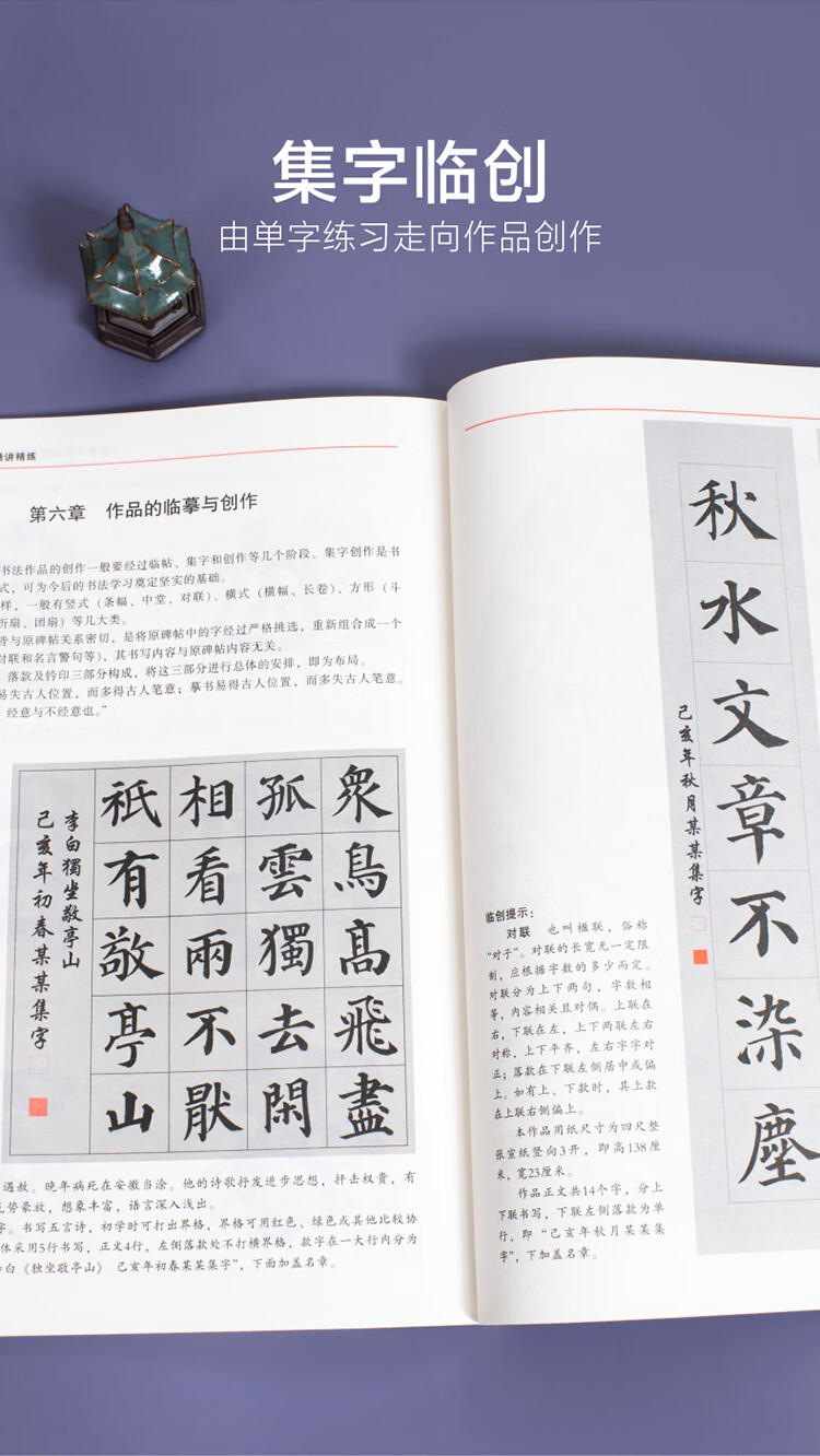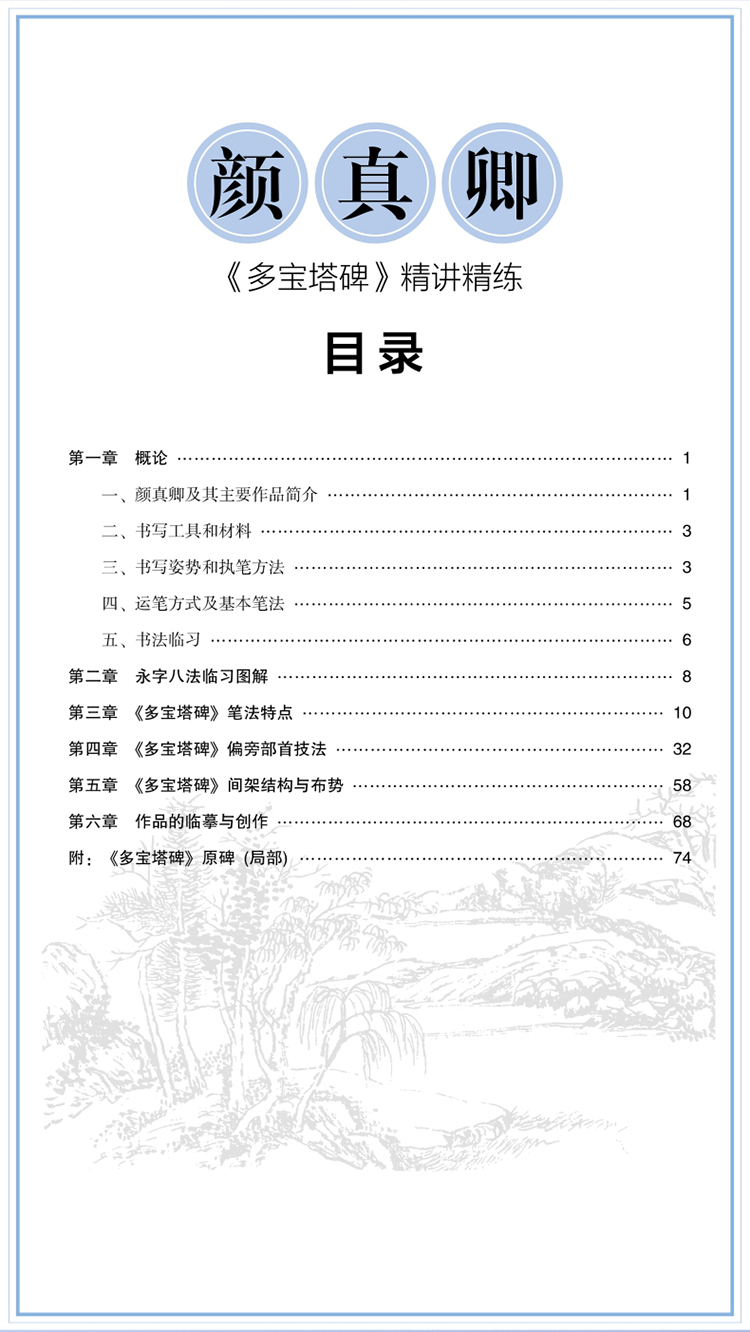 《精讲精练》丛书分为《欧阳询〈九成宫碑〉精讲精练》《颜真卿〈多宝塔碑〉精讲精练》《颜真卿〈颜勤礼碑〉精讲精练》《柳公权〈玄秘塔碑〉精讲精练》《赵孟頫 〈胆巴碑〉精讲精练》《王羲之〈兰亭序〉精讲精练》《王羲之〈圣教序〉精讲精练》和《汉隶〈曹全碑〉精讲精练》八册。本丛书将碑帖范字还原成墨迹,使其更接近书法大家的真迹,同时进行适度放大并辅以米字格定位,在笔画中用白细线勾画其运笔方法,更辅以逐字视频教学,这是本丛书的一大特点。这种直观明了的呈现方式,使学书者更容易领悟书体特点,以提高书法基础训练的效果。