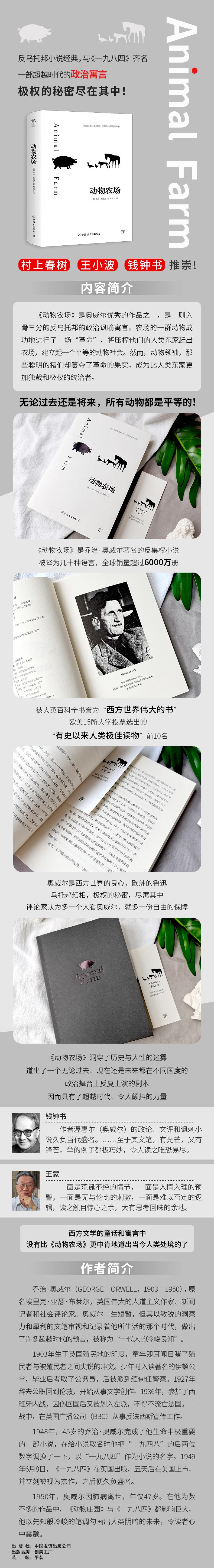 "1.反乌托邦小说经典,《一九八四》齐名。一部超越时代的政治寓言,极权的秘密尽在其中!无论过去还是将来,所有动物都是平等的。 2.《动物农场》是乔治.奥威尔著名的反集权小说,被译为几十种语言,全球销量超过6000万册。 3.被大英百科全书誉为“西方世界伟大的书”,欧美15所大学投票选出的“有史以来人类不错读物”前10名。 4.奥威尔是西方世界的良心,欧洲的鲁迅。乌托邦幻相,极权的秘密,尽寓其中。评论家认为多一个人看奥威尔,就多一份自由的保障! 5.《动物农场》洞穿了历史与人性的迷雾,道出了一个无论过去、现在还是未来都在不同国度的政治舞台上反复上演的剧本,因而具有了超越时代、令人颤抖的力量。 6.西方文学的童话和寓言中,没有比《动物农场》更中肯地道出当今人类处境的了。 "