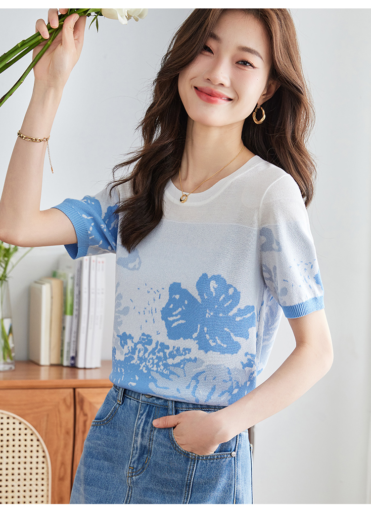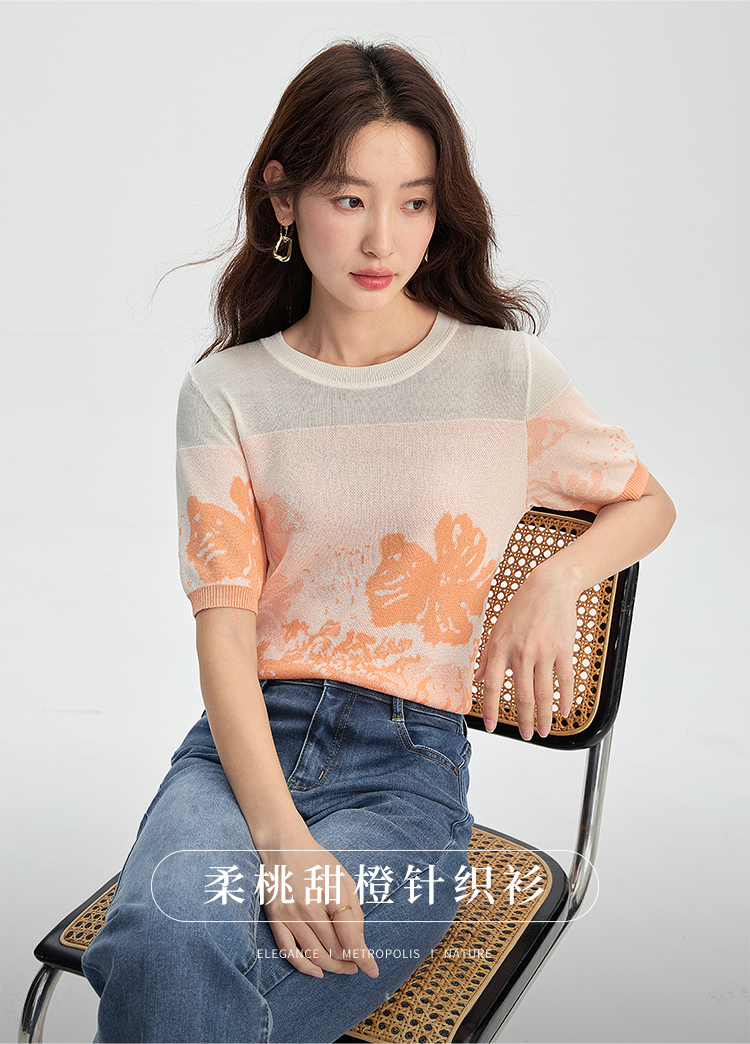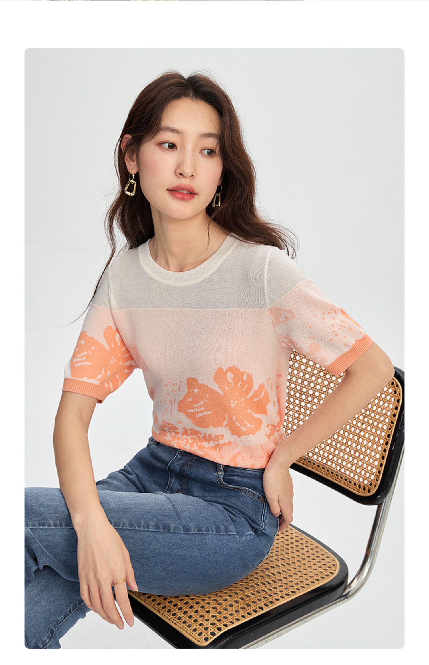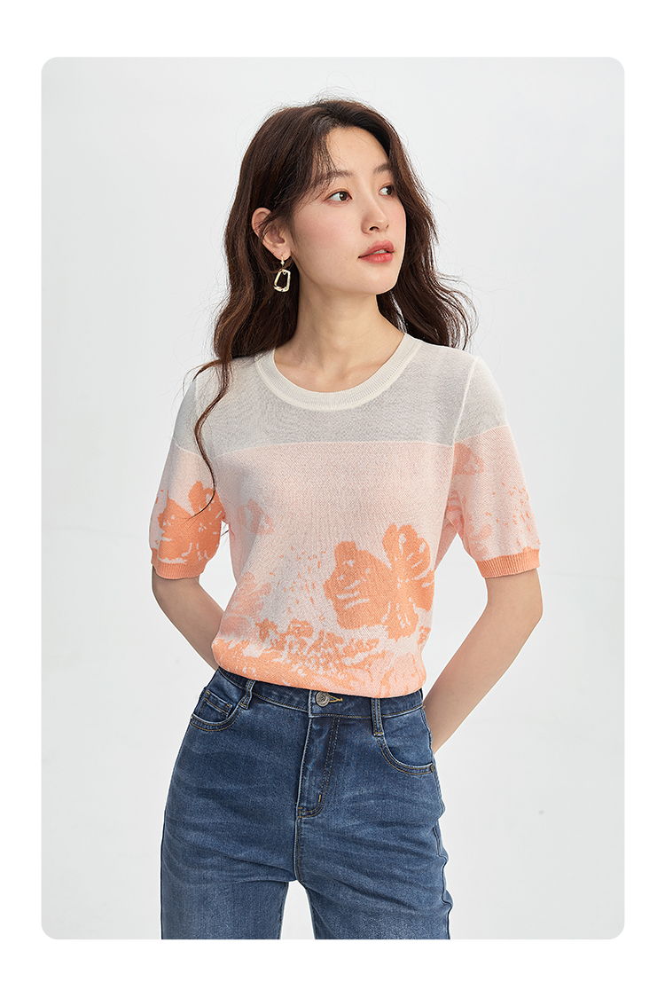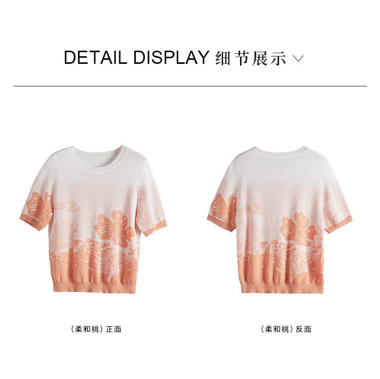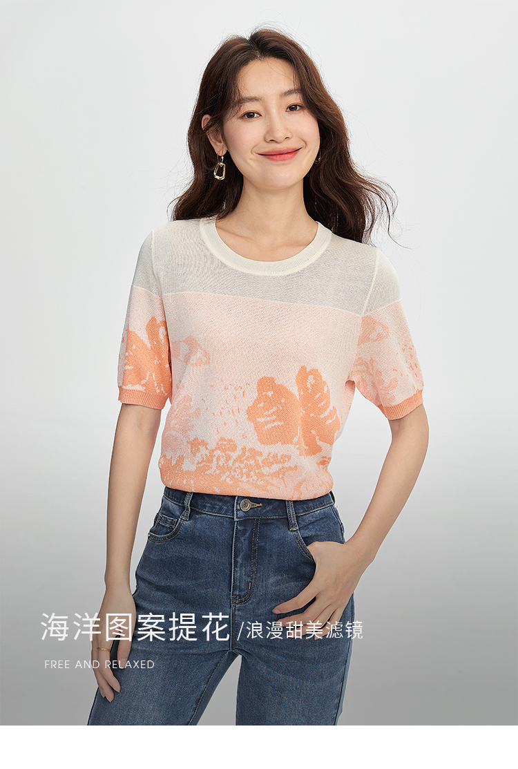 【专属特价】熙世界薄款冰丝针织衫T恤女短袖2025夏新款温柔甜美风提花上衣