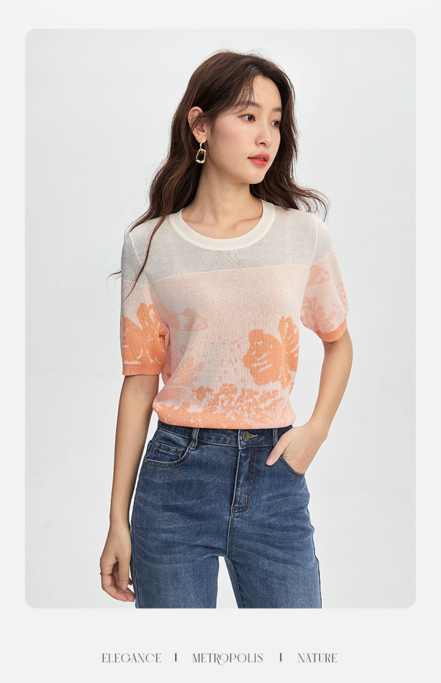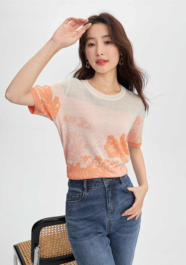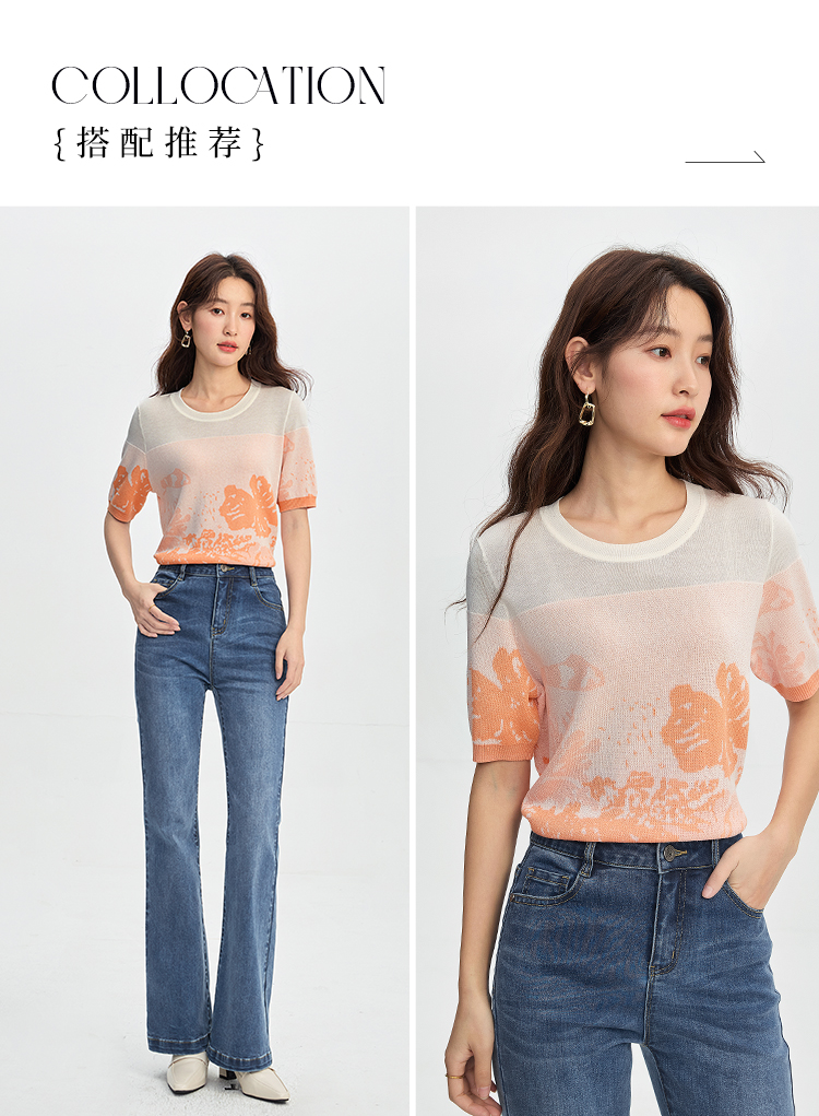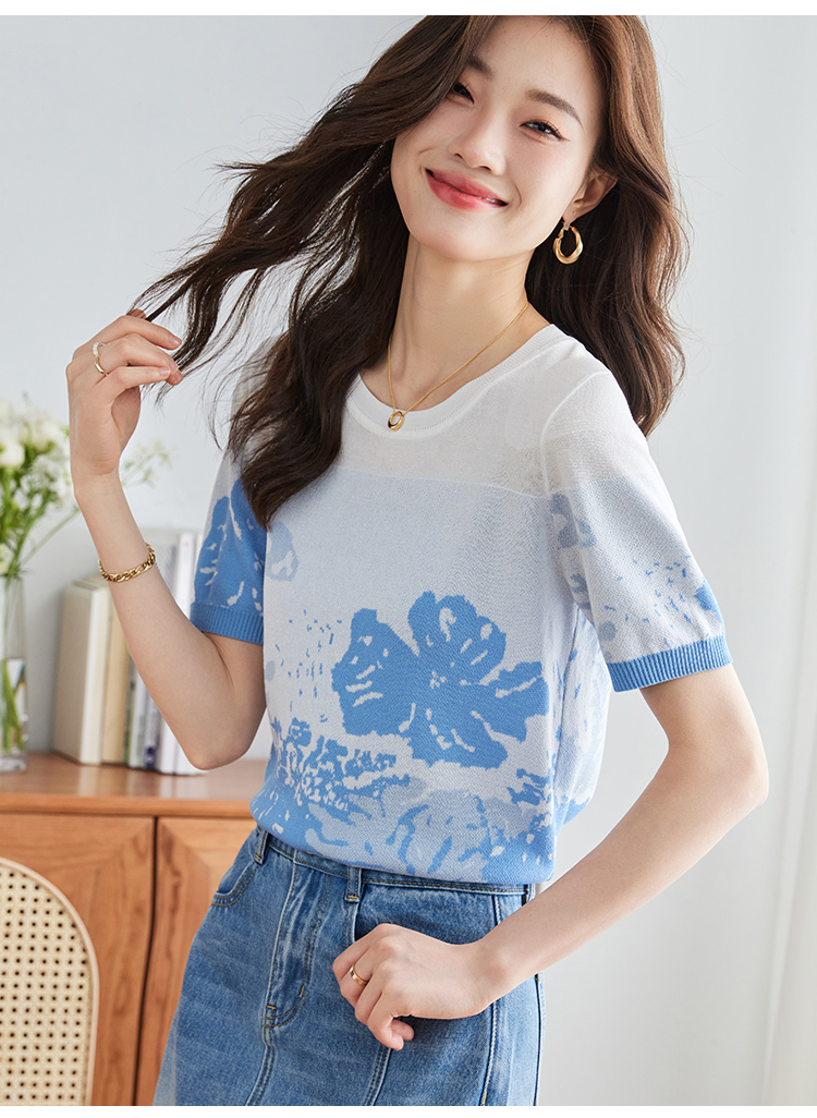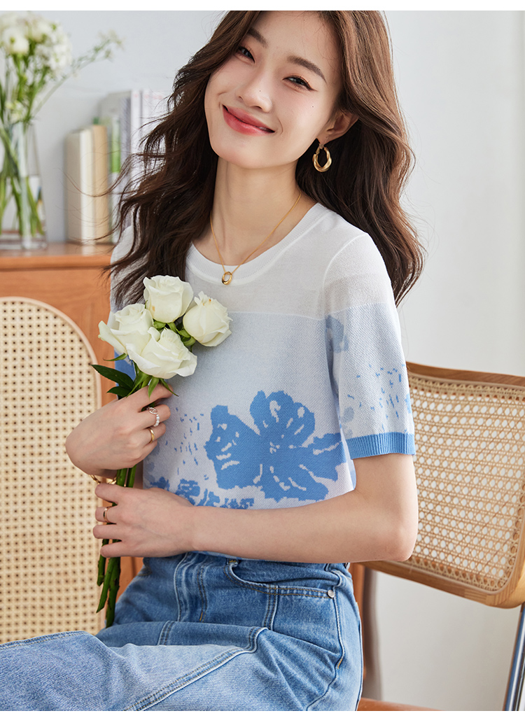 【专属特价】熙世界薄款冰丝针织衫T恤女短袖2025夏新款温柔甜美风提花上衣