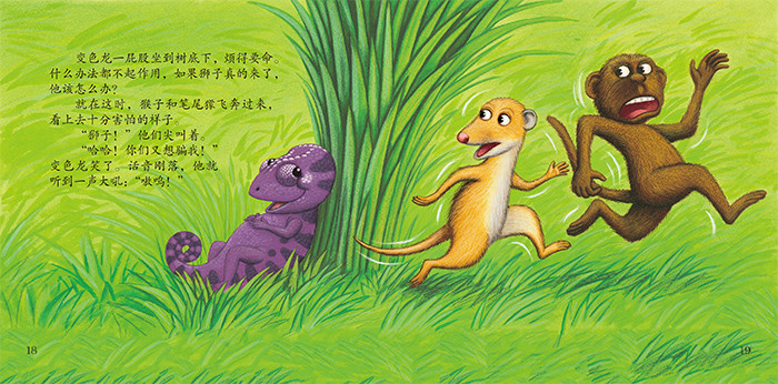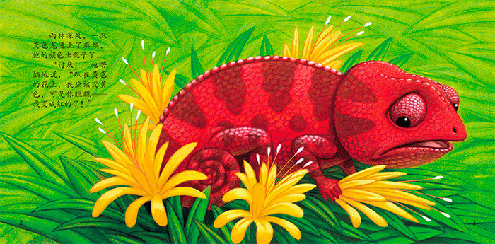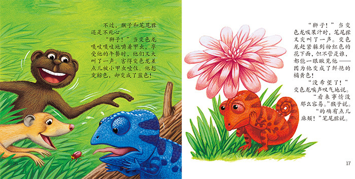 一只变色龙遇上了麻烦,因为他的颜色出了乱子。他趴在黄花上,本该变黄色,却变得红艳艳;跳到石头上,本该变灰色,可却变成了蓝色带粉点儿;走到草丛中,本该变绿色,可却变成了橘黄色……全错了,真是乱七八糟的!猴子和笔尾獴说,别担心,我们来帮忙。嗷呜,那边来了大狮子,变色龙该怎么办?他能成功脱险吗?