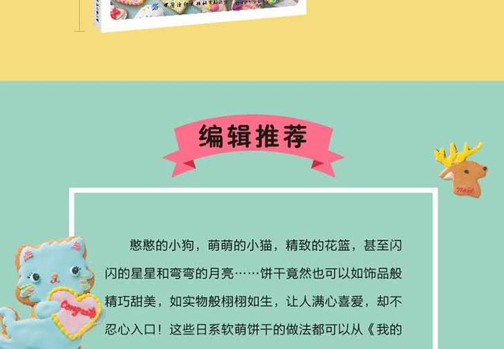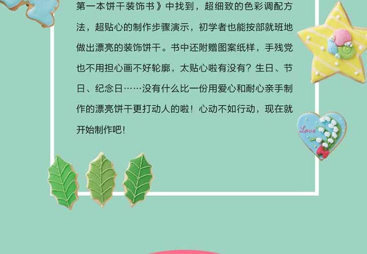 憨憨的小狗,萌萌的小猫,精致的花篮,甚至闪闪的星星和弯弯的月亮……饼干竟然也可以如饰品般精巧甜美,如实物般栩栩如生,让人满心喜爱,却不忍心入口!这些日系软萌饼干的做法都可以从这本饼干装饰书中找到,超细致的色彩调配方法,超贴心的制作步骤演示,初学者也能按部就班地做出漂亮的装饰饼干。书中还附赠图案纸样,手残党也不用担心画不好轮廓,太贴心啦有没有?生日、节日、纪念日……没有什么比一份用爱心和耐心亲手制作的漂亮饼干更打动人的啦!心动不如行动,现在就开始制作吧!