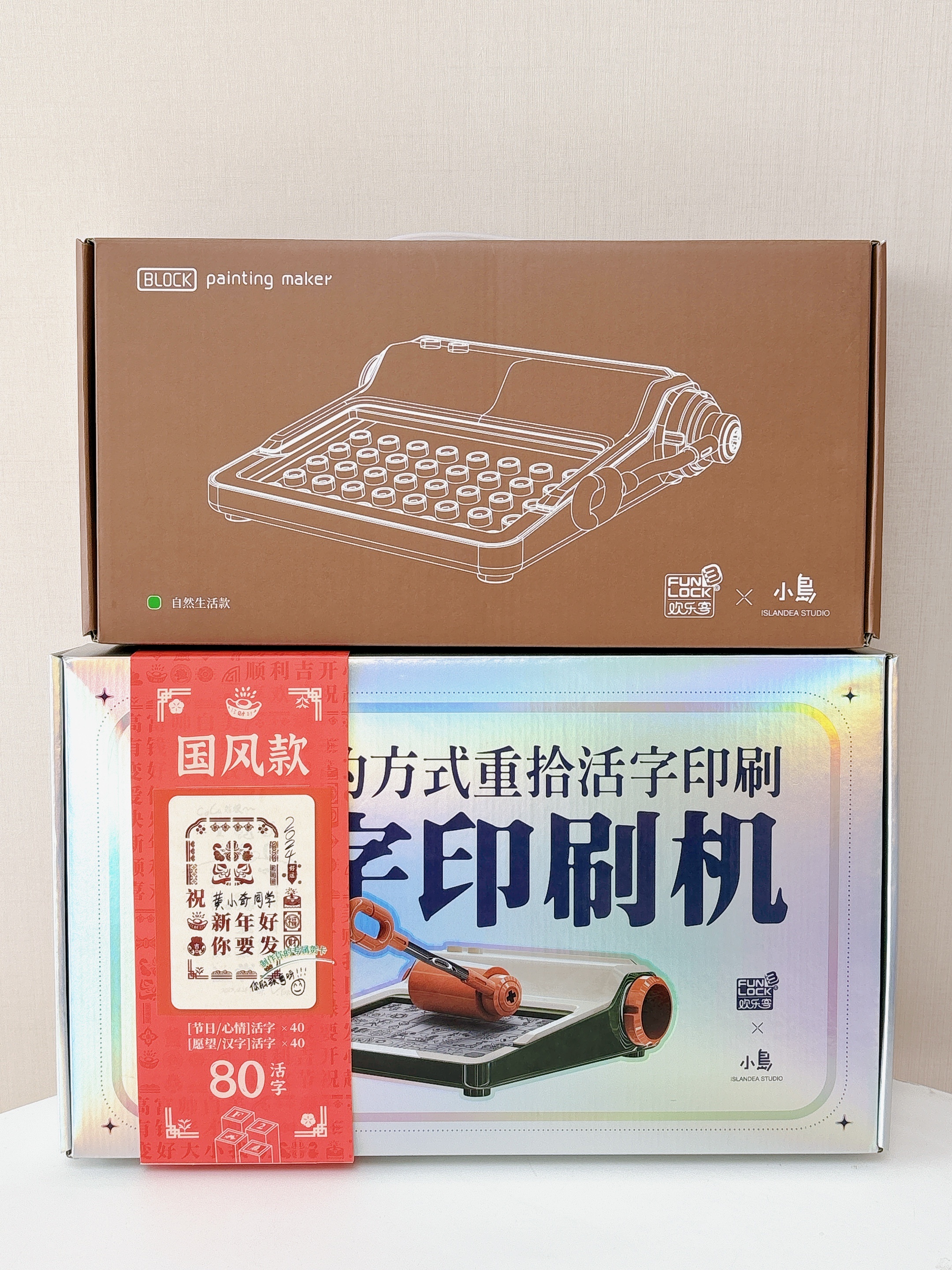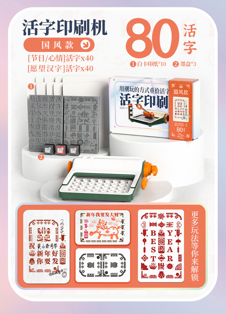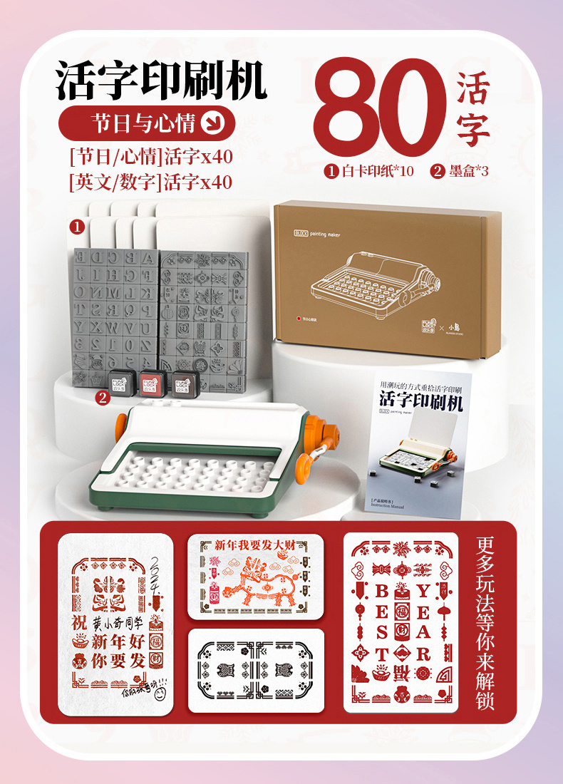 2套活字(节日心情活字x40和愿望汉字活字x40)+墨盒(3盒)+白卡纸10张