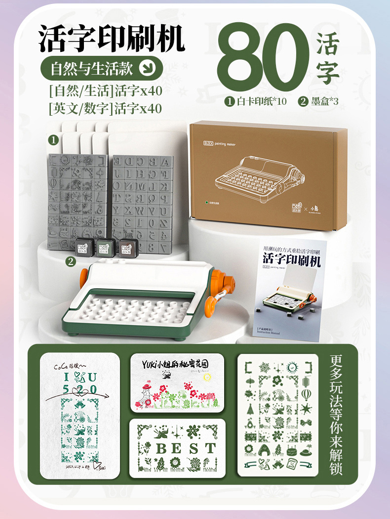 2套活字(自然生活活字x40和字母数字活字x40)+墨盒(3盒)+白卡纸10张