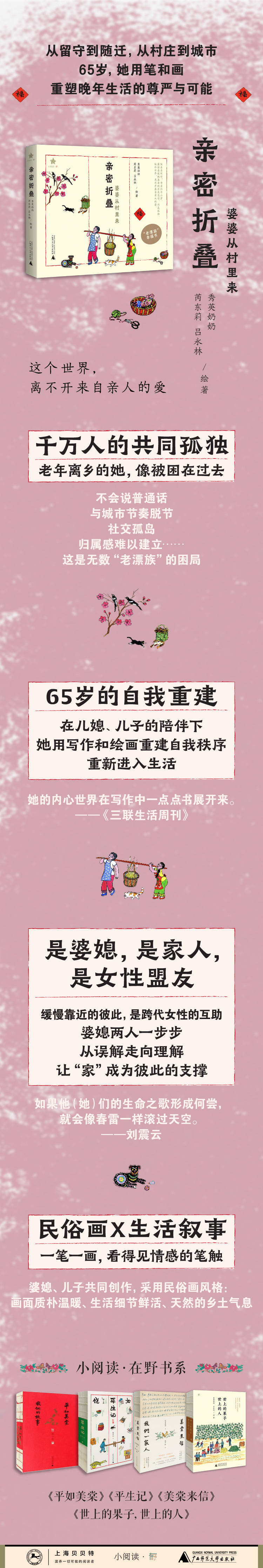 本书由婆媳与儿子三人共同绘著,以民俗画与文字记录日常的好气好笑与相互靠近,为家庭叙事提供了质朴而独特的表达方式。