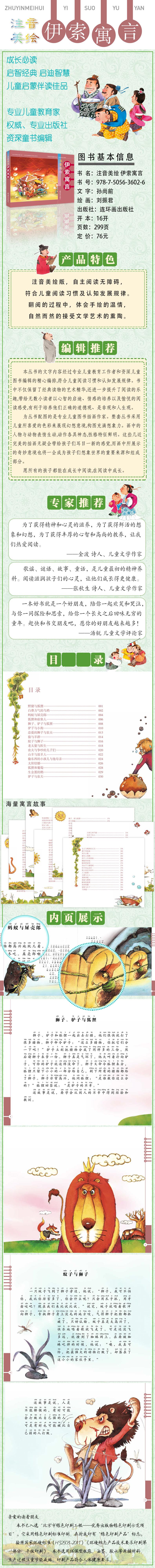 那些经过历史选择出来的、经久不衰的、很具代表性的、很能表现文称为经典。 注音美绘系列就是这样一套经典,一套专为孩子的成长而精心编著的经典阅读丛书。丛书包括《谜语300首》《童谣300首》《儿歌300首》《唐诗300首》《365夜故事》《伊索寓言》《一千零一夜》《格林童话》《安徒生童话》及《成语故事》(2册)共11册。这些流传许久的经典读物对孩子们仍然有极大的吸引力。作品中引人入胜的语言和情节诠释出巧妙的智慧,精致漂亮的图画展现出神奇的世界。孩子们在阅读过程中既能接受到文学艺术的熏陶,又能感受到绘画艺术的美妙。 本丛书的文字内容经过专业儿童教育工作者和资深儿童图书编辑的精心编排,符合儿童阅读习惯和认知发展规律。书中不仅保留了经典读物的艺术精华,还进一步提升了阅读的乐趣,带给无数小读者以心智的启迪、情感的培养以及愉悦的阅读感受,有利于培养他们正确的道德观、是非观和人生观。 为丛书配图的是......