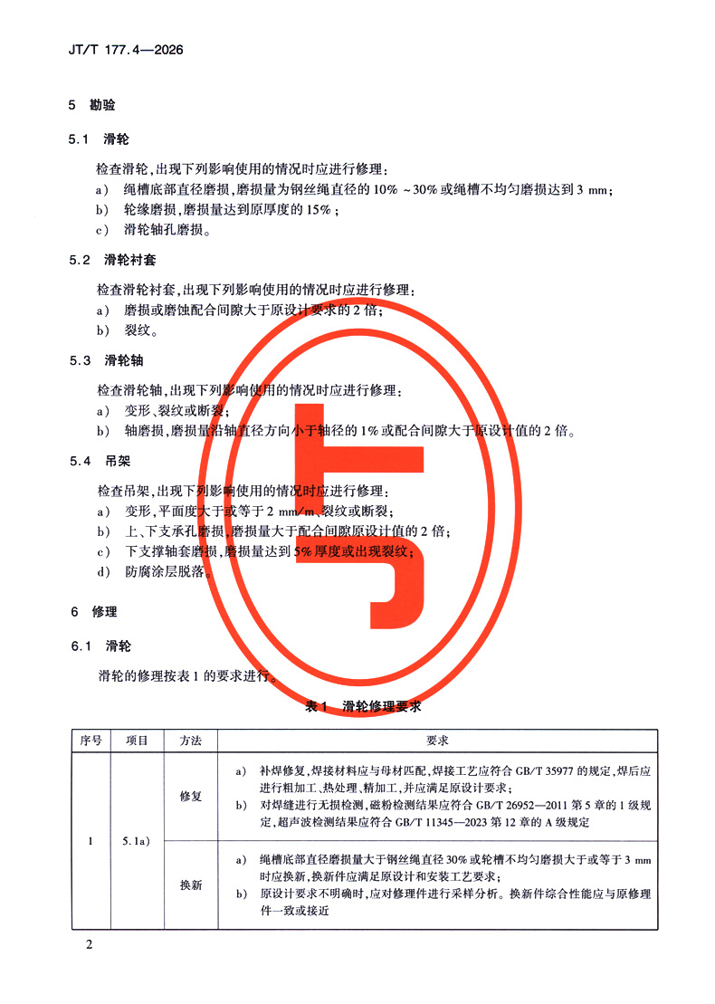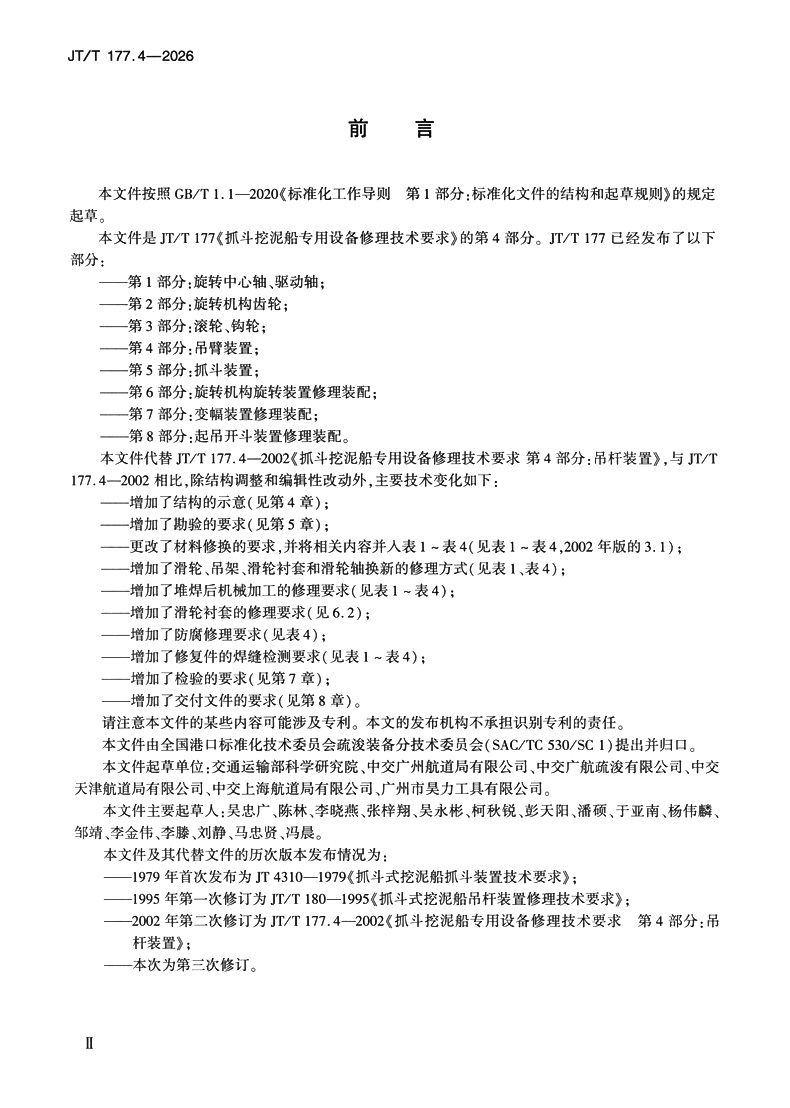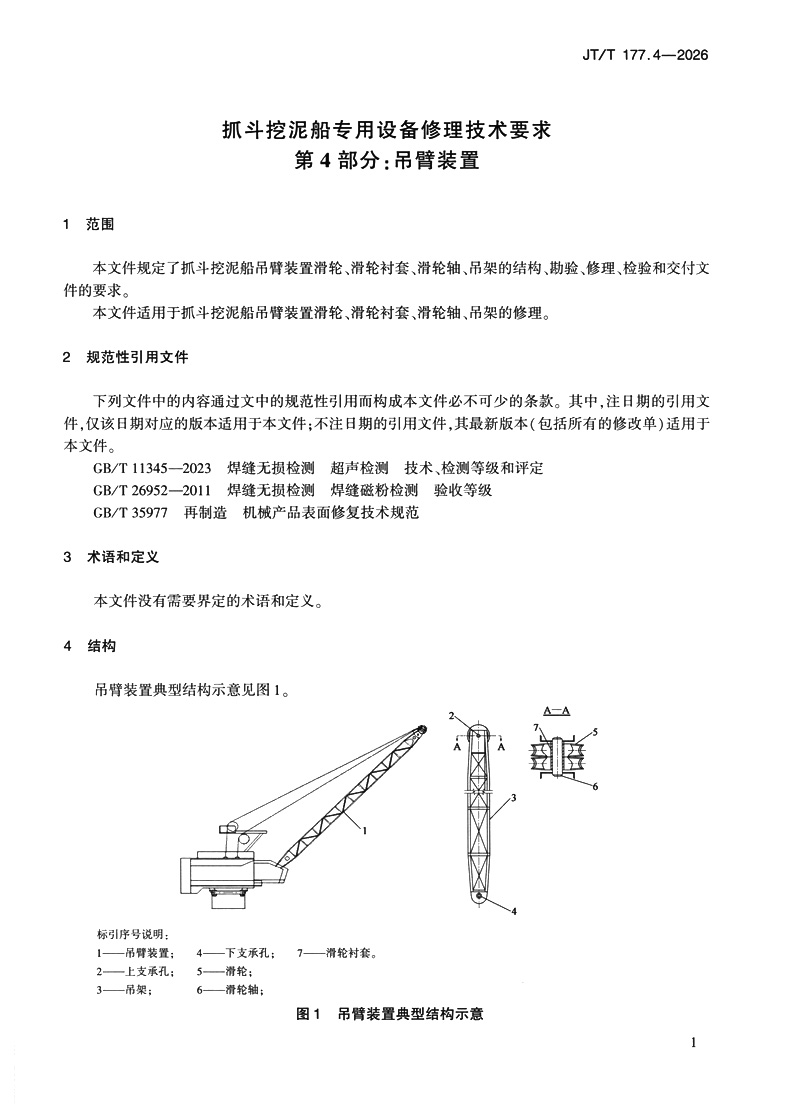 书名:抓斗挖泥船专用设备修理技术要求 第4部分:吊臂装置(JT/T 177.4—2026)