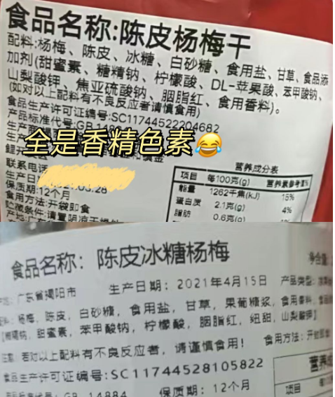 市面上的杨梅干大多都属于添加剂超量的,看看配料表,香精、甜蜜素、防腐剂各种乱七八糟的一大堆。