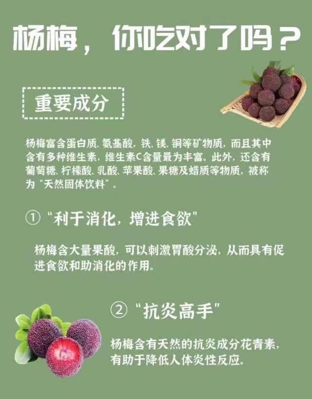 新鲜杨梅性温、甘酸,具有止咳、活血、消痰等作用。